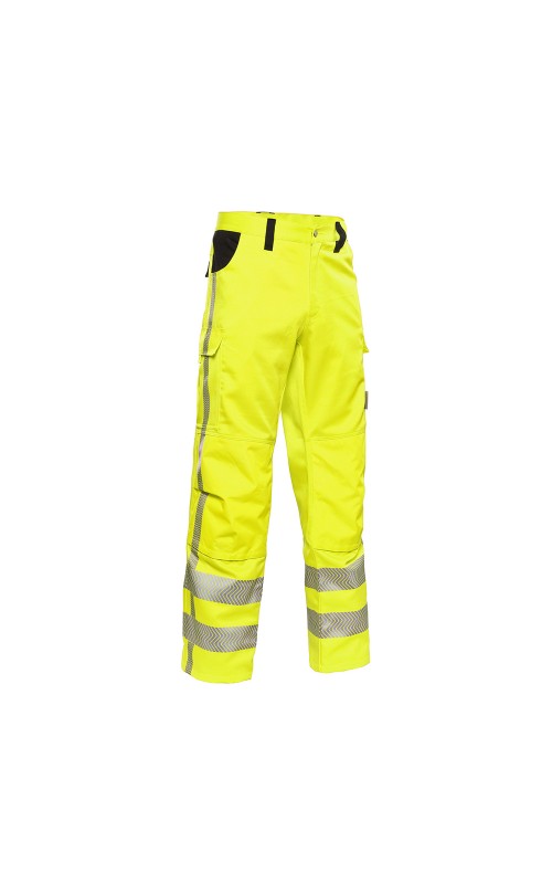 Fluoriserend veiligheids broek uit de Santino HiVis-Line, in een comfortabele Twill kwaliteit, 80% polyester/20% katoen, 280 gr/m², unisex, gecertificeerd conform EN ISO 13688 en EN ISO 20471 klasse 2/3, 3M Scotchlite reflectie tape is horizontaal en verticaal in RWS configuratie gesealed.