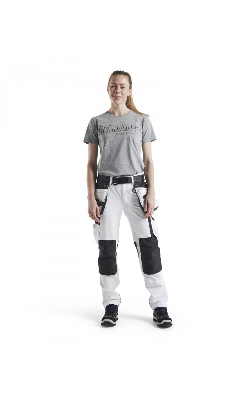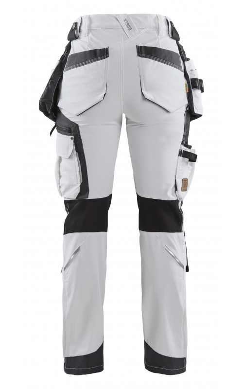 Deze soepele en comfortabele schildersbroek met damespasvorm en toelopende broekspijpen biedt bewegingsvrijheid en is extreem zacht. Gemaakt om zware klussen aan te kunnen, zonder afbreuk te doen aan comfort en pasvorm. Het materiaal is een soepele 4-weg stretchstof die sterk en rekbaar is in alle richtingen. De broek heeft geavanceerde details, speciaal ontworpen zakken voor kwasten, plamuurmes en voorzien van losse spijkerzakken. De kniezakken zijn versterkt met CORDURA®-stretchstof aan de buitenzijde en stretchstof aan de binnenkant voor meer bewegingsvrijheid. Zachte, elastische mesh-stof in de knieholte voor goede ventilatie. Broekspijp openingen versterkt aan achterkant voor effectieve bescherming tegen slijtage. Ook verkrijgbaar in herenmodel 1079.