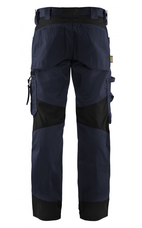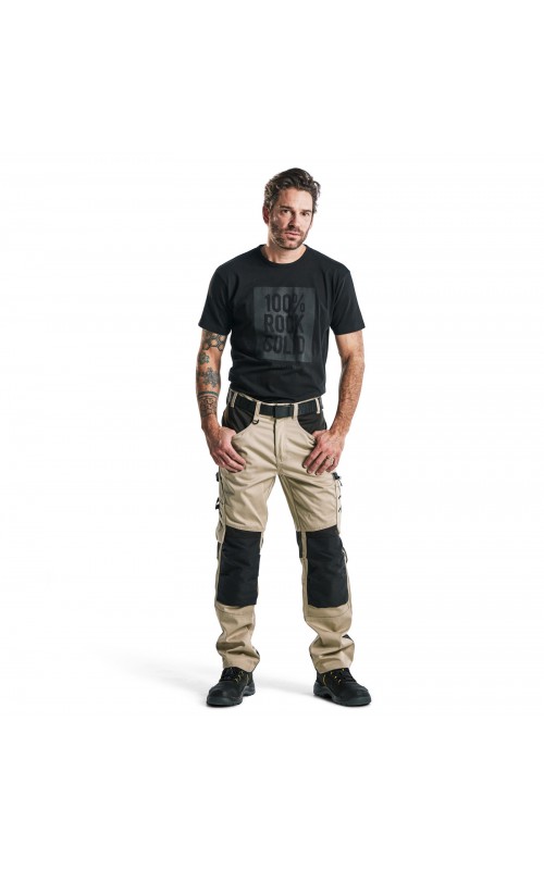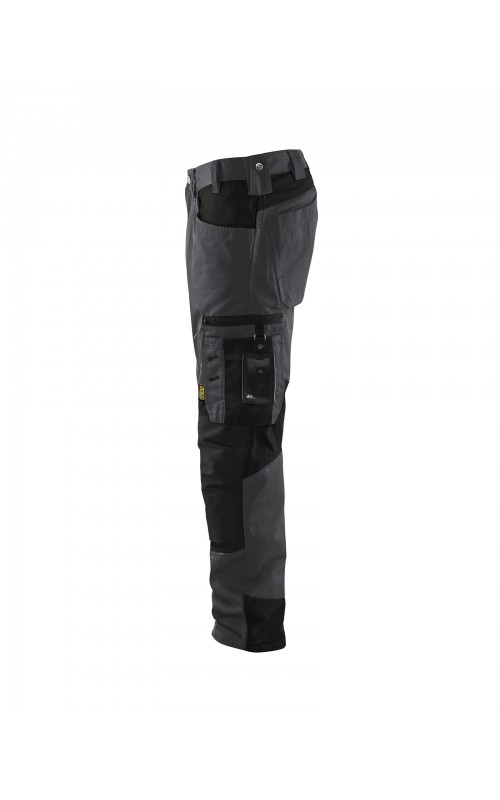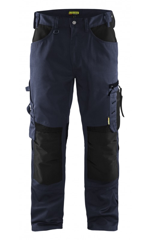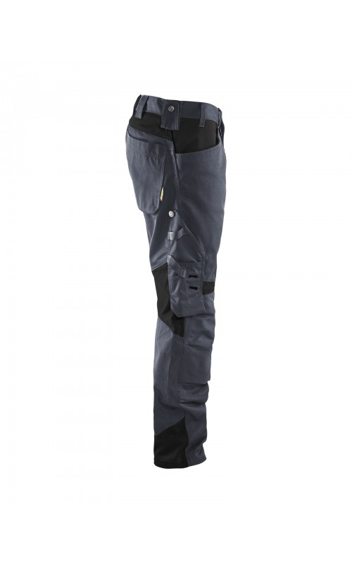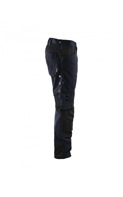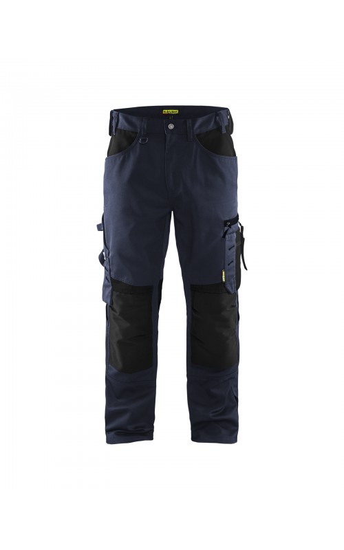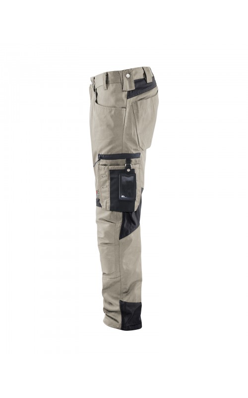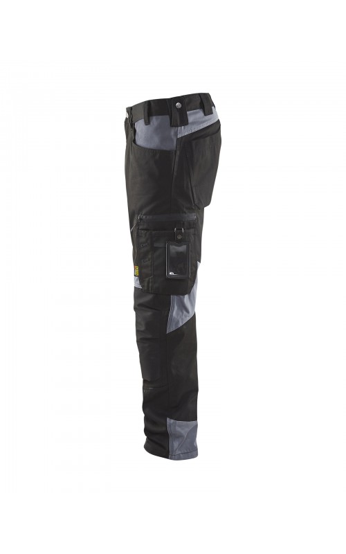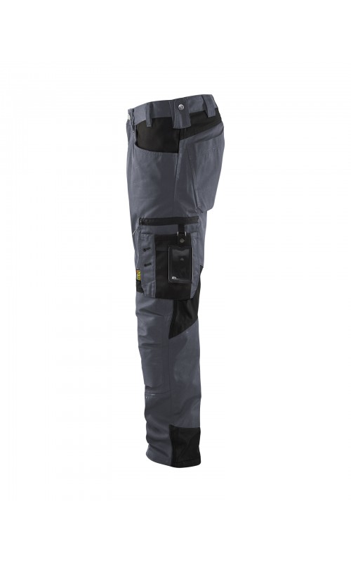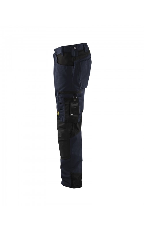 Functionele en comfortabele werkbroek met eenvoudig te bereiken zakken, zoals een telefoonzak in stretchmateriaal waar de meeste mobiele telefoons inpassen. Kniebeschermerszakken van CORDURA® stretch voor optimale pasvorm en duurzaamheid. Twee achterzakken met plooi en hamerlus, een versterkte duimstokzak, pennenzak en meshouder. Voorgevormde broekspijpen zorgen voor een uitstekende pasvorm.