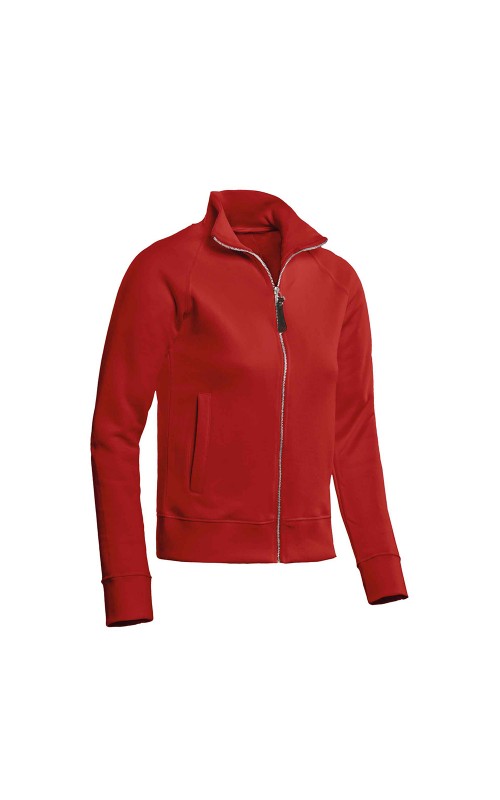 Dames full zip sweatjack, 280 gr/m², 50% katoen, 50% polyester. Binnenzijde geruwd, ladies fit, raglan mouw, doorritsbaar middels metalen rits, twee steekzakken, kraag, tailleband en manchetten met elastaan.