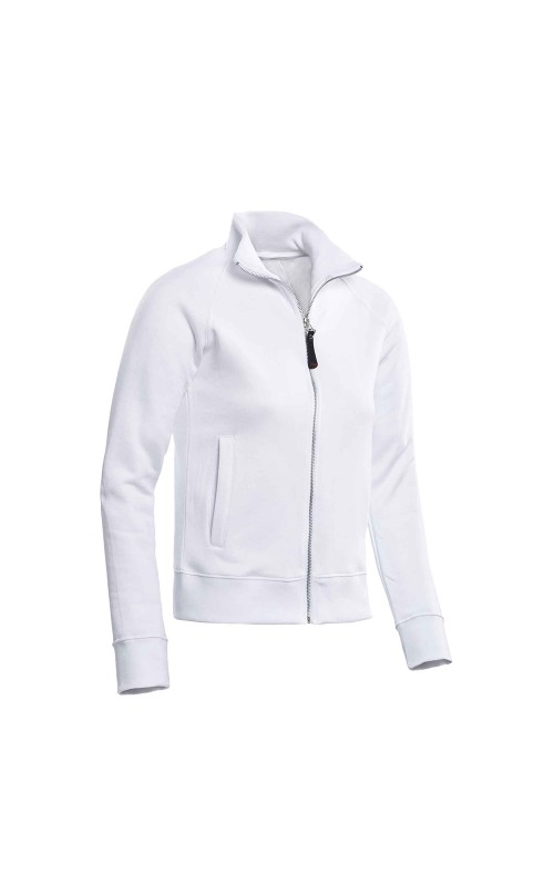 Dames full zip sweatjack, 280 gr/m², 50% katoen, 50% polyester. Binnenzijde geruwd, ladies fit, raglan mouw, doorritsbaar middels metalen rits, twee steekzakken, kraag, tailleband en manchetten met elastaan.