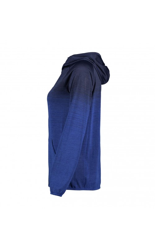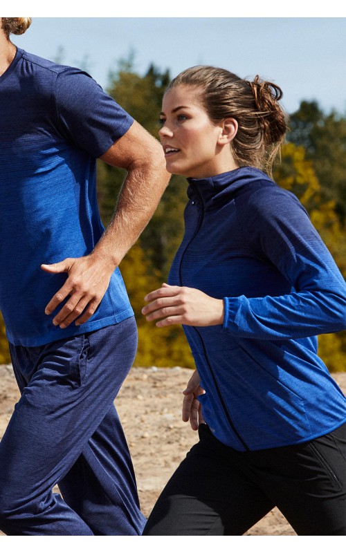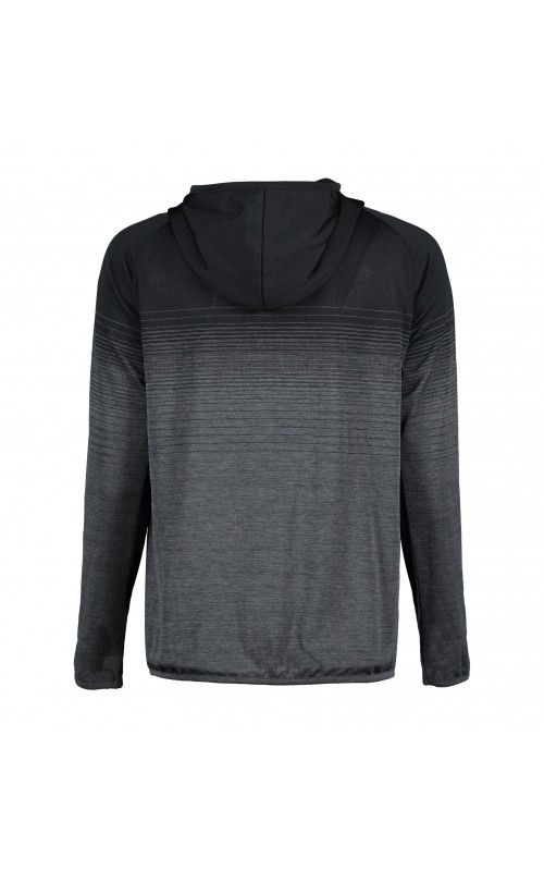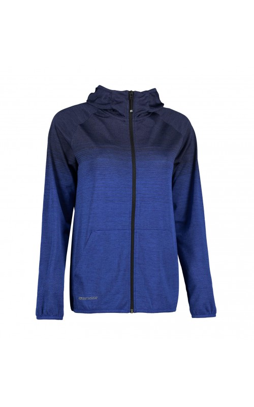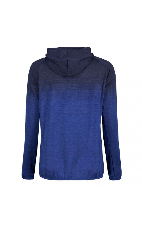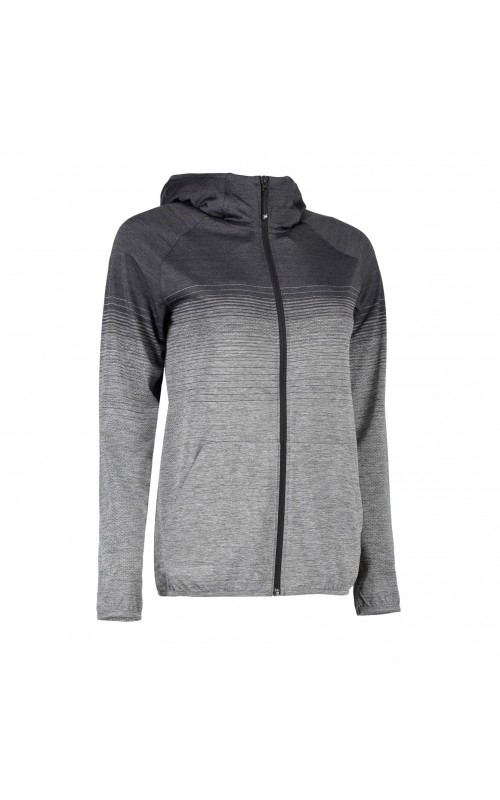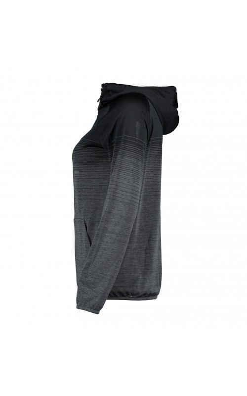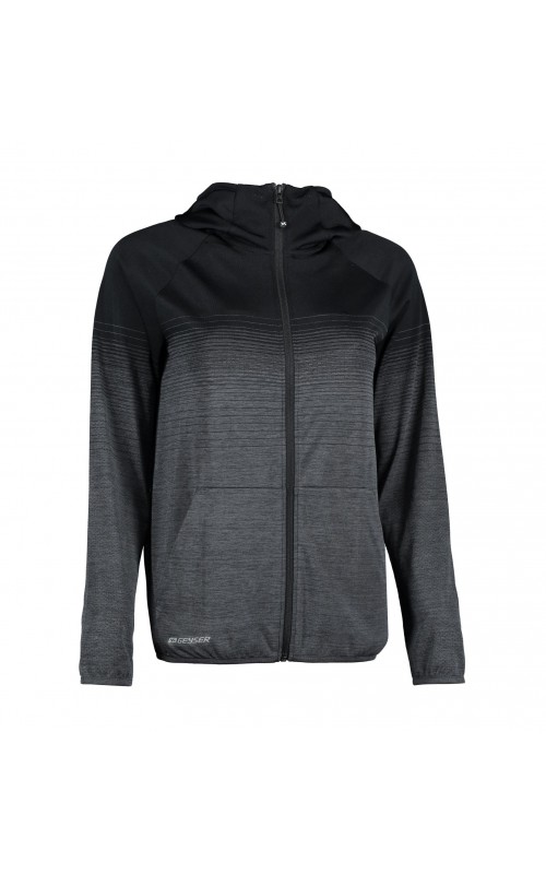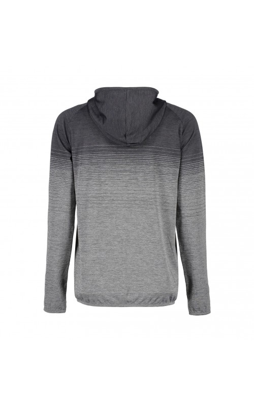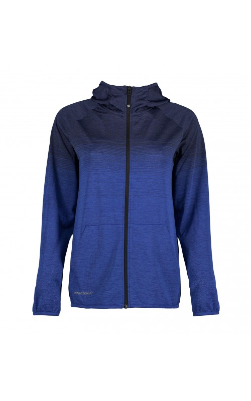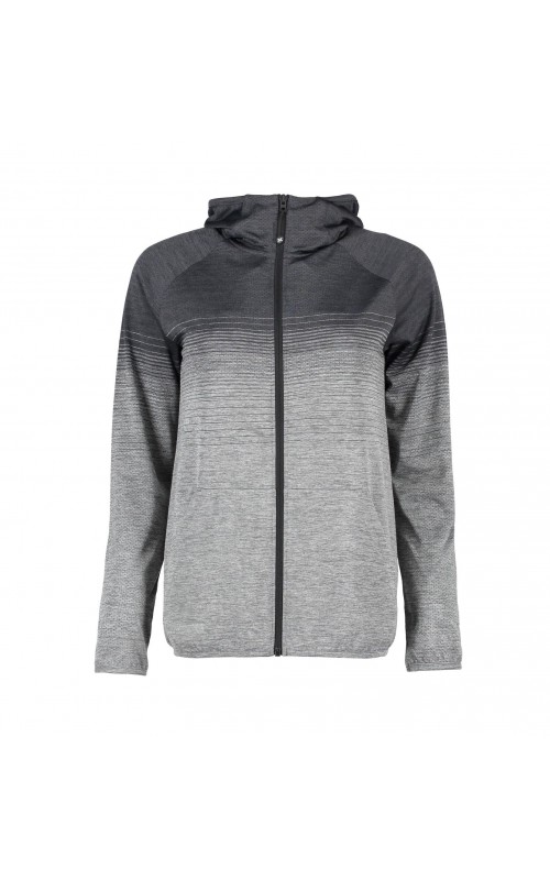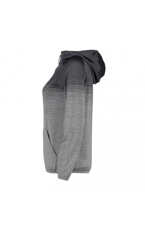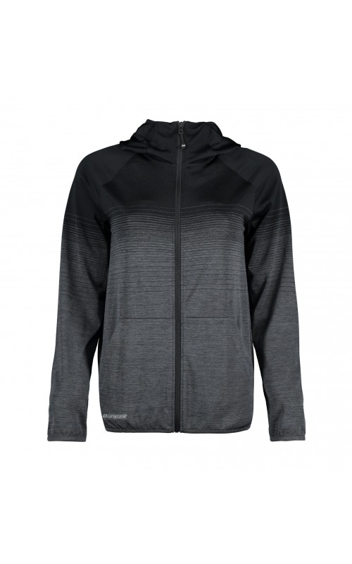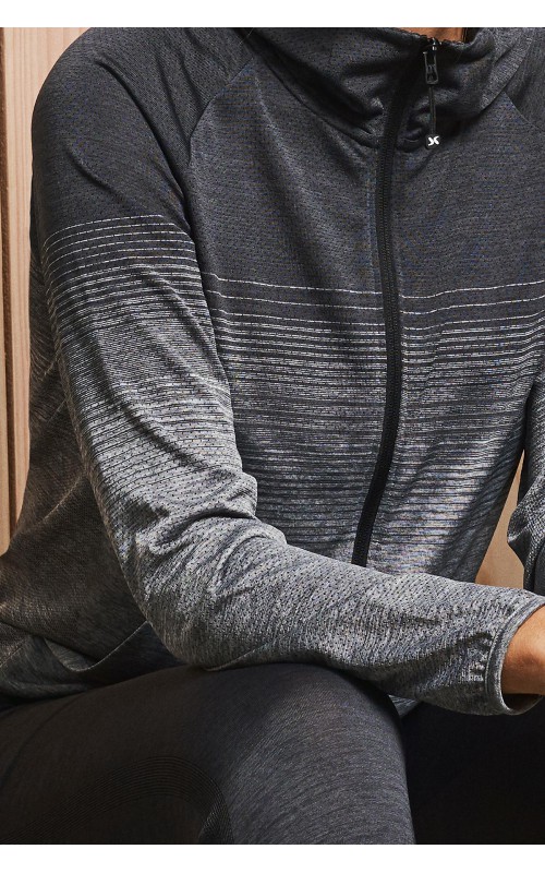 Striped hooded cardigan in two colours with large kangaroo pockets. Can be used for everyday wear or sport. The cardigan has a well-fitting, seamless design that ensures high comfort. The material is lightweight, soft and permanently moisture transmitting and quick-drying. Specially knitted ventilation areas provide optimum breathability.