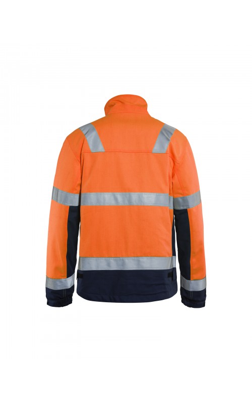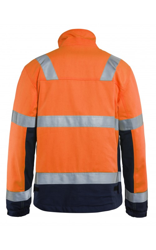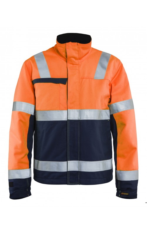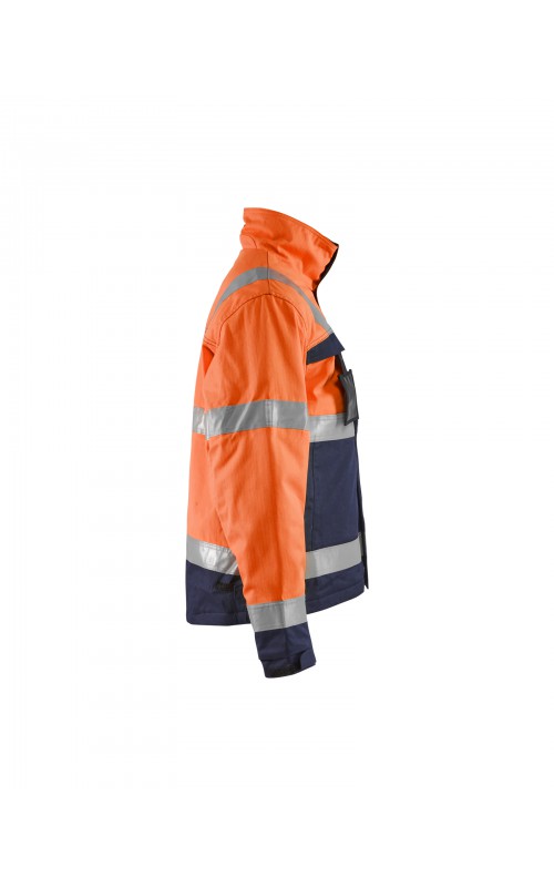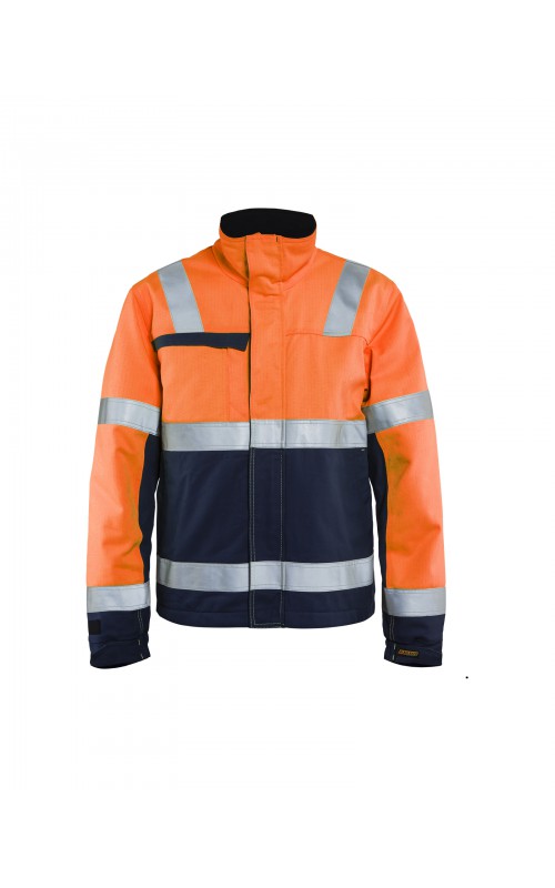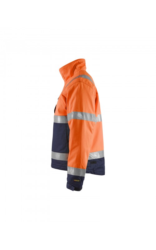 High Vis oranje multinorm-winterjas met gewatteerde voering en een duurzame shell buitenlaag met water- en vuilafstotende eigenschappen. Donkere kleur op de plekken waar het kledingstuk het snelst vuil wordt. Voorzien van handige zakken zoals voorzakken, borstzak met ritssluiting, pennenzak, telefoonzak en binnenzak met klittenbandsluiting. De jas kan aan de onderkant worden aangepast en heeft een langer achterpand om de onderrug warm te houden en te beschermen tegen de kou als je voorover buigt. Gecertificeerd volgens EN 1149-5, EN 342, EN 13034 PB [6]. EN ISO 20471, XS-L klasse 2, XL-> klasse 3. EN ISO 11611, klasse 1 A1 + A2. EN ISO 11612 A1, A2, B1, C1, E1, F1. IEC 61482-2, Klasse 2.