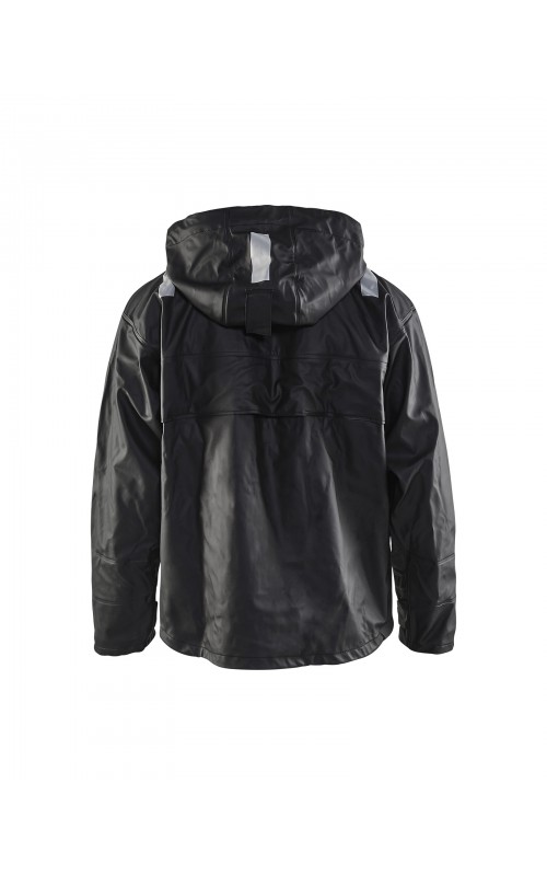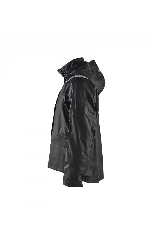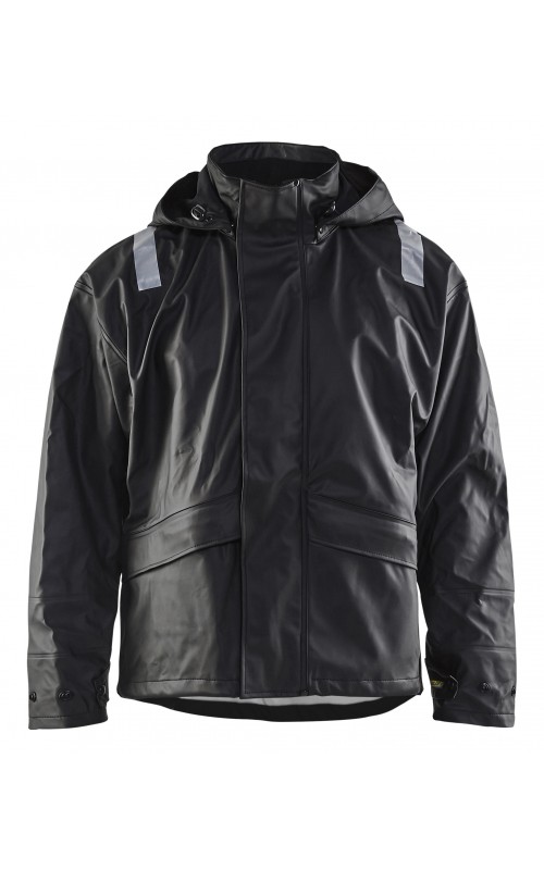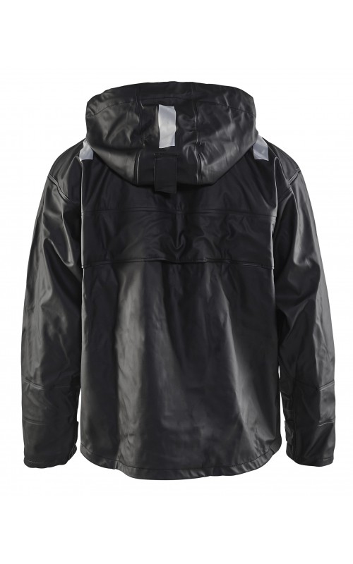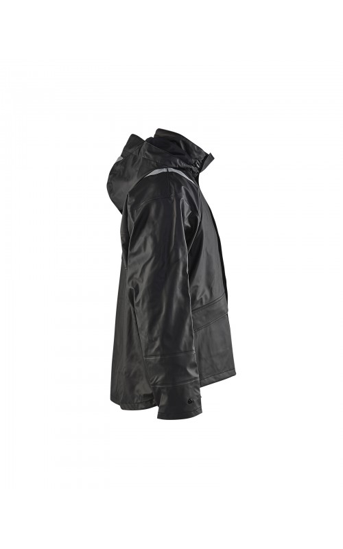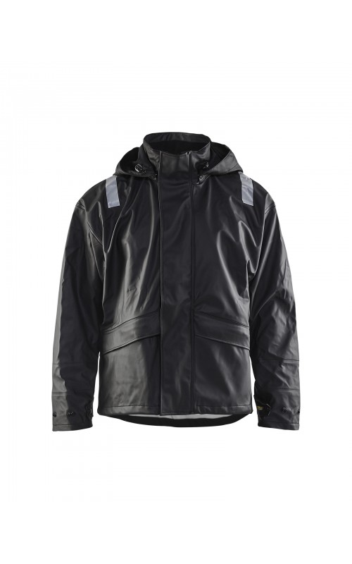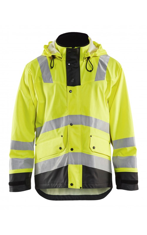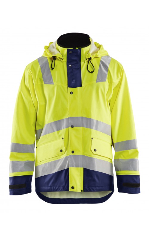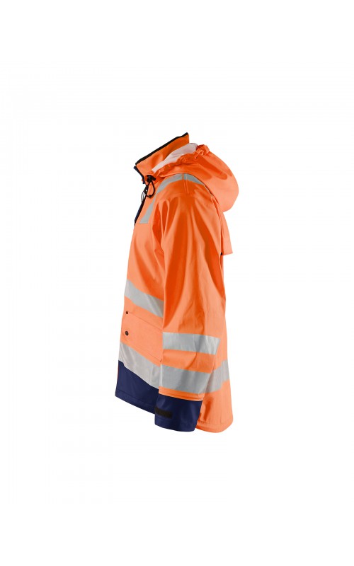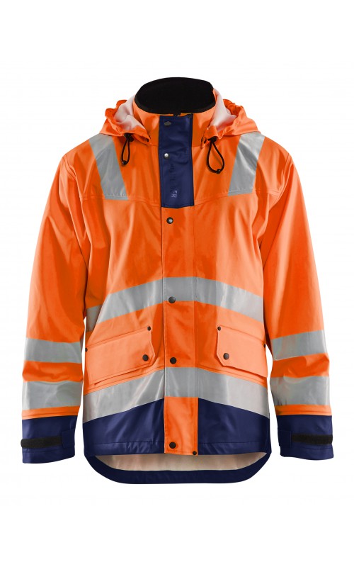 High Vis regenjas voor diegenen met werkzaamheden die sterke, duurzame maar soepele regenkleding nodig hebben. Gemaakt van sterk wind- en waterdicht materiaal met gelaste naden, ventilatie opening in rugpand en druppelgoot in de boord. De jas heeft een afneembare, verstelbare capuchon, zachte fleece gevoerde kraag en voorzien van eenvoudig toegankelijke voorzakken zoals grote voorzakken met klep en drukknoopsluiting en napoleonzak aan binnenkant. De sluiting is een sterke verborgen 2-weg ritssluiting tot in de kraag met daarover een stormsluiting met drukknopen. De jas heeft een goede pasvorm, verstelbare manchetten met klittenband en neopreen windvanger die het lichaam warm houdt, ook al is het nat. Gecertificeerd volgens EN 343, beschermende kleding tegen slecht weer en EN ISO 20471, Klasse 3, beschermende kleding met hoge zichtbaarheid. Kleuren #4600 armygroen #9900 en zwart zijn niet gecertificeerd volgens EN ISO 20471. Kleuren #4600 armygroen, #5300 oranje en #9900 zwart zijn geüpdatet. Oude model is leverbaar zolang de voorraad strekt. Voor geüpdatet model in kleuren #4600 armygroen en #9900 zwart, zie artikel 4305.