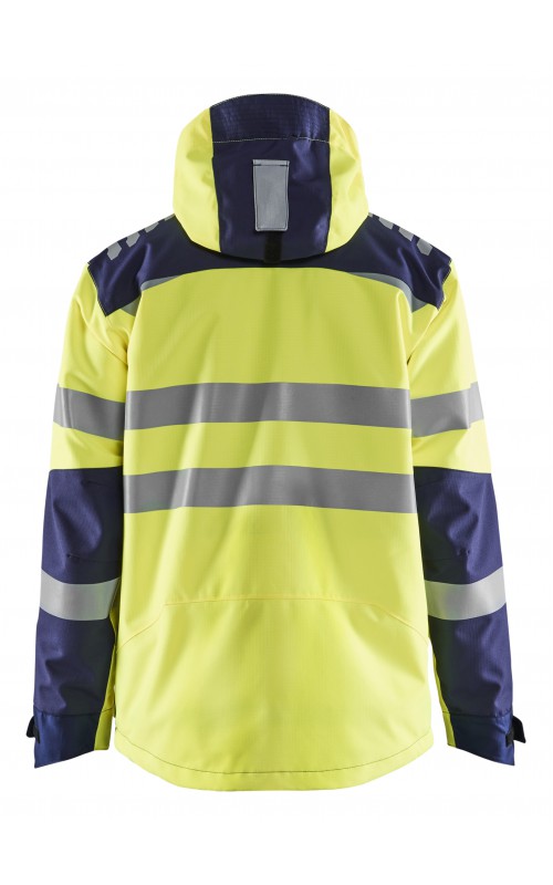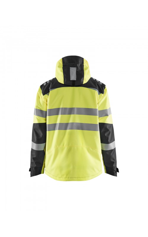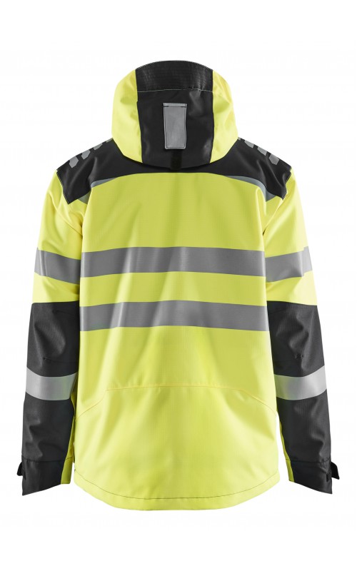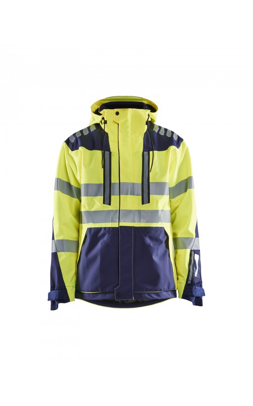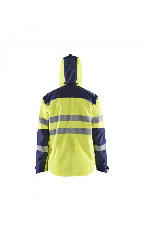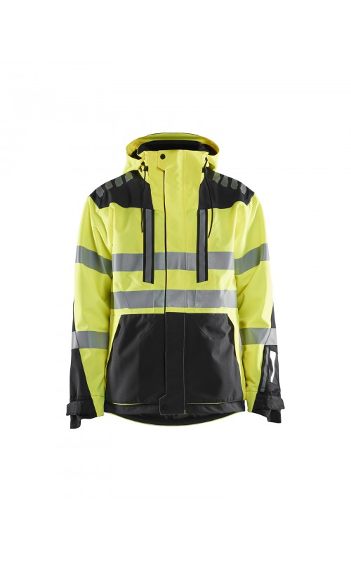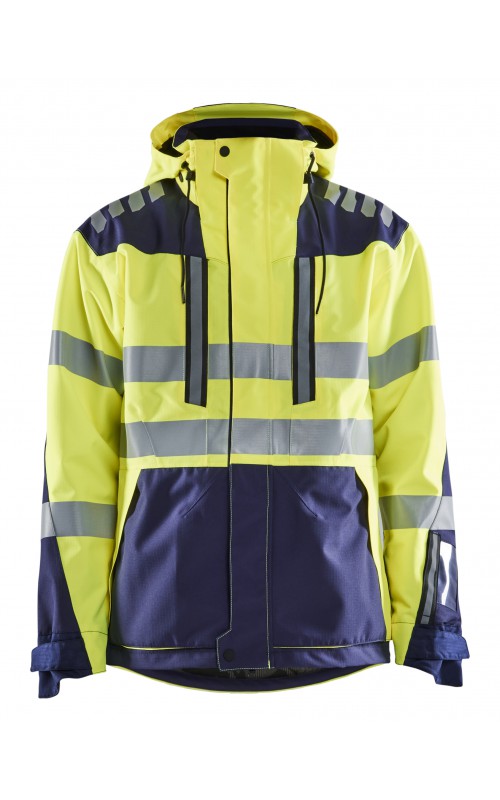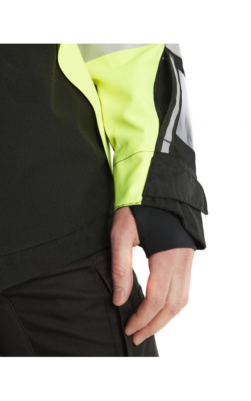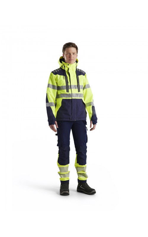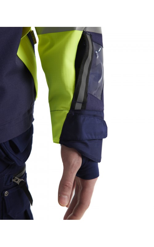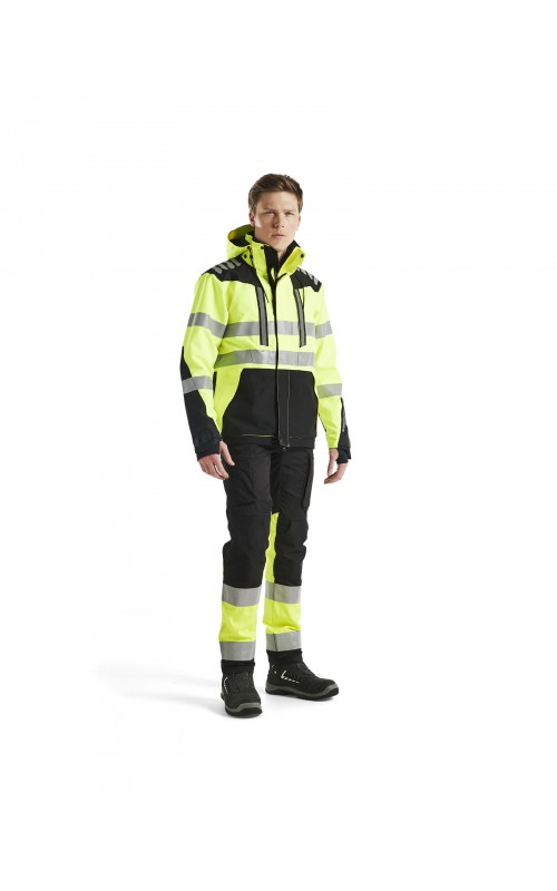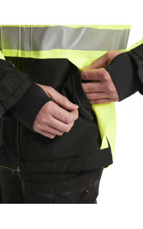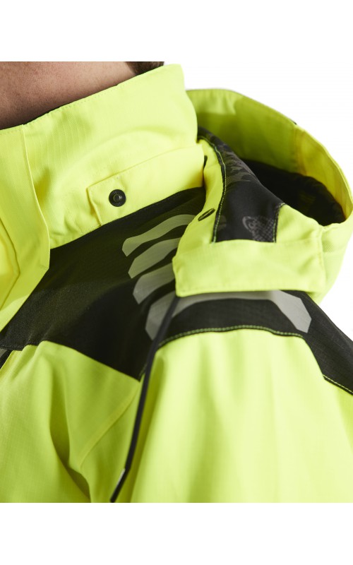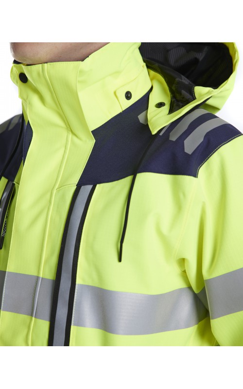 High Vis shelljack gemaakt van gelamineerd, rekbaar ripstop-materiaal dat uitstekende scheurweerstand biedt. Het jack heeft getapete naden, verlengde mouwen met versterkte manchetten en zorgvuldig geplaatste reflecterende details die, samen met de reflecterende stof, garandeert dat de drager zichtbaar is vanuit alle richtingen. ID-kaarthouder op de linkermouw. Het jack heeft een 2-weg ritssluiting, een dubbele windvanger aan de voorkant, een grote napoleon-zak met ruimte voor een tablet, een geplooid voorzak met twee openingen, waarvan één met een rits en borstzakken met ritsen. Binnenzak van mesh, grote binnenzak met lycra-band en binnenzak voor mobiele telefoon met een rits en opening voor een headset-kabel. De afneembare capuchon heeft een gevoerde klep en kan worden aangepast aan drie verschillende niveaus. De binnenkant van de jas heeft een geborstelde mesh-voering en een stretchy camo-print voor ultiem comfort en bewegingsgemak. Gecertificeerd volgens EN ISO 20471 Klasse 3, EN 343.