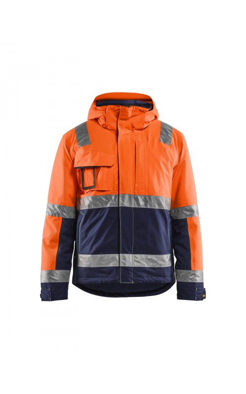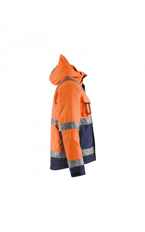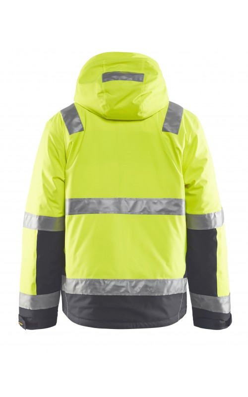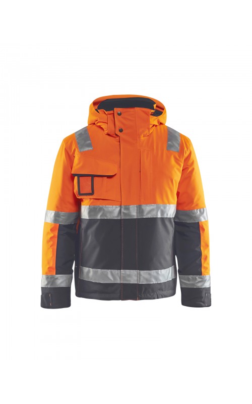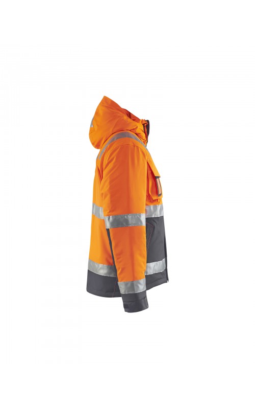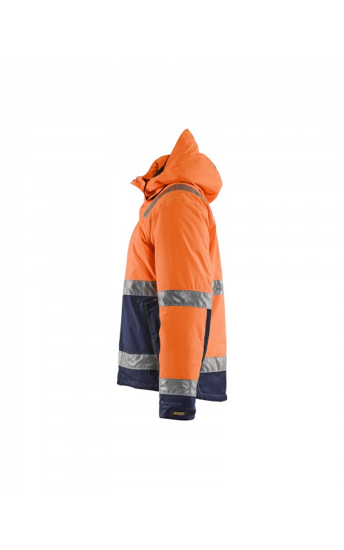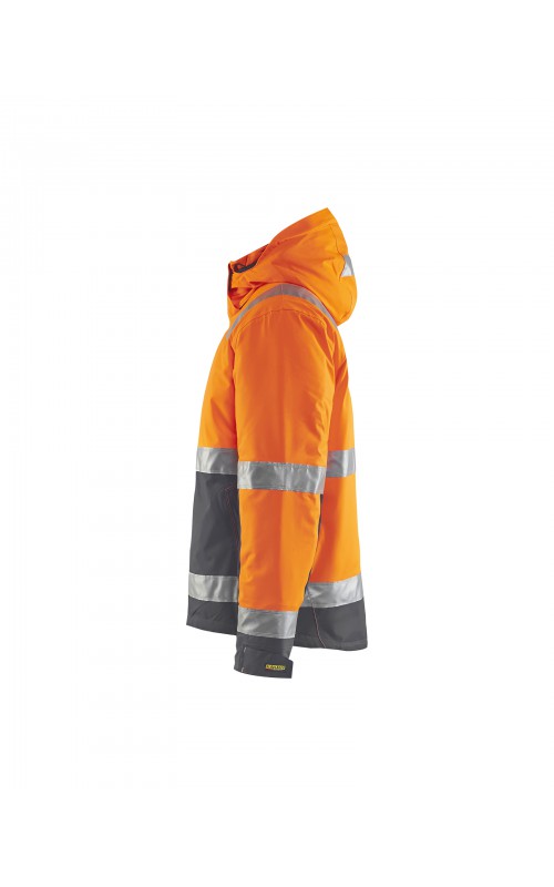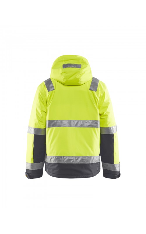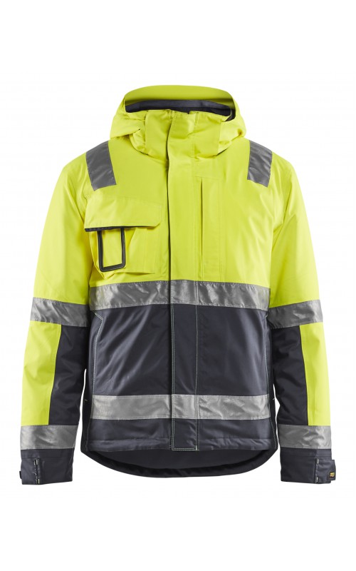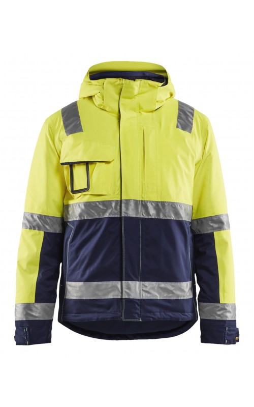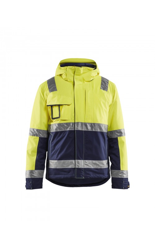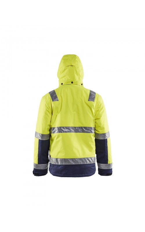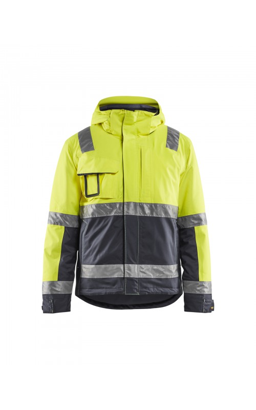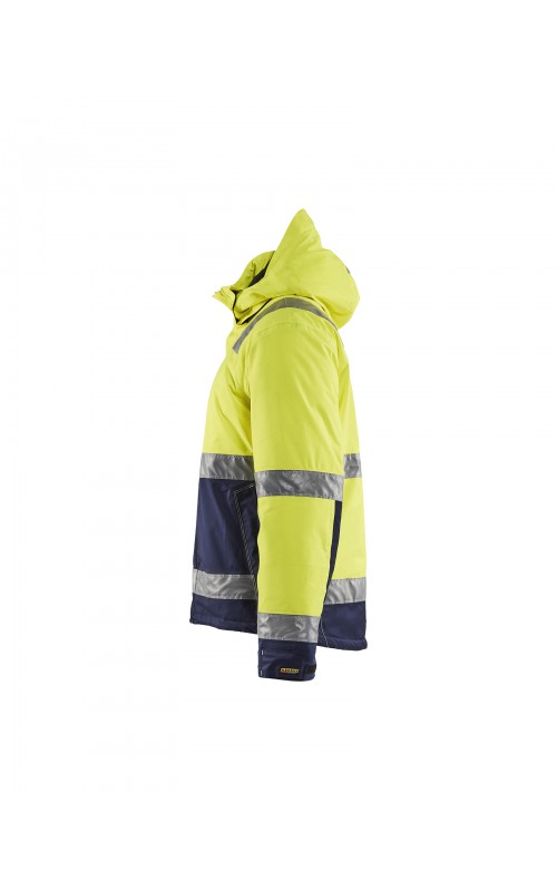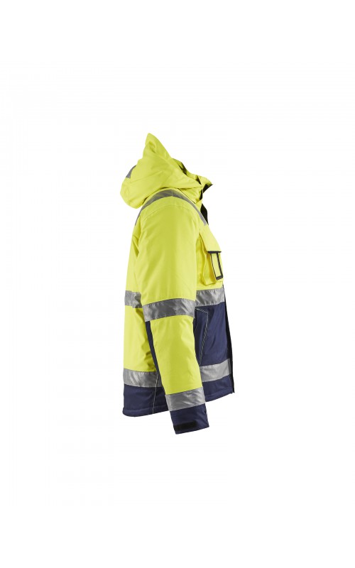 Winterjas met hoge zichtbaarheid, met zeer duurzaam, waterafstotend en vuilwerend stretch stof aan de buitenkant. De jas heeft donkere kleurzones op de plaatsen die het meest blootgesteld zijn aan vuil. Deze jas heeft de volgende ruime en handige zakken: voorzakken, borstzakken met ritssluiting, penzakje en telefoonzakje en twee binnenzakken, één grotere voor bv. handschoenen en één kleinere zak met een Velcro®-sluiting.