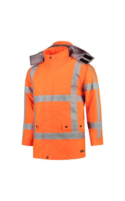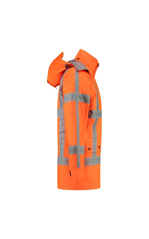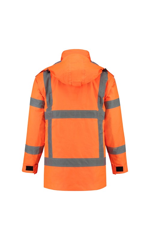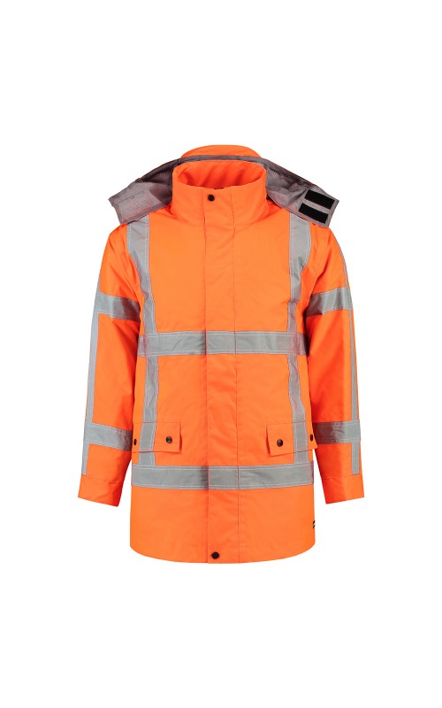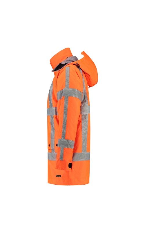 High Visibility Parka conform de richtlijnen van Rijkswaterstaat (RWS). Wind-, waterdicht en ademend conform EN343 klasse 3:3. Voorzien van getapete naden, PU Coating en waterafstotende ritsen. Hoge zichtbaarheid conform EN ISO 20471:2013, Klasse 3. De parka heeft een capuchon die zowel afritsbaar is als opbergbaar in de kraag, een verticale zak met waterafstotende rits, een binnenzak en een zak geschikt voor een telefoon. Tevens voorzien van een verlengd rugpand, 2-weg deelbare rits en een dubbele stormflap met waterkering. De parka heeft een uitneembare thermovoering en is daardoor in alle seizoenen te dragen.