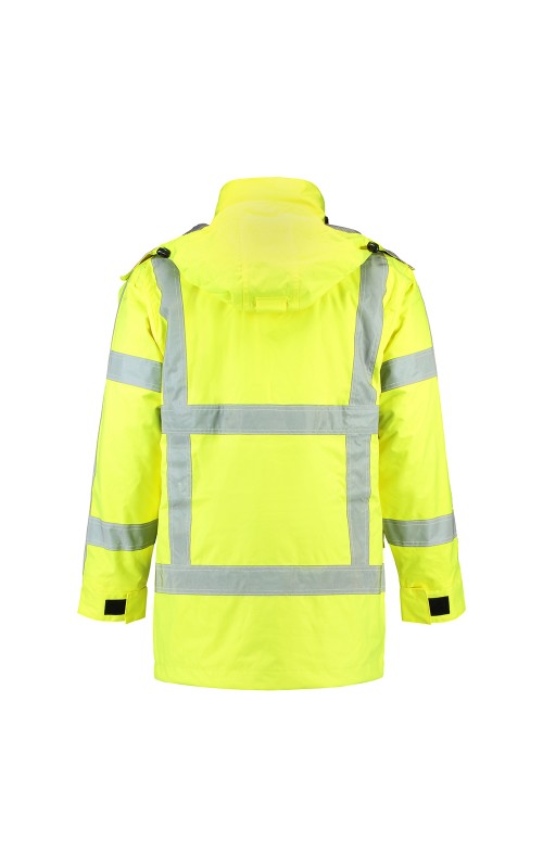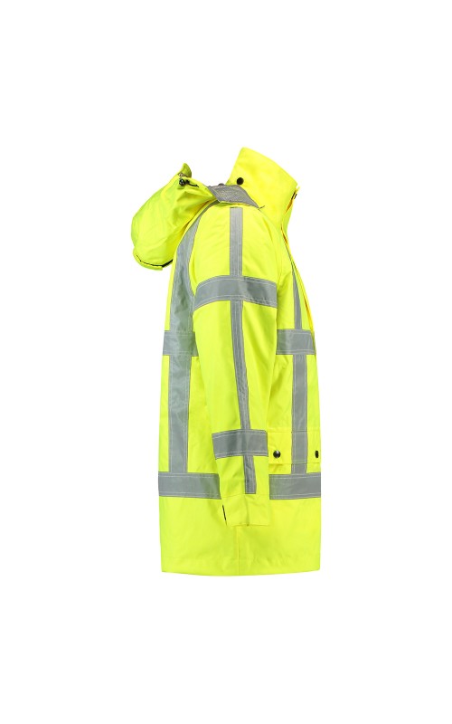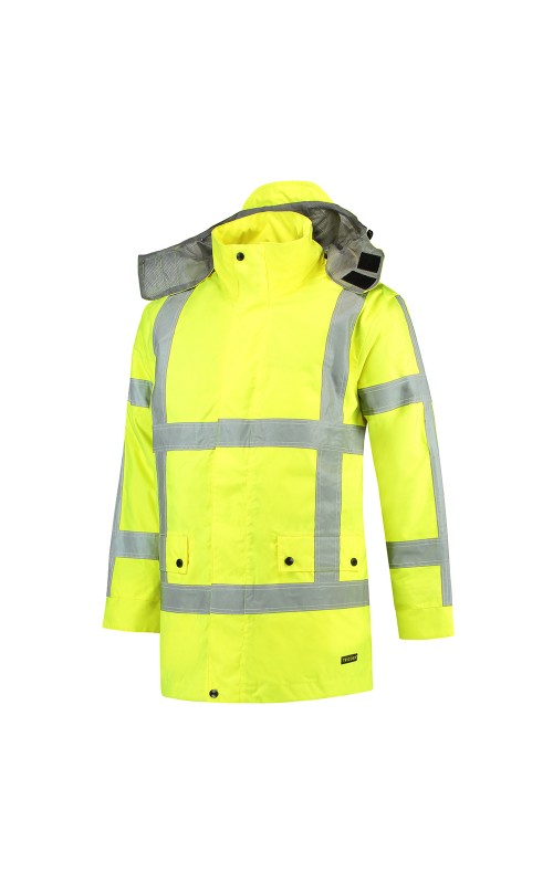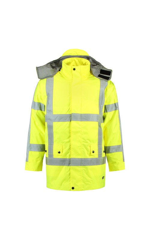 High Visibility Parka conform de richtlijnen van Rijkswaterstaat (RWS). Wind-, waterdicht en ademend conform EN343 klasse 3:3. Voorzien van getapete naden, PU Coating en waterafstotende ritsen. Hoge zichtbaarheid conform EN ISO 20471:2013, Klasse 3. De parka heeft een capuchon die zowel afritsbaar is als opbergbaar in de kraag, een verticale zak met waterafstotende rits, een binnenzak en een zak geschikt voor een telefoon. Tevens voorzien van een verlengd rugpand, 2-weg deelbare rits en een dubbele stormflap met waterkering. De parka heeft een uitneembare thermovoering en is daardoor in alle seizoenen te dragen.