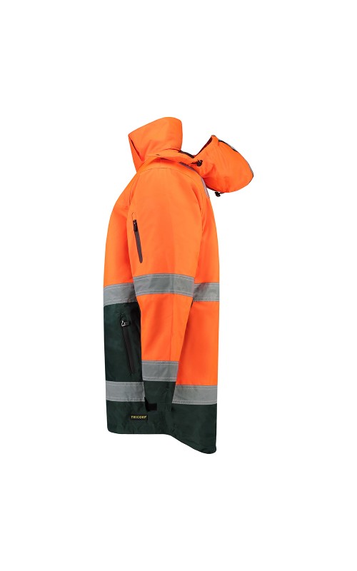 Deze tweekleurige High Visibility parka van het label Tricorp Safety is gemaakt van een sterke kwaliteit fluordoek en contrastdoek met een PU-coating. Wind-, waterdicht en ademend conform EN343 klasse 3:3. Voorzien van getapete naden en gelamineerde waterafstotende ritsen. Hoge zichtbaarheid conform EN ISO 20471:2013, Klasse 2. De parka heeft een afritsbare capuchon, steekzakken met een rits afsluitbaar, een binnenzak met rits geschikt voor telefoon of MP3-speler, met snoerdoorvoer en ID-badge. Tevens voorzien van baardkapje, verlengd rugpand, printerrits, dubbele stormflap met waterkering en een verdekte drukknoopsluiting. Deze parka heeft een comfortabel uitneembaar thermo binnenjack dat separaat draagbaar is maar niet als werkjas te gebruiken.