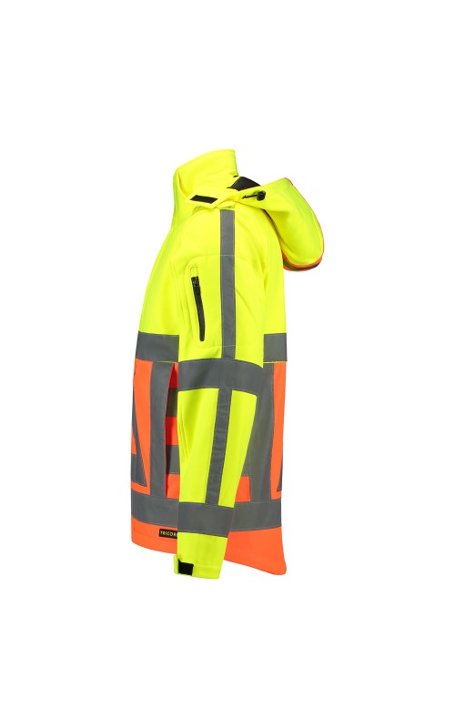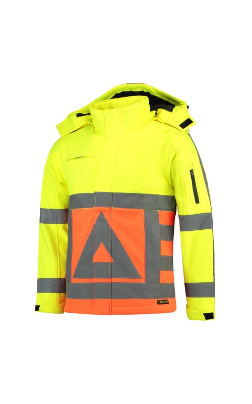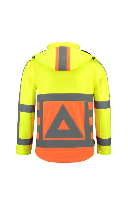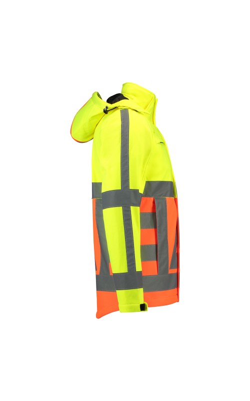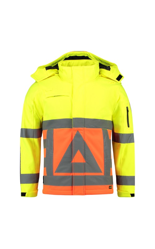 Deze hoge zichtbaarheid tweekleurige Softshell jas wordt gemaakt van een ademende en waterafstotende stof. De strak op elkaar geweven lagen maken dit beschermende effect extra groot zonder in te boeten op het zachte en prettige draagcomfort. Winddicht en waterafstotend en voorzien van een te verbergen ID-badgehouder en afritsbare capuchon. Aan de onderzijde verstelbaar met elastisch koord met stoppers. Voorzien van epauletten en verstelbare manchetten d.m.v. klittenband. Hoge zichtbaarheid conform EN ISO 20471:2013 Klasse 3, met gestikte striping. Deze jas is uitgevoerd met een schouderlus voor de portofoon, borstlus voor een fluitje, 2 zakken geschikt voor telefoon of MP3-speler, met snoerdoorvoer en ID-badge. Deze Softshell voldoet aan alle kledingeisen en voorschriften als vastgelegd in de regeling Verkeersregelaars. Om doorbloeden te voorkomen raden wij aan om alleen druktechnieken te gebruiken die geschikt zijn voor softshell stoffen.