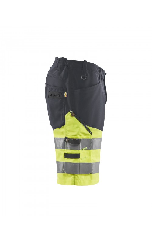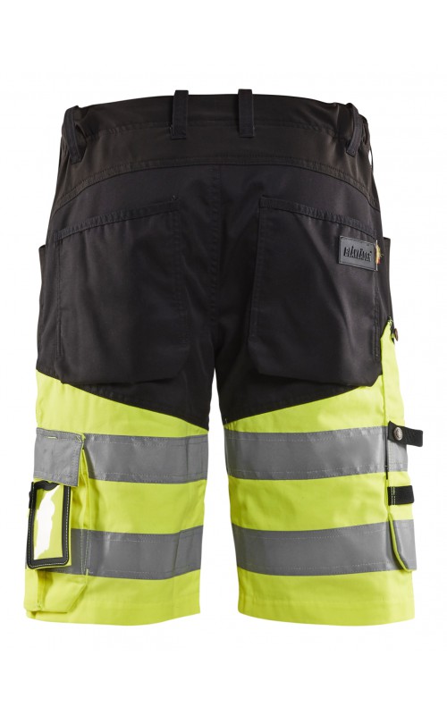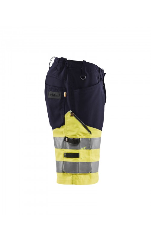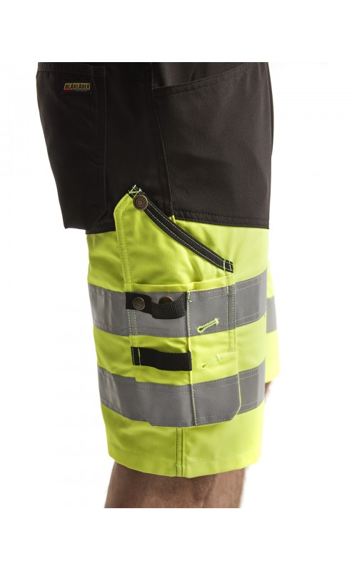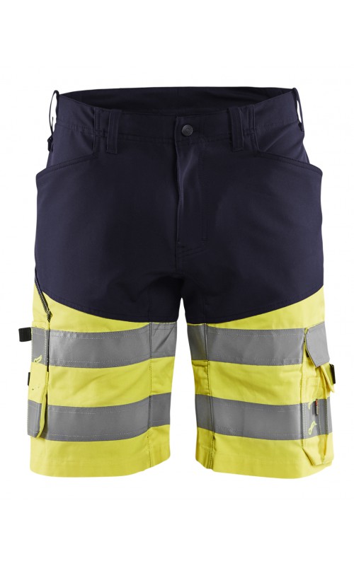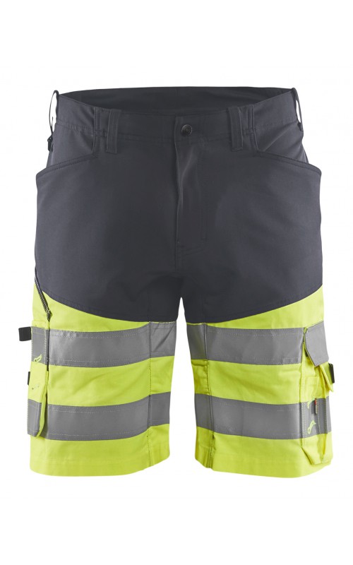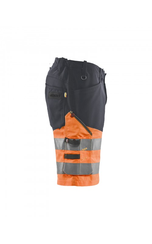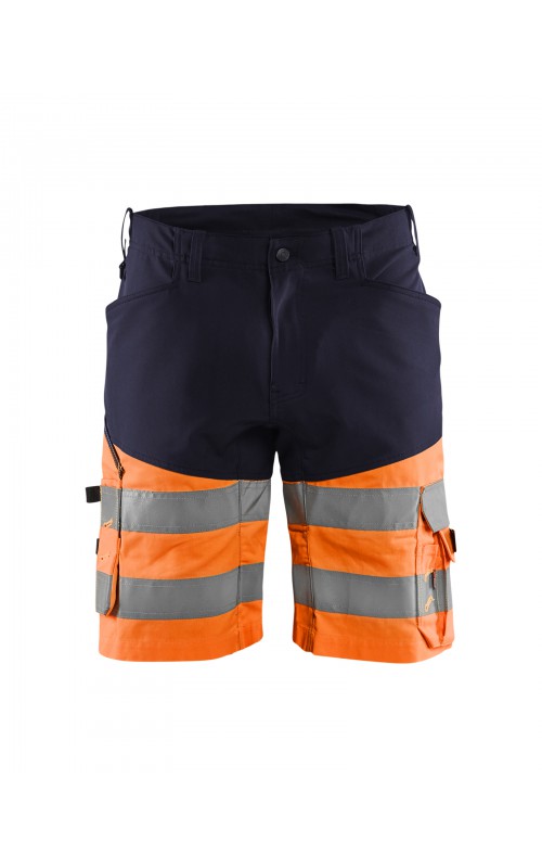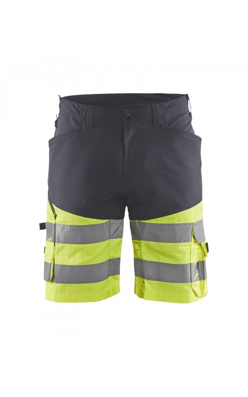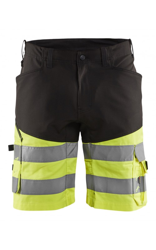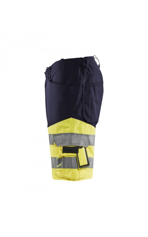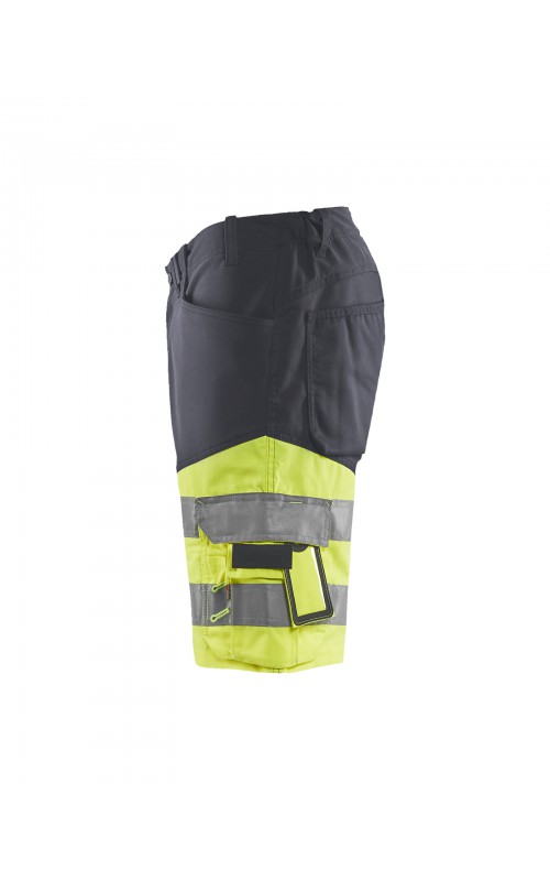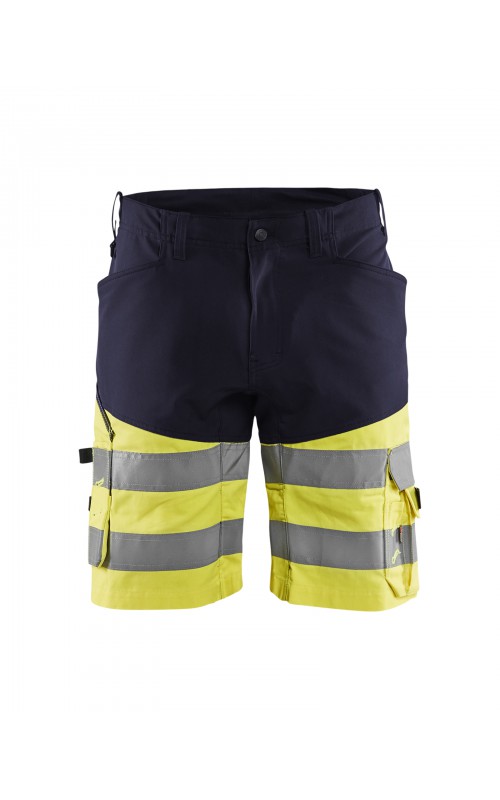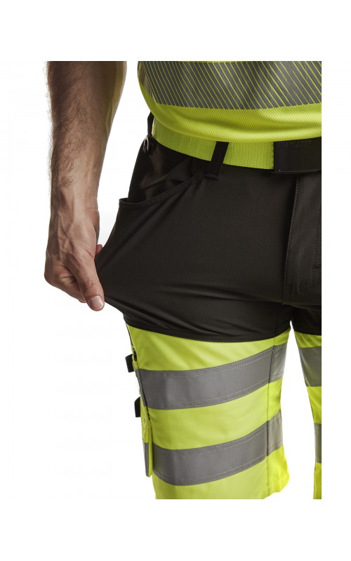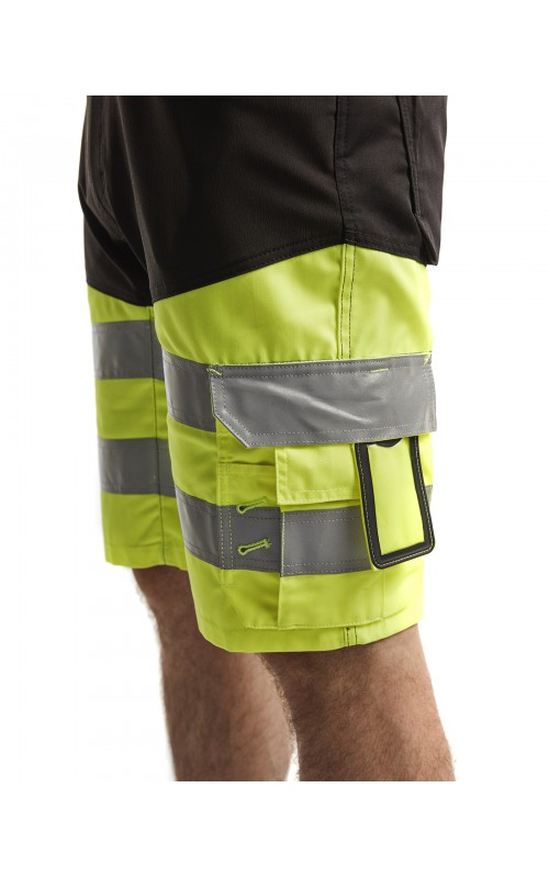 High Vis gecertificeerde short van klasse 1 met stretch panelen. Uitgerust met een elastische taille voor een uitstekend draagcomfort. CORDURA®-versterkte zakken, beenzak met telefoonzak en ID-kaarthouder. Gecertificeerd volgens EN ISO 20471, klasse 1. Combinatiecertificering V.