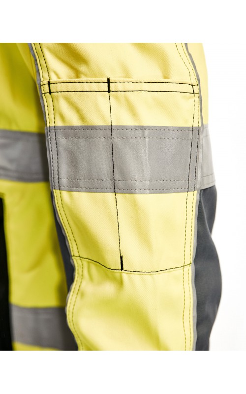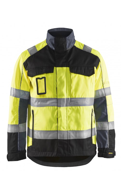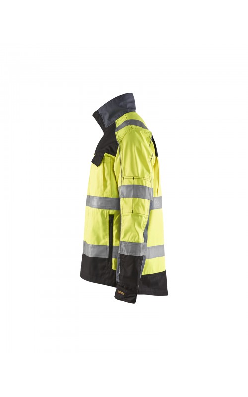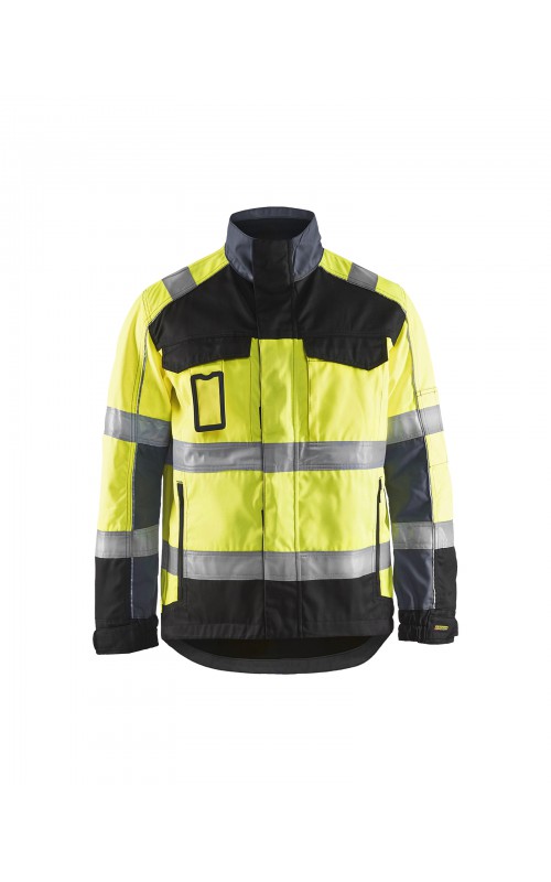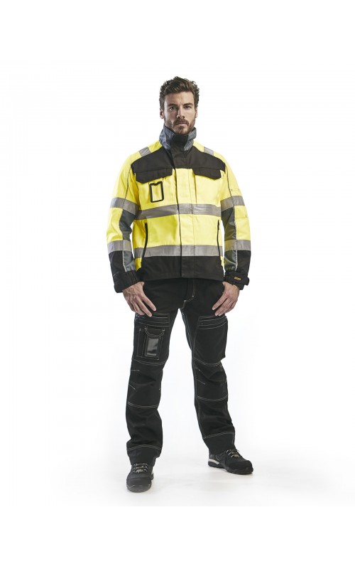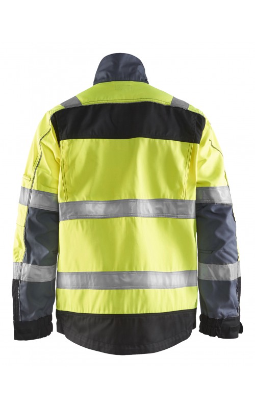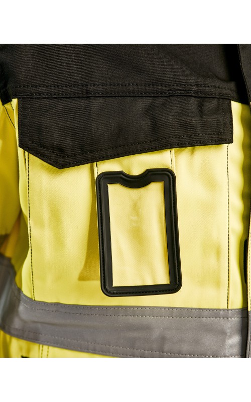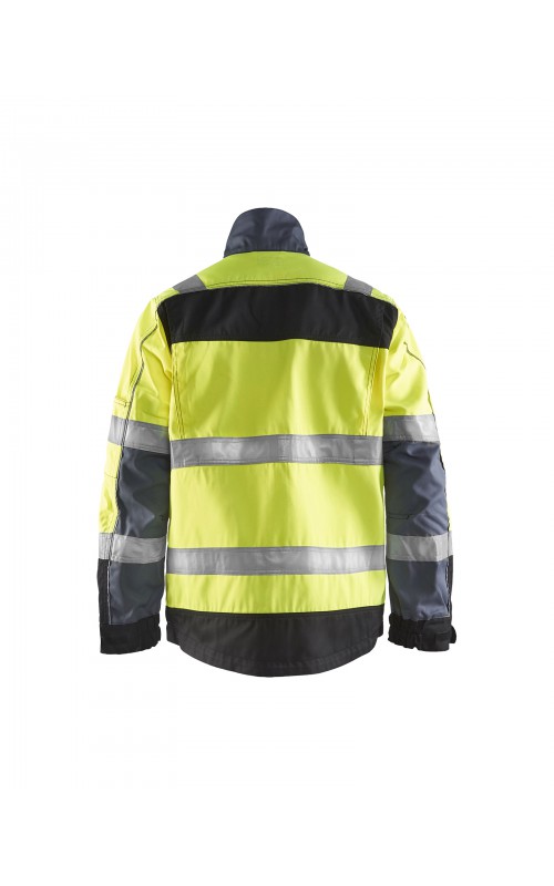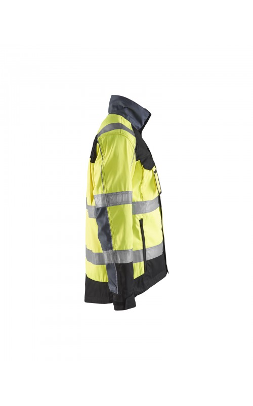 Praktisch High Vis jack met voorgevormde mouwen, verstelbare taillewijdte en geplooid rugpand van waterafstotend materiaal. Kleurcombinatie 3399 geel/zwart gecertificeerd volgens EN ISO 20471 Klasse 2.