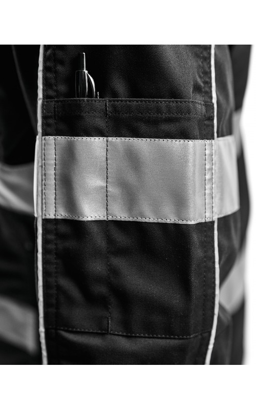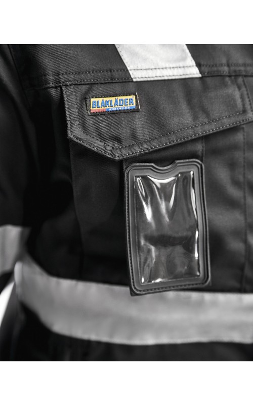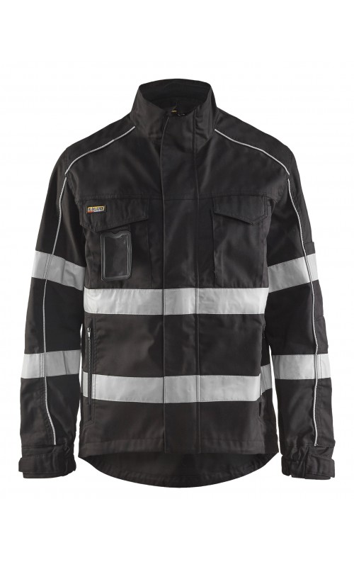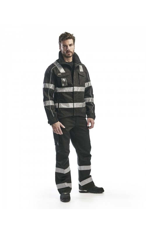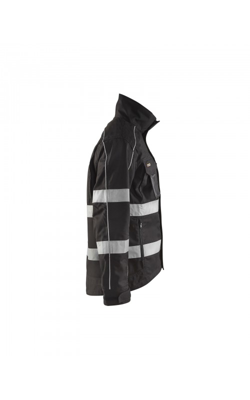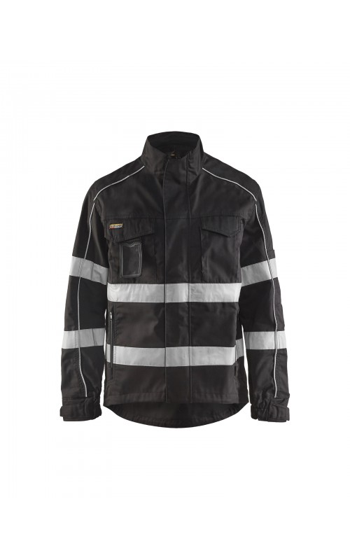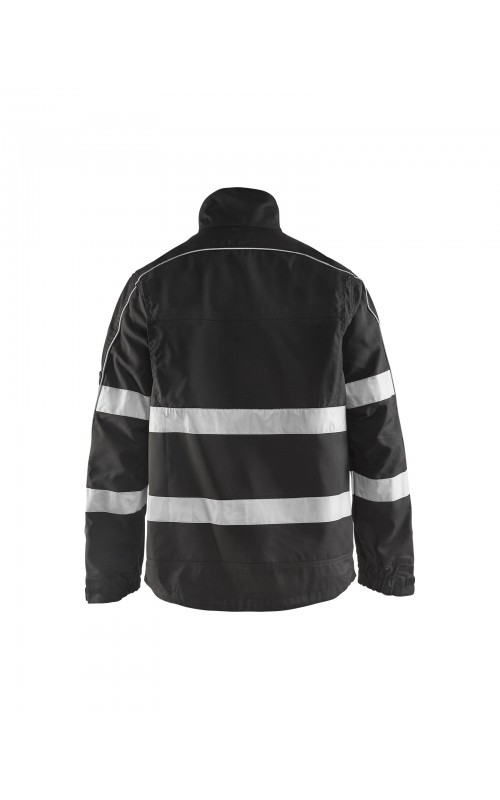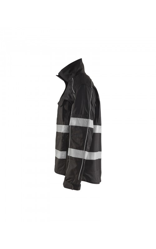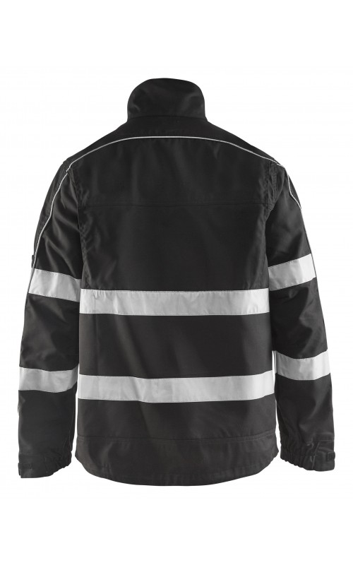 Praktisch High Vis jack met voorgevormde mouwen, verstelbare taillewijdte en geplooid rugpand van waterafstotend materiaal. Kleurcombinatie 3399 geel/zwart gecertificeerd volgens EN ISO 20471 Klasse 2.