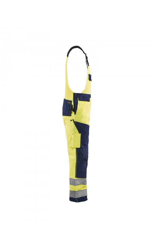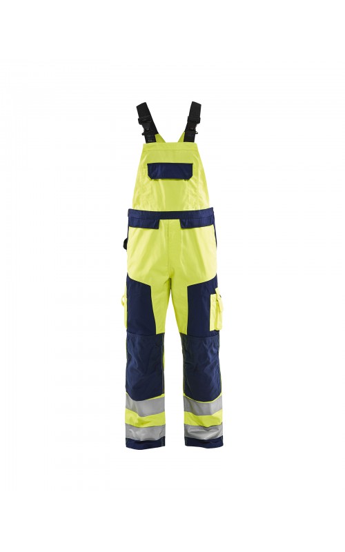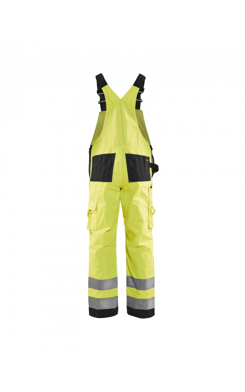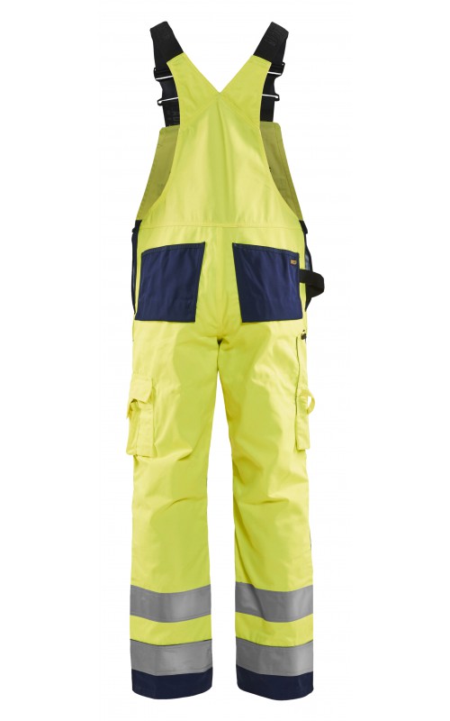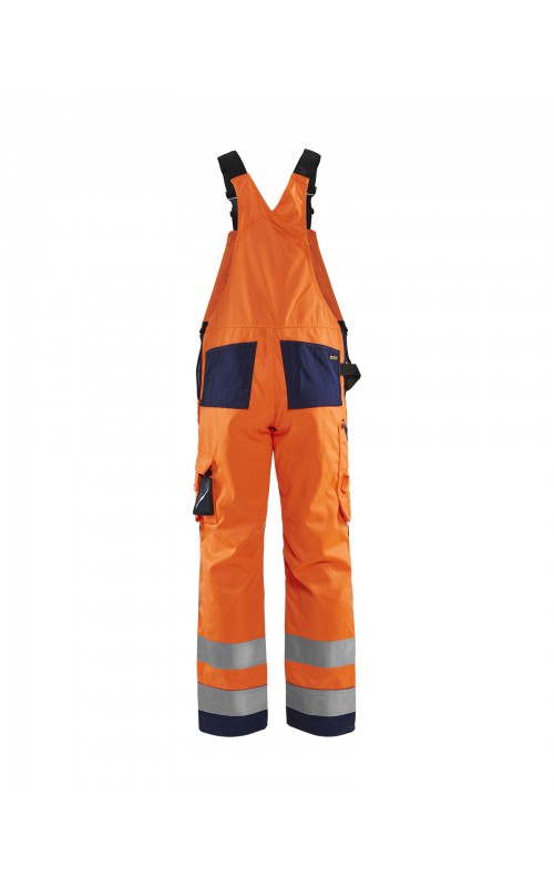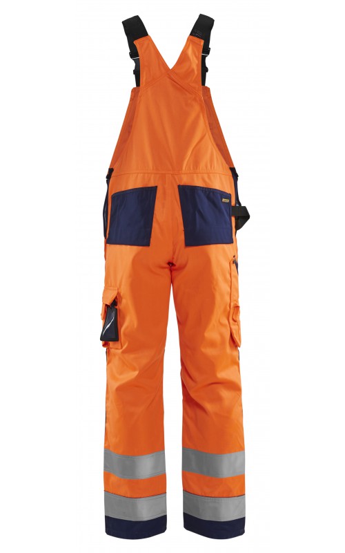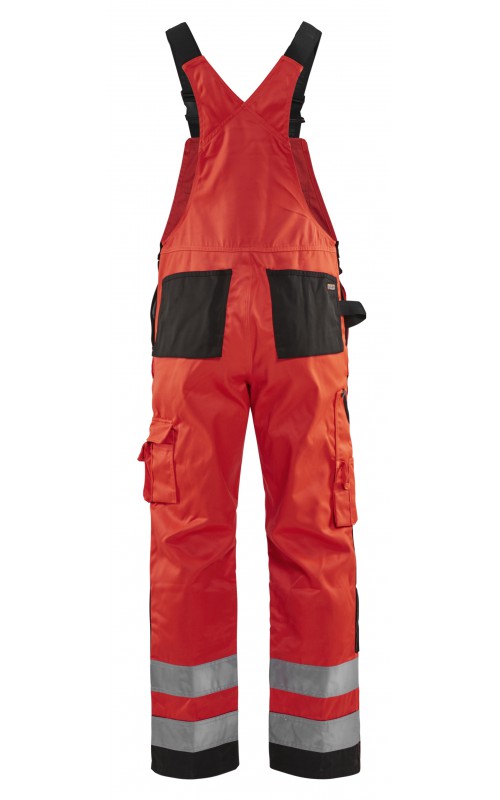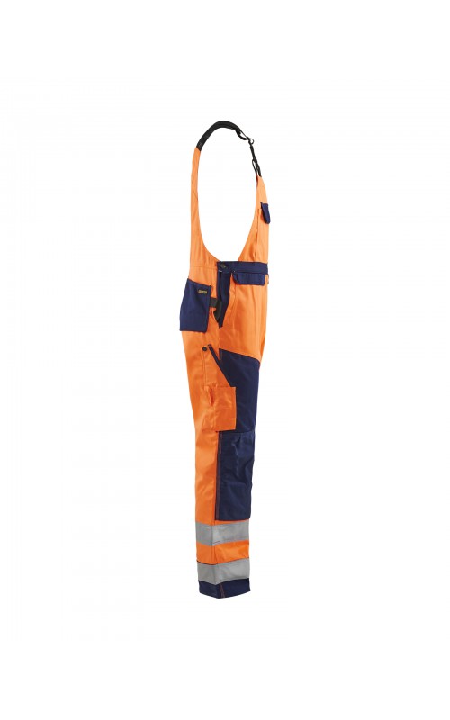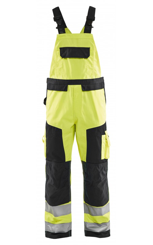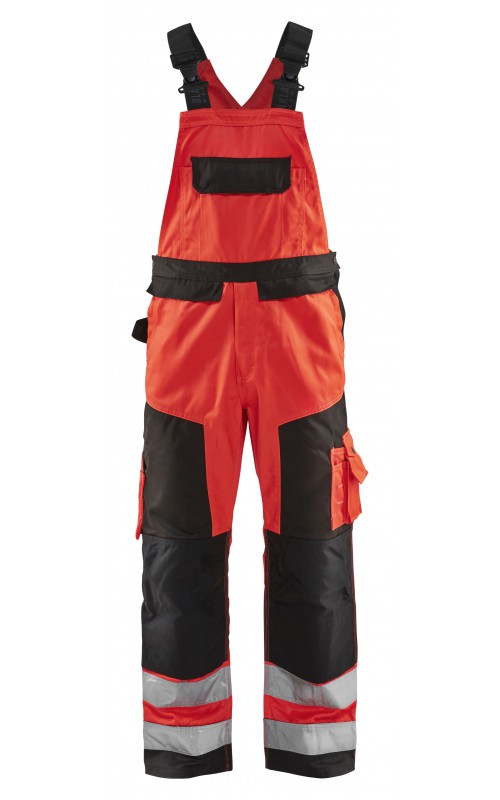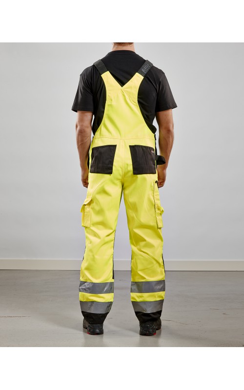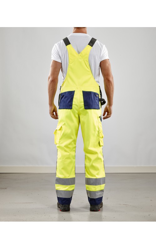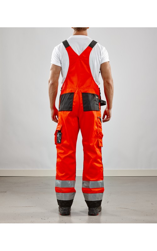 High vis overall met brede bretels, kniebeschermerzakken, achterzakken met plooi en beenzak, ID-kaartzak, borstzak, telefoonzak, pennenzak, schuine voorzakken, CORDURA®-spijkerzakken (apart verkrijgbaar, artikel 2183) en een duimstokzak met een extra zak en meshouder. Andere handige functies van de broek zijn CORDURA®-versteviging op de knieën en achterzakken, hamerlus aan de zijkant, verstelbare taille en 70 mm reflecterende tape rond de benen. Gecertificeerd volgens EN ISO 20471, klasse 2.