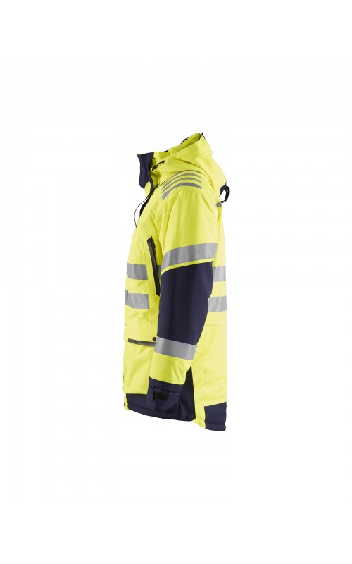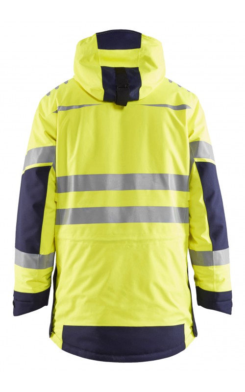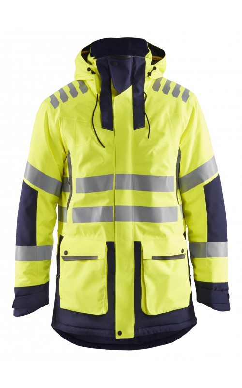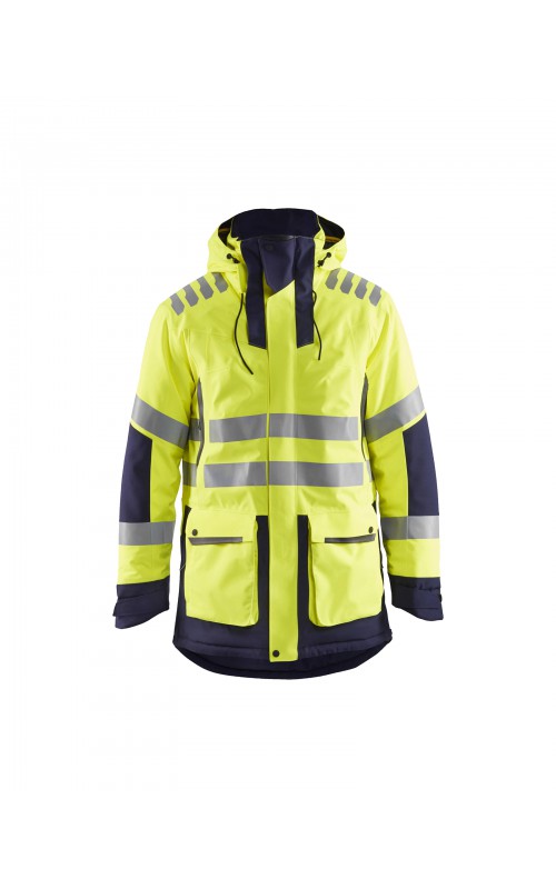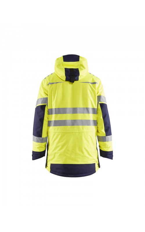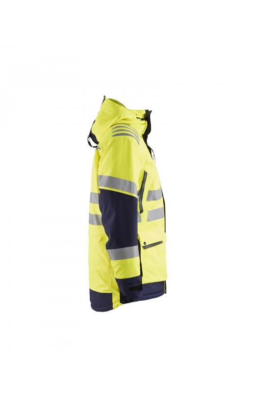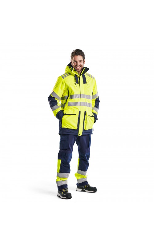 Thermisch gevoerde High Vis winterparka gemaakt van hoogwaardig wind- en waterdicht materiaal met uitstekende ademende eigenschappen. Het jack heeft een warme, lichtgewicht voering gemaakt van gerecyclede PET-flessen. Om voor superieure pasvorm en comfort te zorgen, heeft het jack voorgevormde mouwen, ventilatie onder de armen en een 2-wegsrits. Het beschikt over tal van technische kenmerken, zoals getapete naden, een stormflap, windbescherming rond de nek, manchetten met duimgaten, een verstelbare en afneembare capuchon, versterkende print, discrete reflectie en geplooide, met fleece gevoerde zakken met sneeuwvangers. Met andere woorden, een complete parka. Ademend vermogen van 20.000 g/m²/24u en een waterkolom van 20.000 mm. Gecertificeerd volgens EN ISO 20471 Klasse 3, EN 342 in combinatie met winterwerkbroek 1885, EN 343.