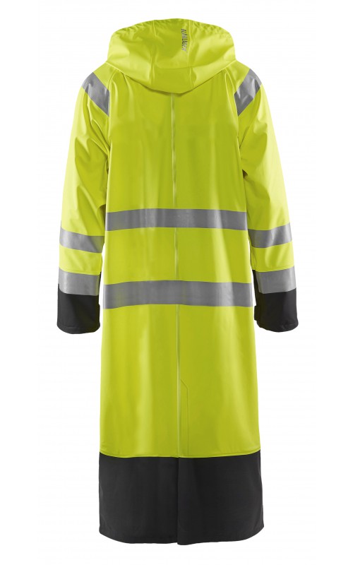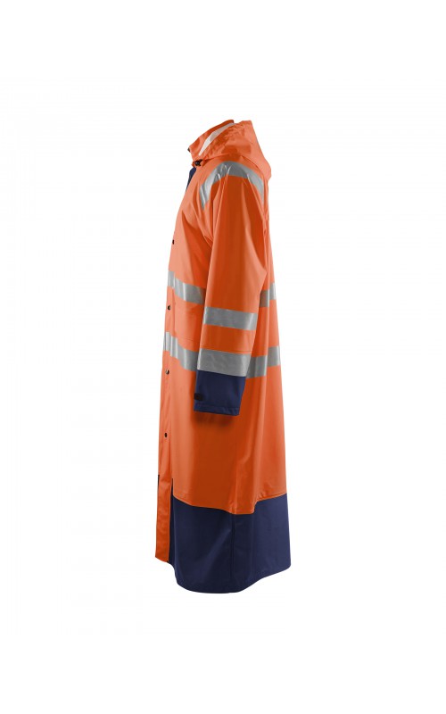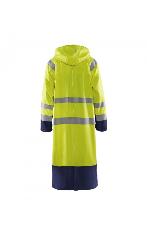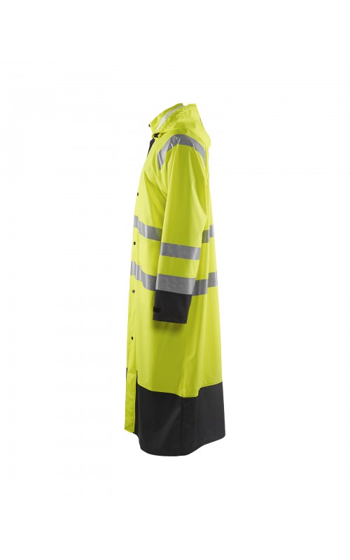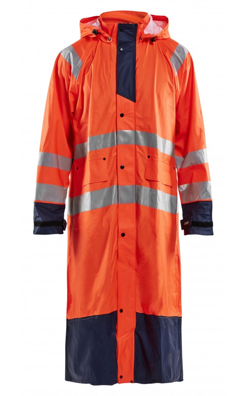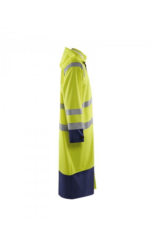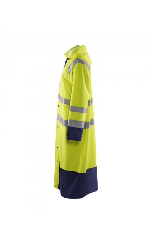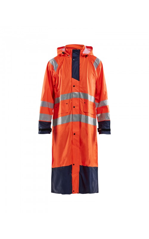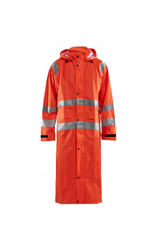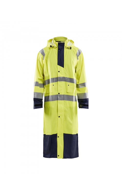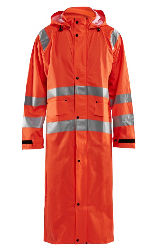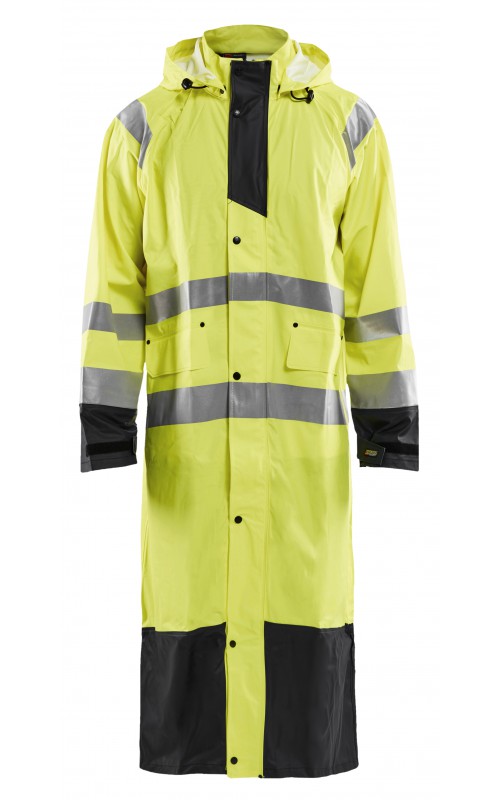 High Vis regenjas voor diegenen met werkzaamheden die lichte en gladde regenkleding nodig hebben. Gemaakt van sterk wind- en waterdicht materiaal met gelaste naden en goede ventilatie. De sluiting is een sterke verborgen 2-weg ritssluiting met daarover een stormsluiting met drukknopen. De jas heeft een goede pasvorm, verstelbare manchetten met klittenband, een afneembare en verstelbare capuchon met trekkoordje en eenvoudig toegankelijke voorzakken. Gecertificeerd volgens EN ISO 20471, Klasse 3, beschermende kleding met hoge zichtbaarheid en EN 343, beschermende kleding tegen slecht weer. Kleur #3300 geel is uitlopend. Vind meer informatie in catalogus 2017. Kleur #5300 oranje is geüpdated. Oude model is leverbaar zolang de voorraad strekt.