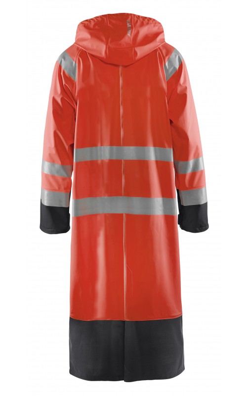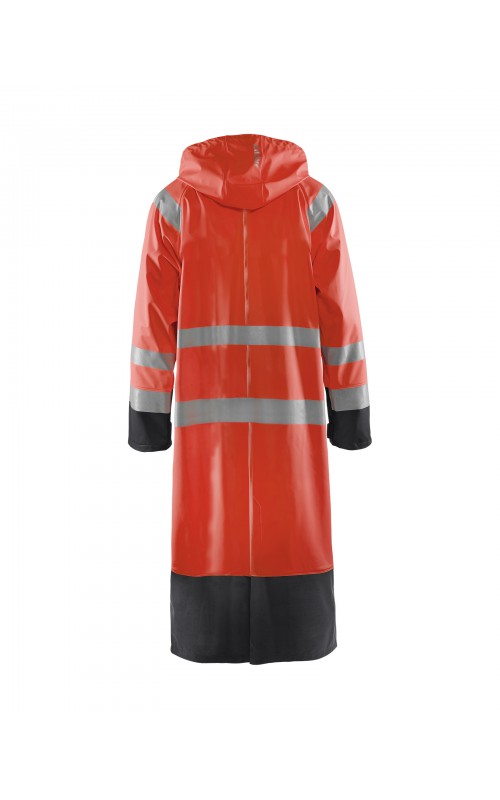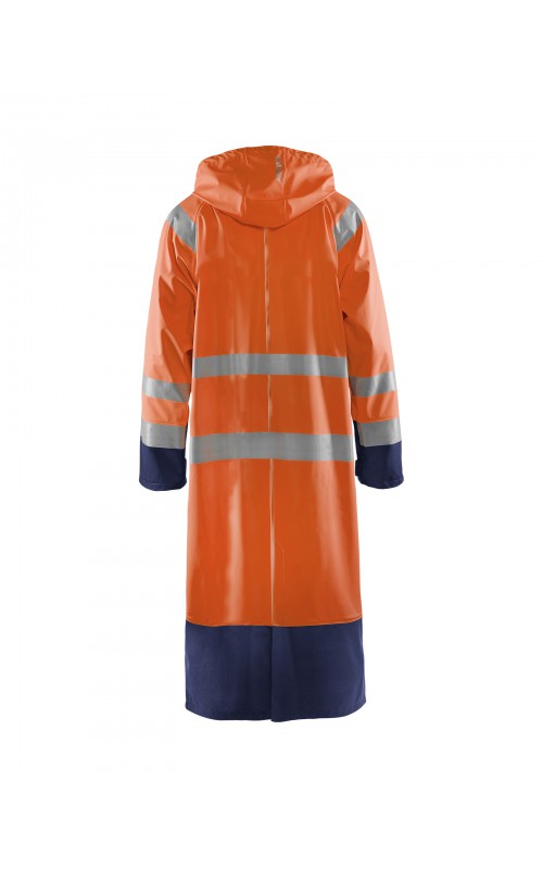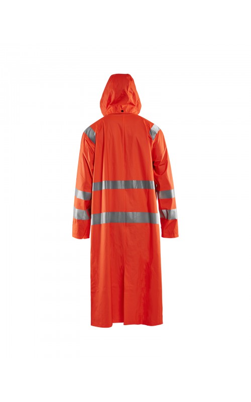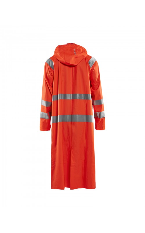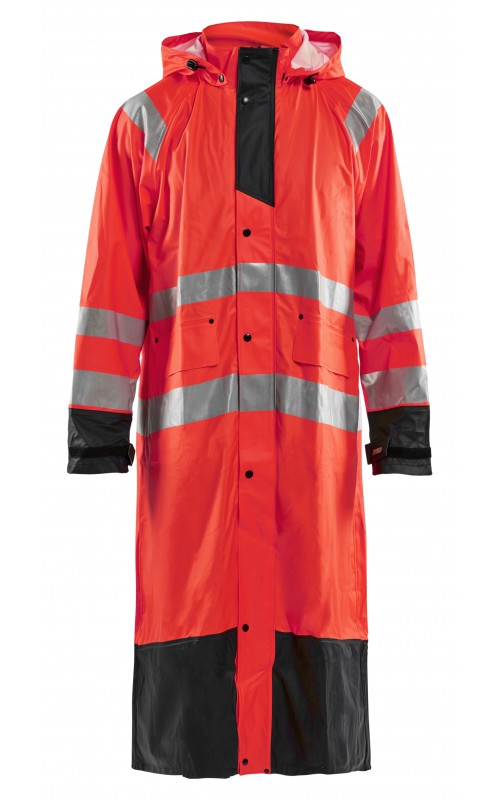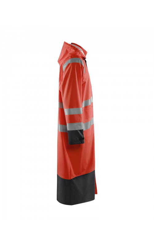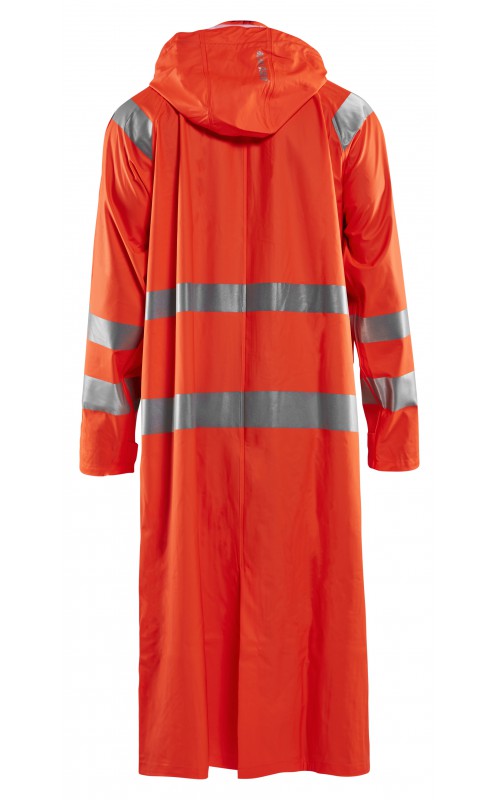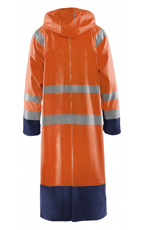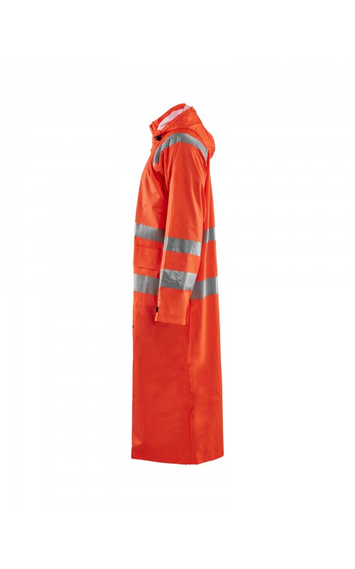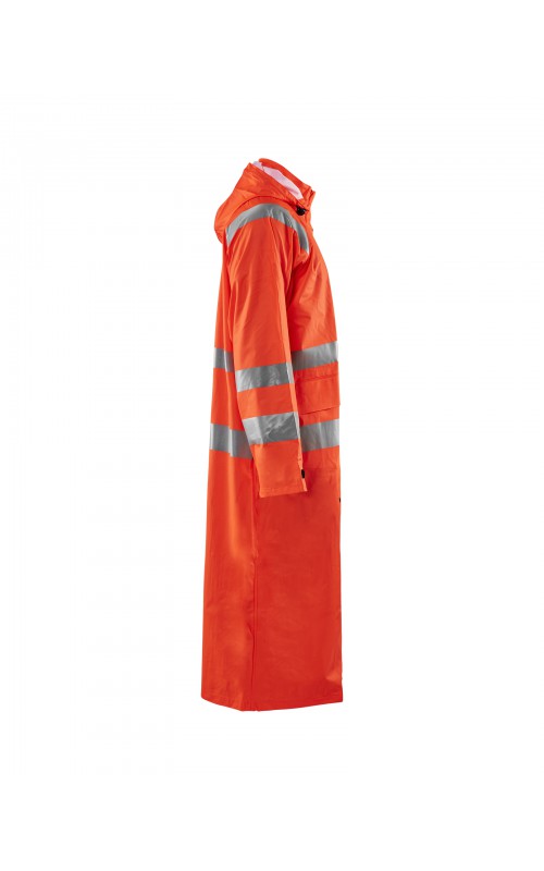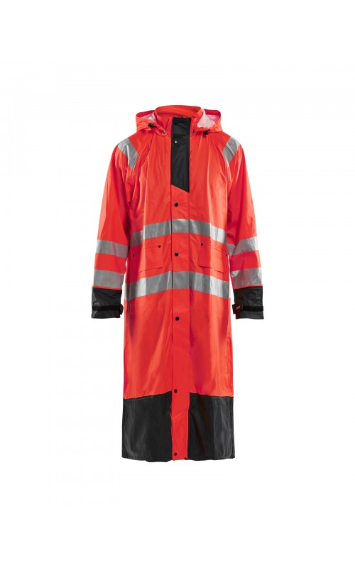 High Vis regenjas voor diegenen met werkzaamheden die lichte en gladde regenkleding nodig hebben. Gemaakt van sterk wind- en waterdicht materiaal met gelaste naden en goede ventilatie. De sluiting is een sterke verborgen 2-weg ritssluiting met daarover een stormsluiting met drukknopen. De jas heeft een goede pasvorm, verstelbare manchetten met klittenband, een afneembare en verstelbare capuchon met trekkoordje en eenvoudig toegankelijke voorzakken. Gecertificeerd volgens EN ISO 20471, Klasse 3, beschermende kleding met hoge zichtbaarheid en EN 343, beschermende kleding tegen slecht weer. Kleur #3300 geel is uitlopend. Vind meer informatie in catalogus 2017. Kleur #5300 oranje is geüpdated. Oude model is leverbaar zolang de voorraad strekt.