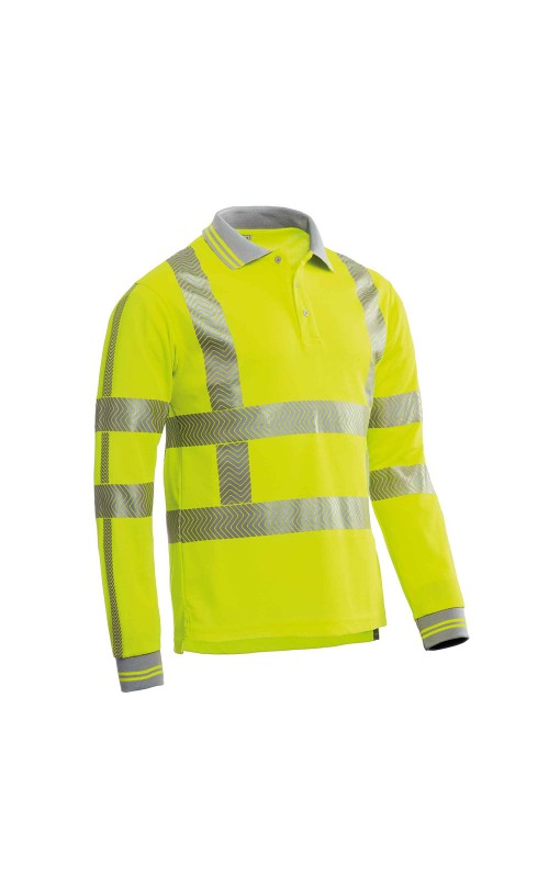 Fluoriserend veiligheids poloshirt met lange mouw uit de Santino HiVis-Line, 100% polyester, 220 gr/m², unisex, in een comfortabele pique kwaliteit, met contrasterende kraag en manchet, achterzijde langer, UPF 50+, gecertificeerd conform EN ISO 13688 en EN ISO 20471 klasse 2/3, 3M Scotchlite reflectie tape is horizontaal en verticaal in RWS configuratie gesealed.