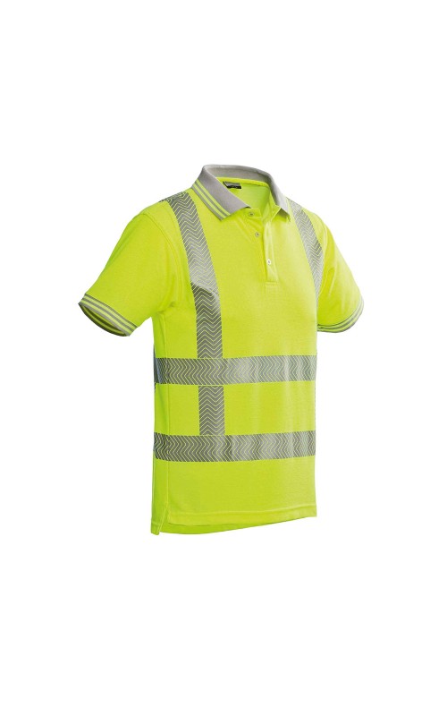 Fluoriserend veiligheids poloshirt uit de Santino HiVis-Line, 100% polyester, 220 gr/m², unisex, in een comfortabele pique kwaliteit, met contrasterende kraag en manchet, achterzijde langer, achterzijde langer, UPF 50+, gecertificeerd conform EN ISO 13688 en EN ISO 20471 klasse 2/3, 3M Scotchlite reflectie tape is horizontaal en verticaal in RWS configuratie gesealed.