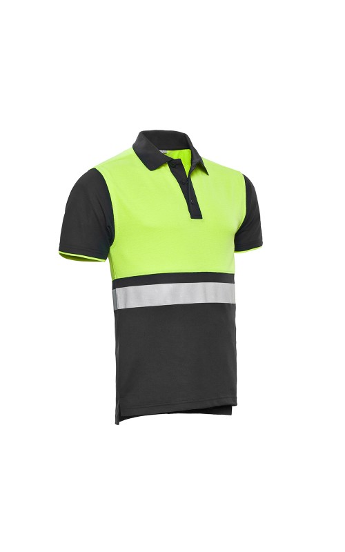 Fluoriserend veiligheids poloshirt uit de Santino HiVis line, 70% polyester/30% cotton, 220 gr/m², unisex, in een comfortabele pique kwaliteit, met contrasterende kraag en manchet, achterzijde langer, halve maan op achterzijde en schouderversteviging, 3M reflectie tape (3M 8712) is horizontaal gesealed.
