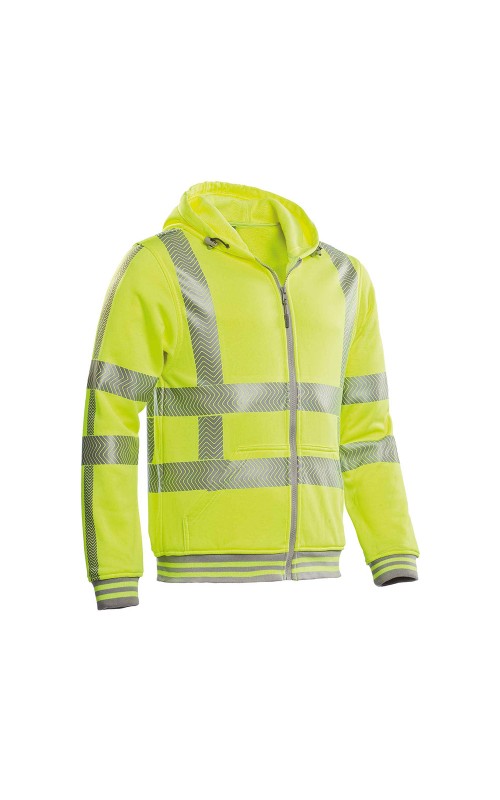 Fluoriserend veiligheids Hooded sweatvest uit de Santino HiVis-Line, in een comfortabele french terry kwaliteit, met contrasterende boord en manchet, 100% polyester, 270 gr/m², unisex, gecertificeerd conform EN ISO 13688 en EN ISO 20471 klasse 2/3, 3M Scotchlite reflectie tape is horizontaal en verticaal in RWS configuratie gesealed.