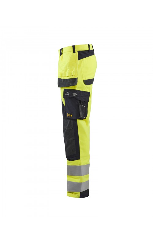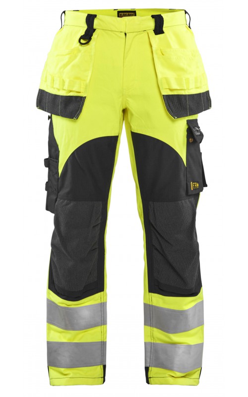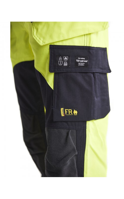 Broek met uitstekende kracht/gewichtsverhouding. Het weefsel is inherent vlamvertragend, wat betekent dat de vlamvertragende eigenschappen van nature aanwezig zijn in de vezels. De broek heeft stevige CORDURA®/Kevlar®/Protal® versterkte delen op de knieën. Ze zijn voorzien van veel functionele opbergmogelijkheden die zijn ontworpen om aan certificeringsnormen te voldoen. Zakken die onderhevig zijn aan overmatige slijtage zijn versterkt met dubbele stof om de levensduur te verlengen. De broek heeft spijkerzakken, een open duimstokzak en achterzakken zonder klep. Ripstop-stof biedt uitstekende scheurweerstand. Het product is gecertificeerd volgens: EN 1149-5, EN ISO 20471 Klasse 2, EN ISO 11612 A1, A2, B1, C1, F1, IEC 61482-2 Klasse 1, ATPV: 11,9 cal / cm², HAF: 79,3%, LOI: 29,6%. Behaalt klasse 3-certificering in combinatie met jacket 4089 volgens de EN ISO 20471-norm. Getest om te voldoen aan de EN ISO 15797-vereisten voor industrieel wassen.