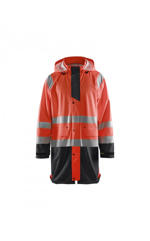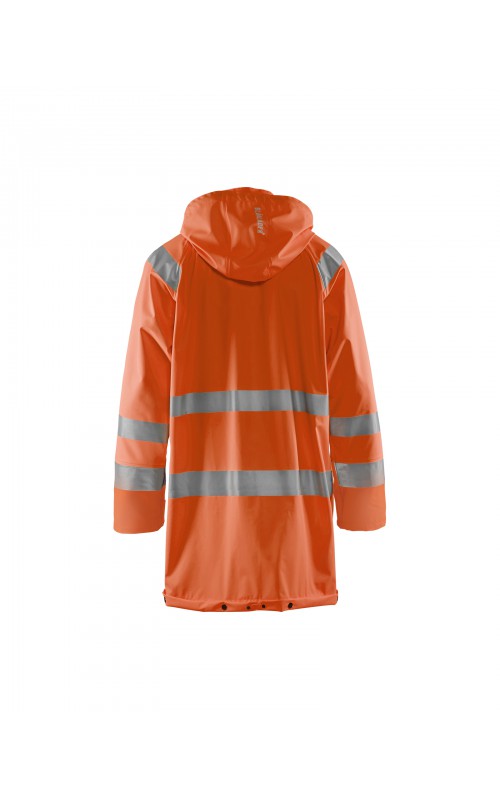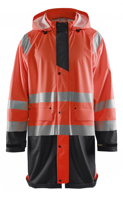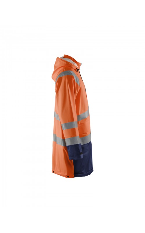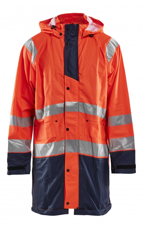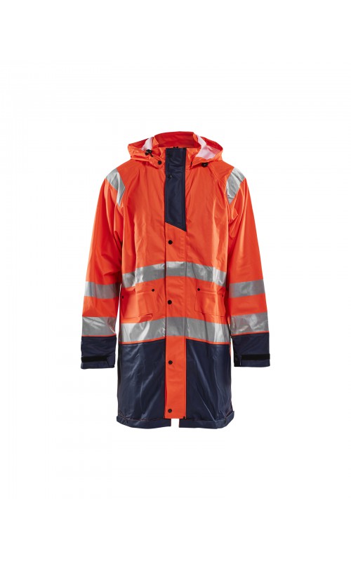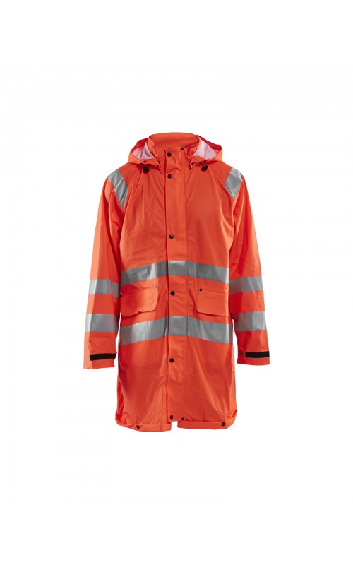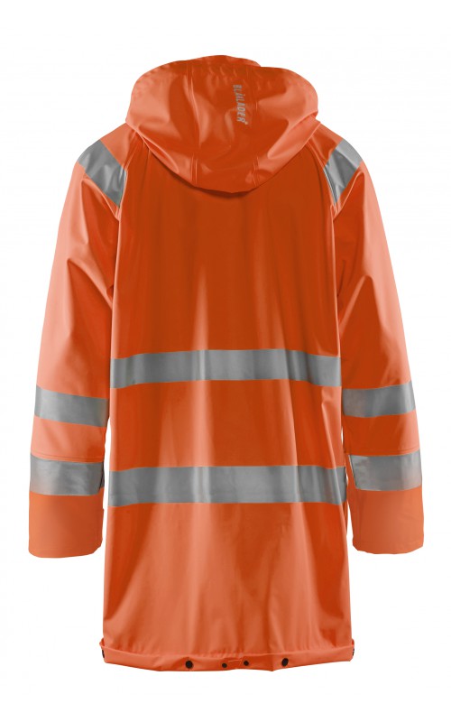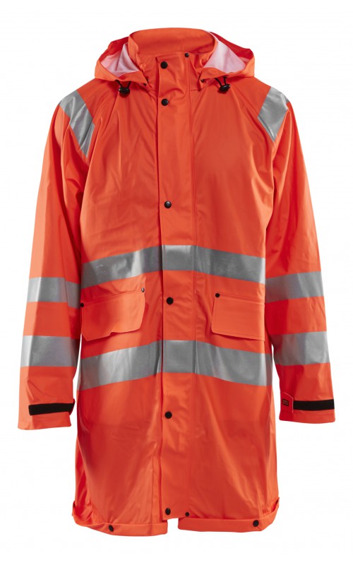High Vis regenjas voor diegenen met werkzaamheden die lichte en gladde regenkleding nodig hebben. Gemaakt van sterk wind- en waterdicht materiaal met gelaste naden en goede ventilatie. De sluiting is een sterke verborgen 2-weg ritssluiting met daarover een stormsluiting met drukknopen. De jas heeft een goede pasvorm, verstelbare manchetten met klittenband, een afneembare en verstelbare capuchon met trekkoordje, eenvoudig toegankelijke voorzakken en druppelgoot in de boord. Gecertificeerd volgens EN ISO 20471 Klasse 3, beschermende kleding met hoge zichtbaarheid, en EN 343 beschermende kleding tegen slecht weer. Kleur #5300 oranje is geüpdatet. Oude model is leverbaar zolang de voorraad strekt.