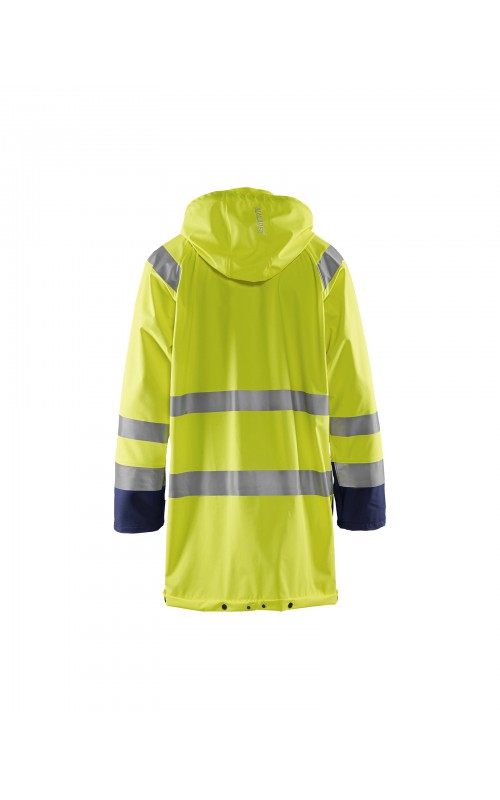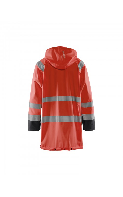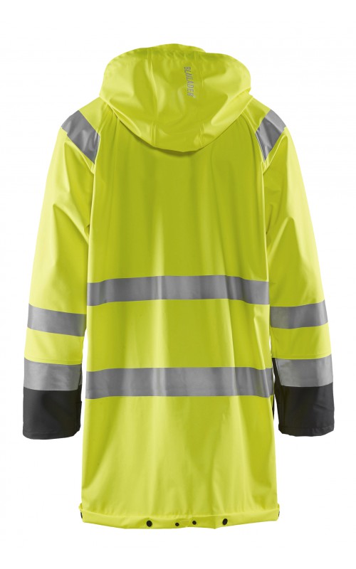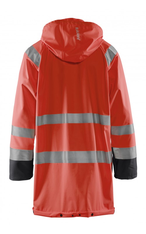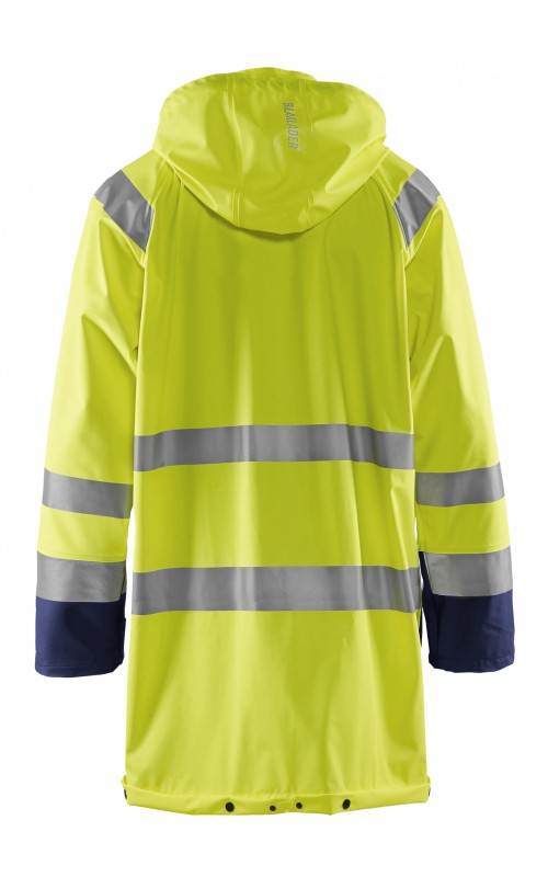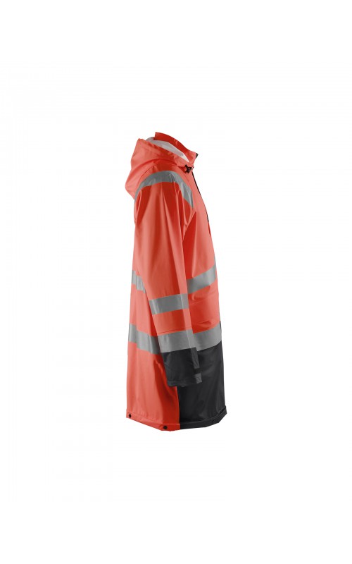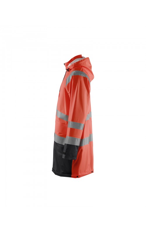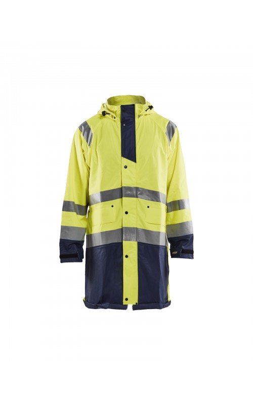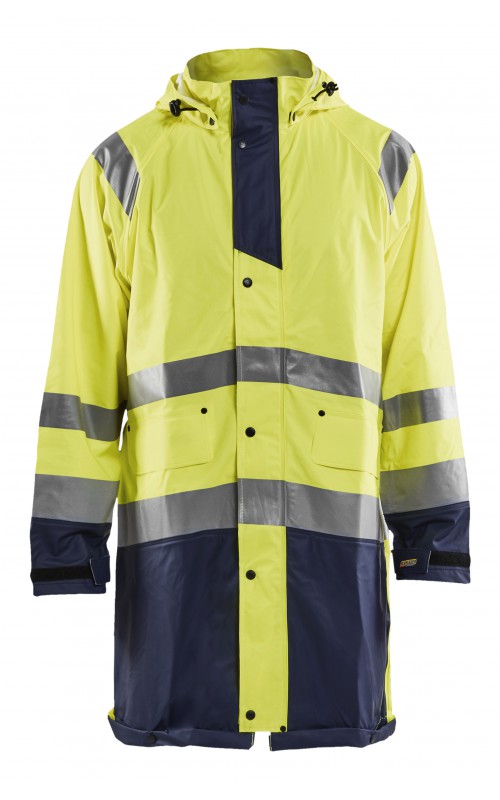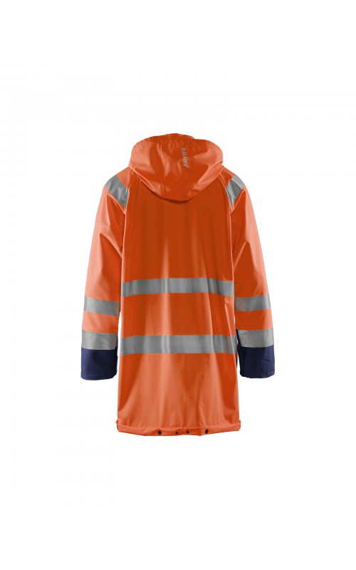 High Vis regenjas voor diegenen met werkzaamheden die lichte en gladde regenkleding nodig hebben. Gemaakt van sterk wind- en waterdicht materiaal met gelaste naden en goede ventilatie. De sluiting is een sterke verborgen 2-weg ritssluiting met daarover een stormsluiting met drukknopen. De jas heeft een goede pasvorm, verstelbare manchetten met klittenband, een afneembare en verstelbare capuchon met trekkoordje, eenvoudig toegankelijke voorzakken en druppelgoot in de boord. Gecertificeerd volgens EN ISO 20471 Klasse 3, beschermende kleding met hoge zichtbaarheid, en EN 343 beschermende kleding tegen slecht weer. Kleur #5300 oranje is geüpdatet. Oude model is leverbaar zolang de voorraad strekt.