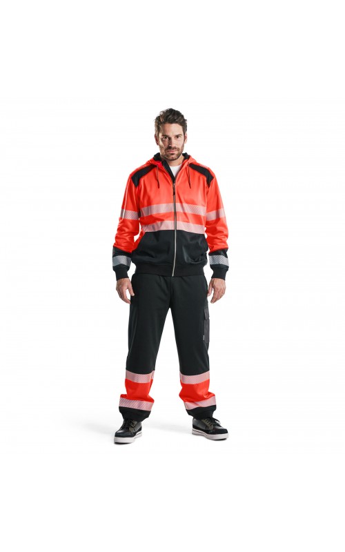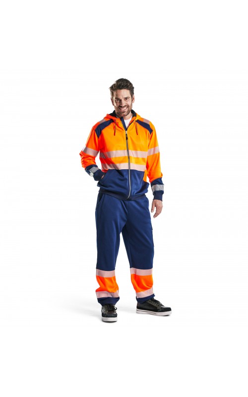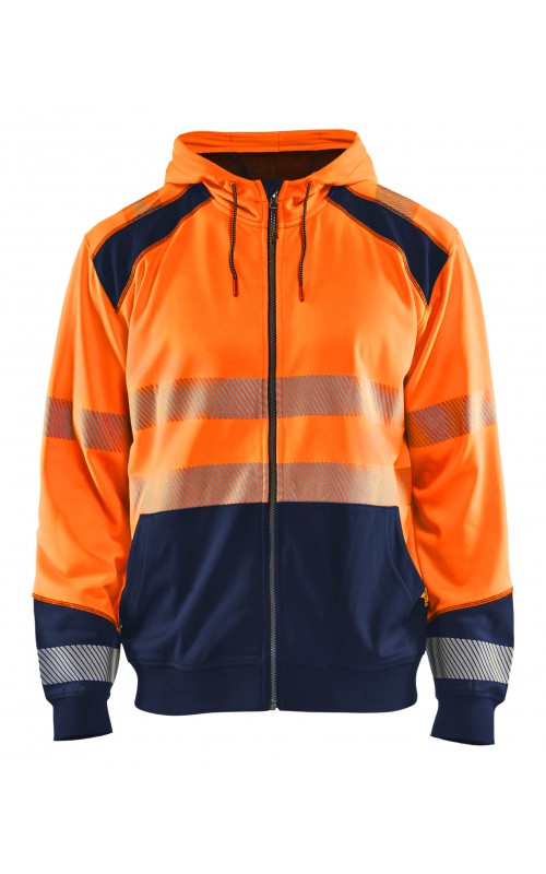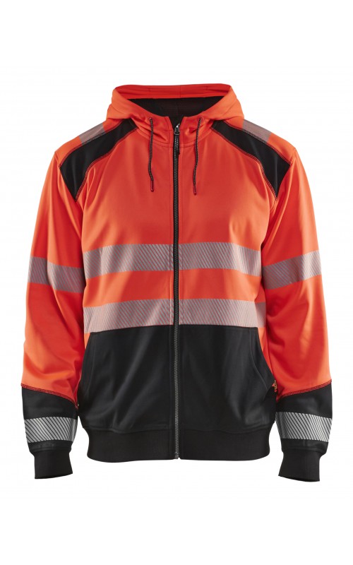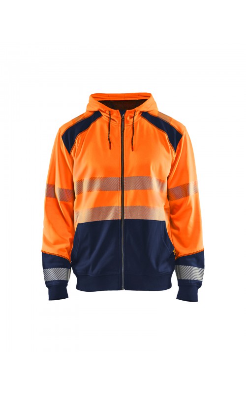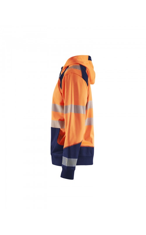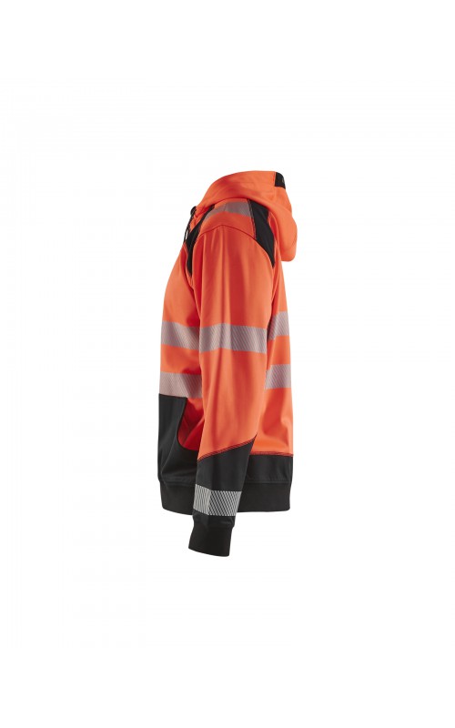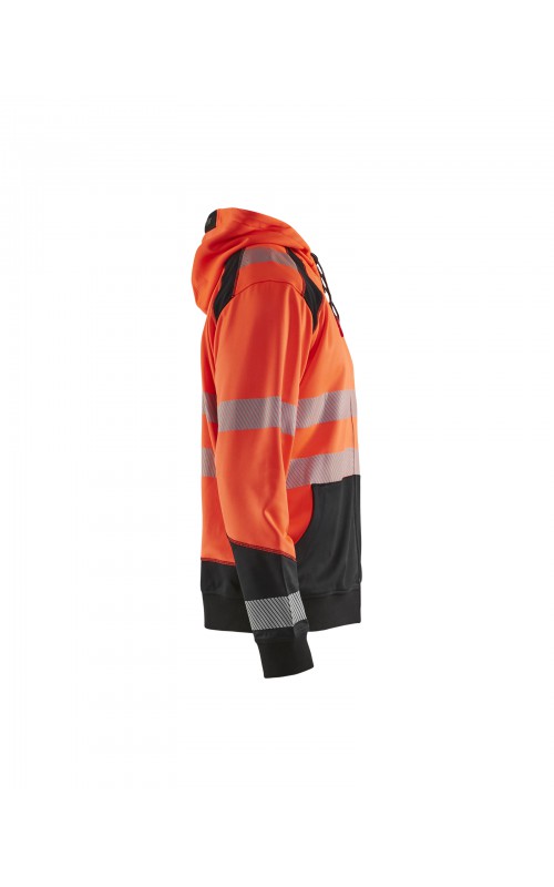 High Vis sweatshirt met kangoeroezak in twee kleuren met donkere kleur op plaatsen die snel vuil worden. Voorzien van ritssluiting en een driedelige verstelbare capuchon voor een goede pasvorm. Praktische functies zoals een doorgang voor een snoer van een koptelefoon in de binnenzak en een telefoonzakje met ritssluiting. Met dit sweatshirt ben je goed zichtbaar vanuit alle richtingen. Gecertificeerd volgens EN ISO 20471, Klasse 2.