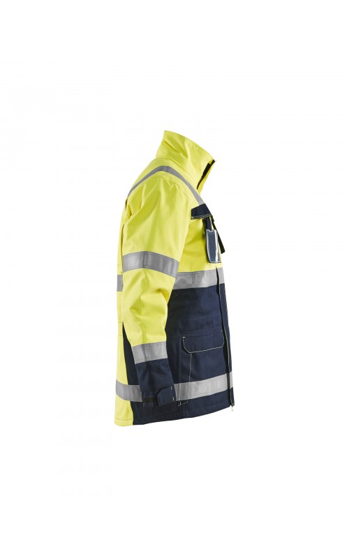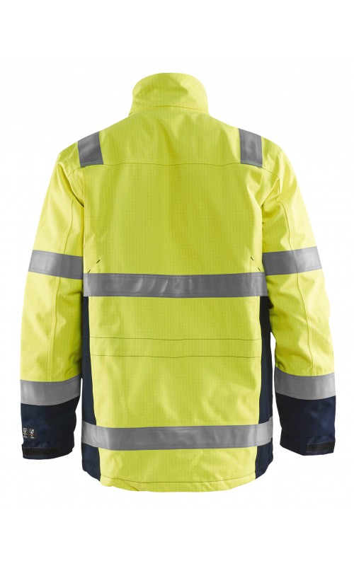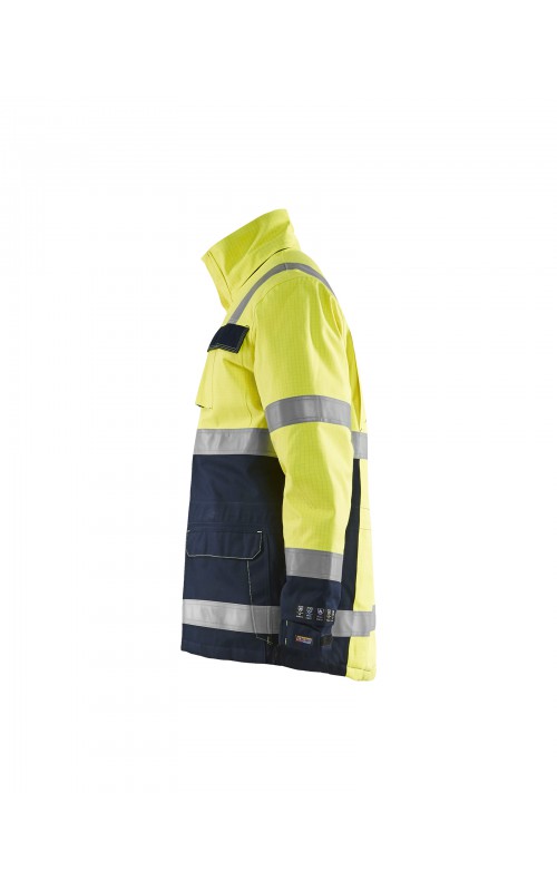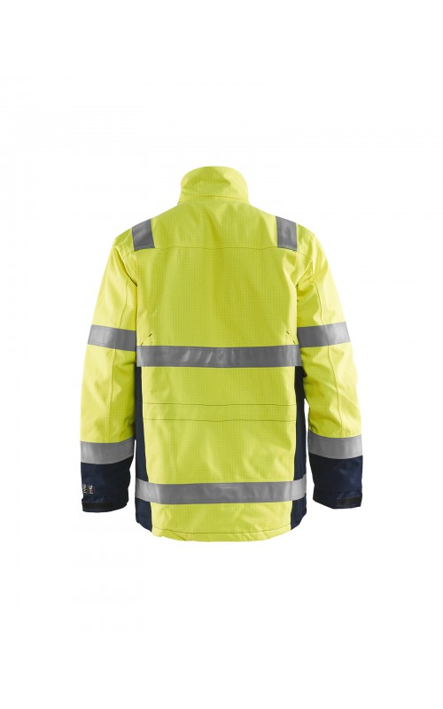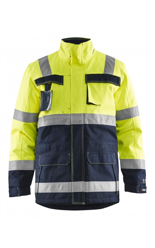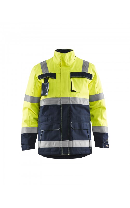 Multinorm winterparka ontworpen voor optimale signalisatie. Afneembare capuchon welke apart te bestellen is. Borstzak. Houder voor identiteitskaart. Binnenzak met telefoonzakje. Verborgen ritssluiting. Donkere stof op plaatsen die extra vuil kunnen worden. 50 mm reflecterende banden. Gecertificeerd volgens EN 471, klasse 3, EN 1149-5, EN 61482-1-2 Klasse1), ISO 11611 Klasse 1, A1), ISO 11612 (A1, B1, C1), EN13034 type 6, EN 342, EN 343.