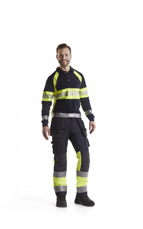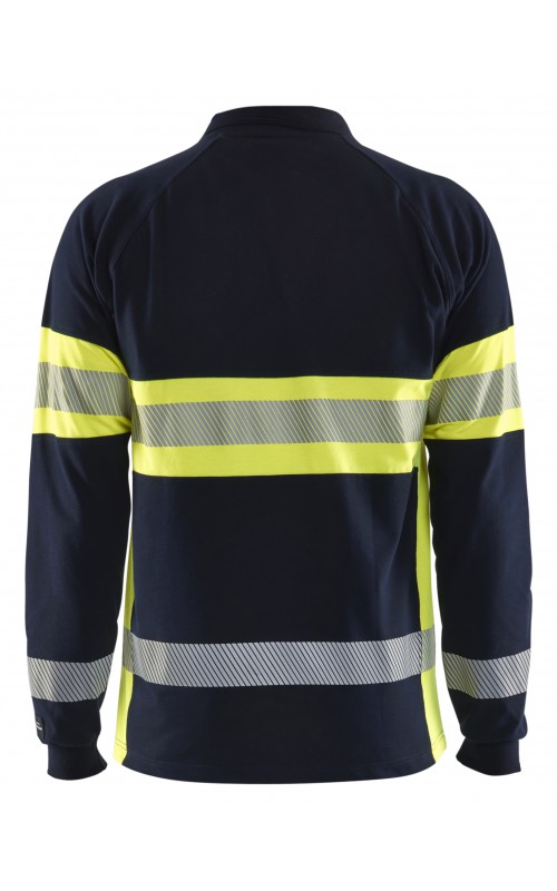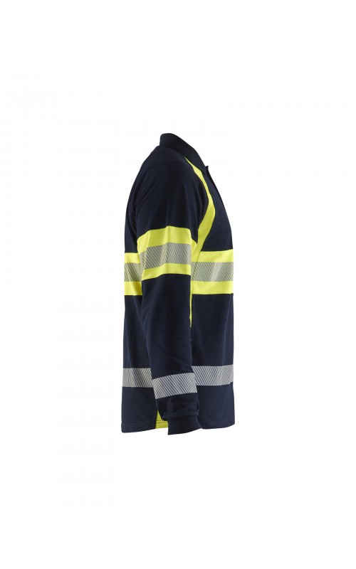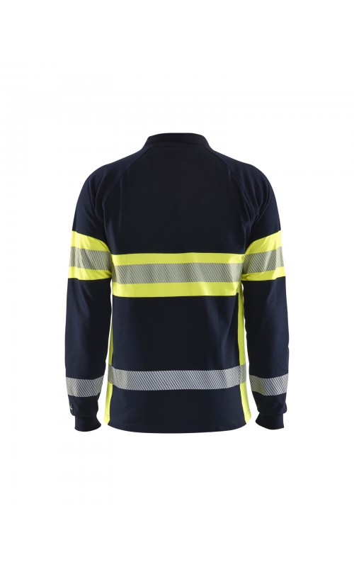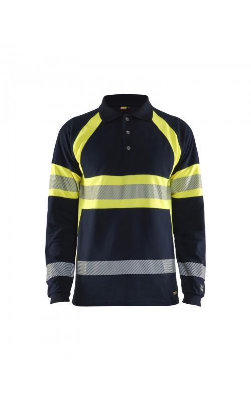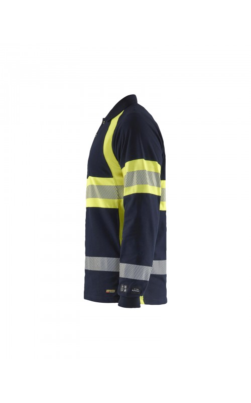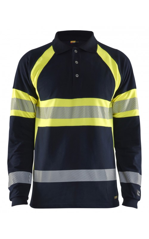 Vlamvertragend High Vis poloshirt met lange mouwen en gesneden transferreflectie. Rib gebreide boord en versterkte nek- en schoudernaden. Gecertificeerd volgens EN ISO 20471 klasse 1, verhoogde zichtbaarheid. Vlamvertragend, elektrische boog en anti-statisch gecertificeerd volgens EN 1149-5, EN ISO 11612 A1, B1, C1, IEC 61482-2 klasse 1. ATPV: 6,3 cal / cm², HAF: 73,0%.