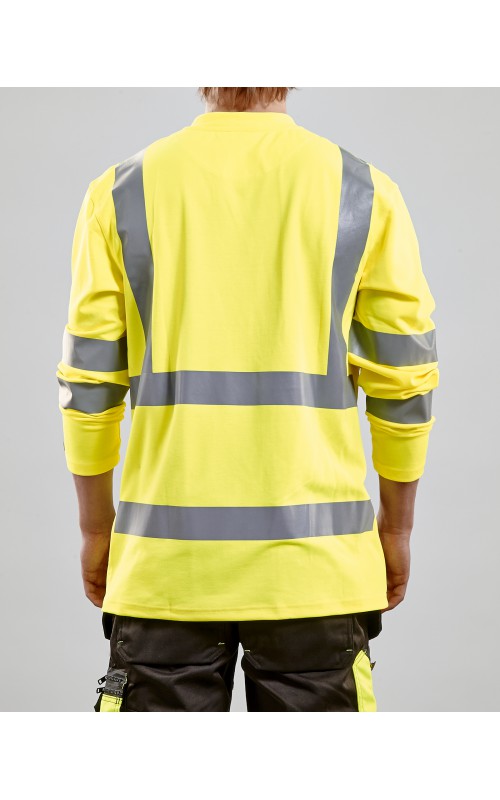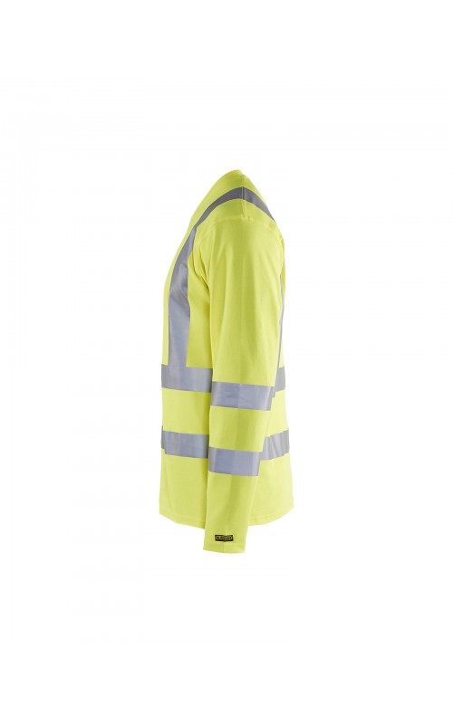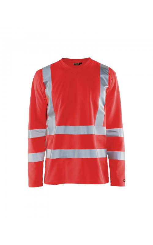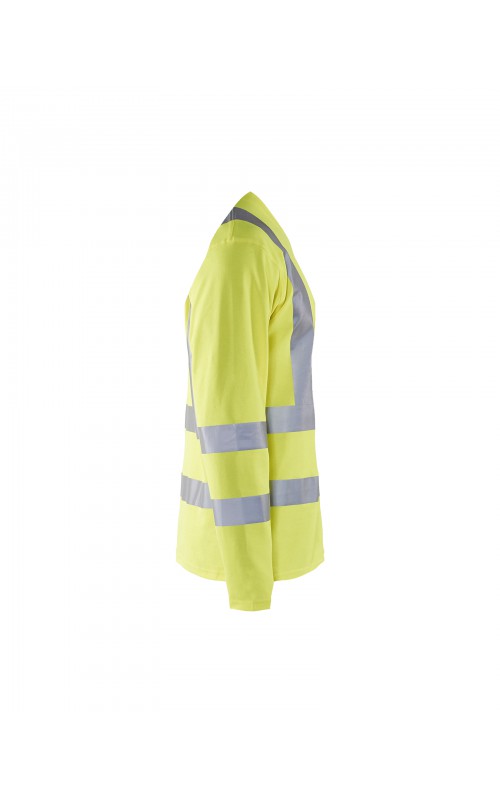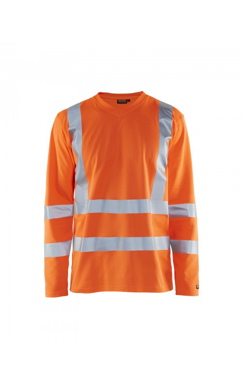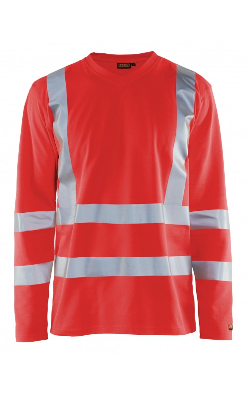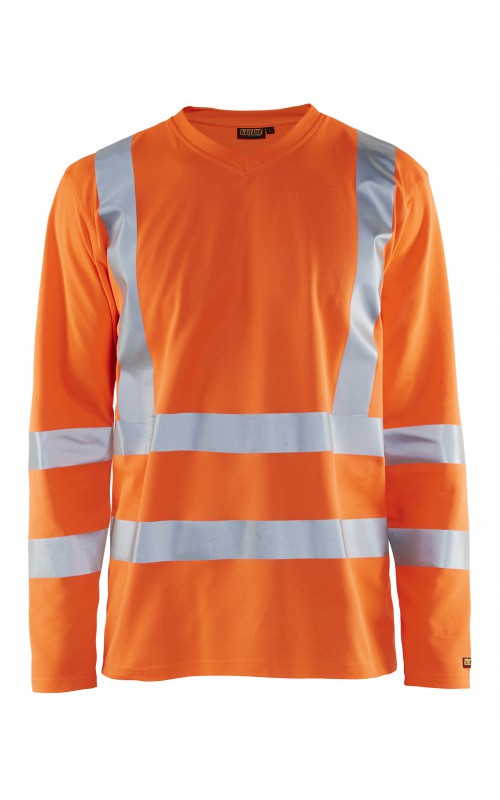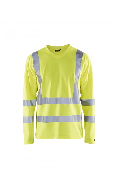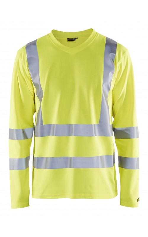 High Vis T-shirt lange mouw met V-hals in een nieuw en comfortabel materiaal. Het kledingstuk heeft katoen aan de binnenkant en synthetische materialen aan de buitenkant wat zorgt voor een hoge mate van comfort. De stof neutraliseert geuren en beschermt tegen UV-stralen. De reflectie is rekbaar waardoor het kledingstuk extra elastisch en comfortabel is om in te werken. EN gecertificeerd voor zowel UV als High-Visibility EN13758-2 en EN ISO 20471, klasse 3.