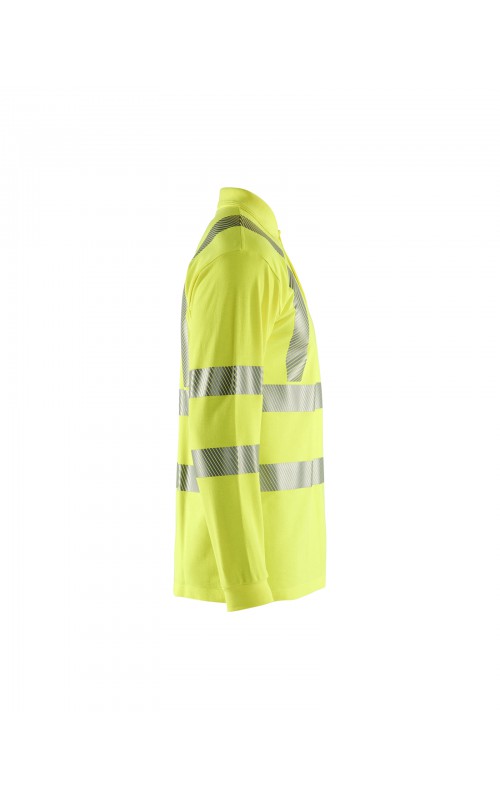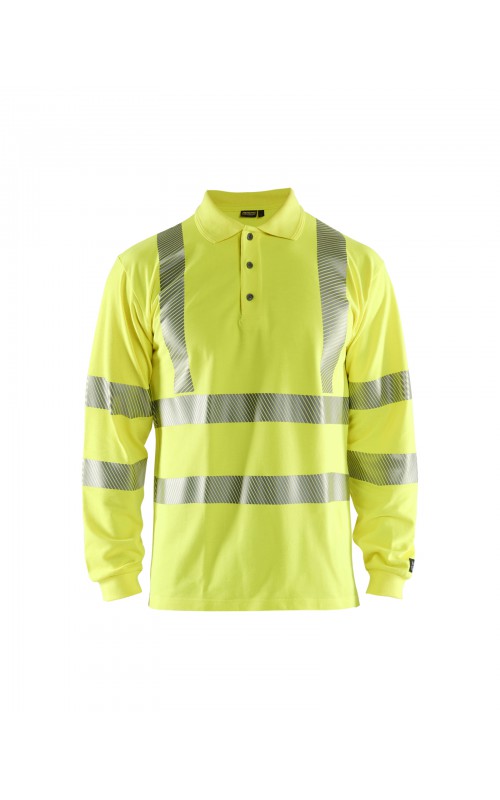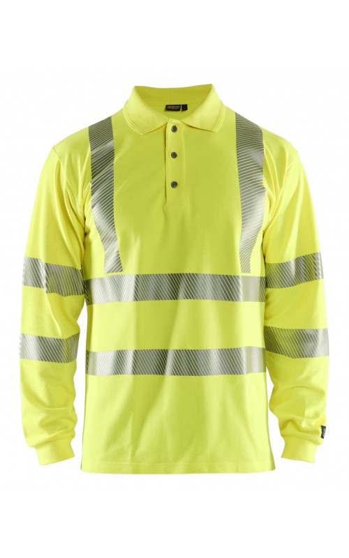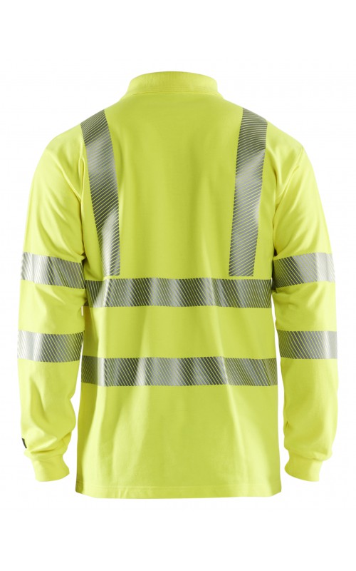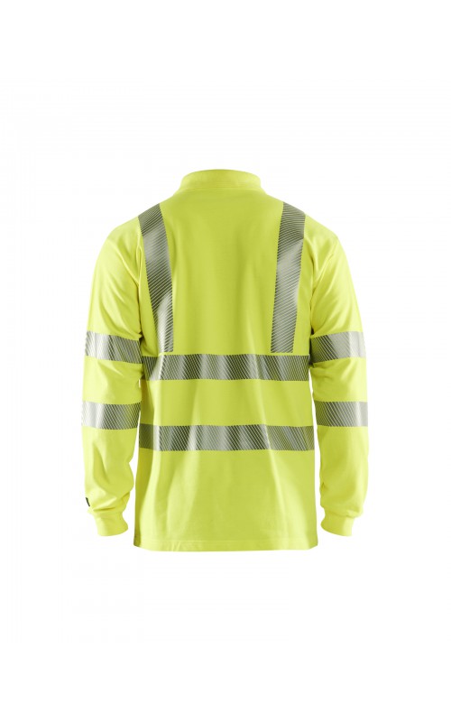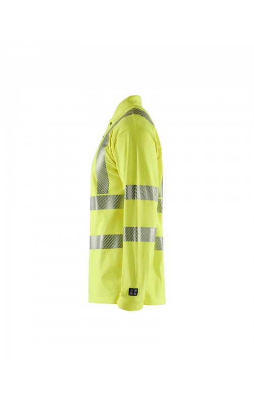 Vlamvertragend High Vis poloshirt met lange mouwen en gesneden transferreflectie. Ribboord en versterkte nek- en schoudernaden. Gecertificeerd volgens EN ISO 20471 klasse 3, verhoogde zichtbaarheid. Vlamvertragend, elektrische boog en anti-statisch gecertificeerd volgens EN 1149-5, EN ISO 11612 A1, B1, C1, IEC 61482-2 klasse 1. ATPV: 6,3 cal/cm², HAF: 73,0%.