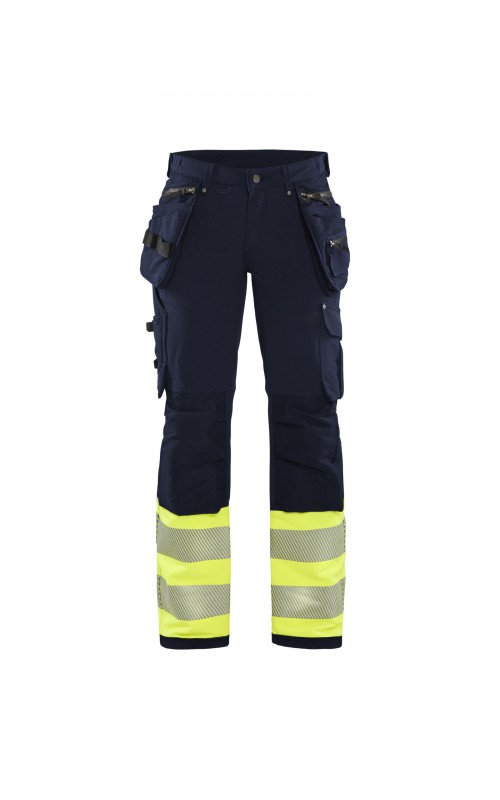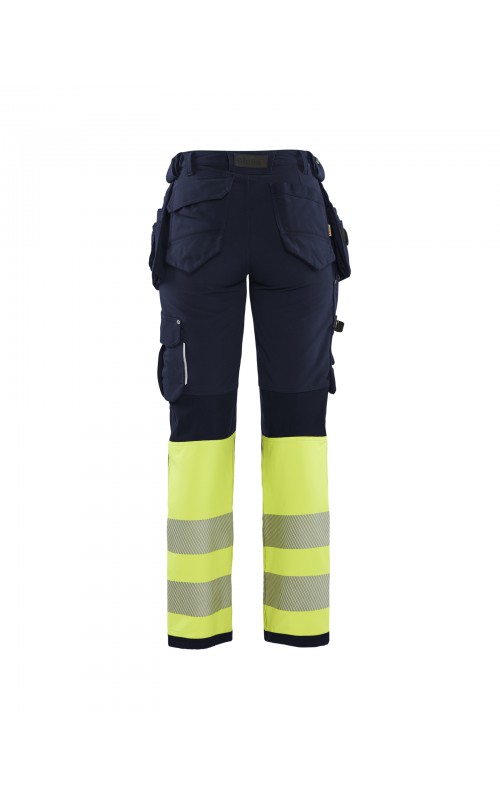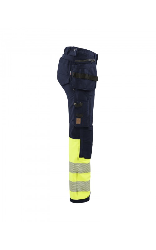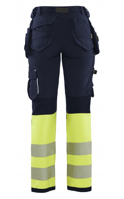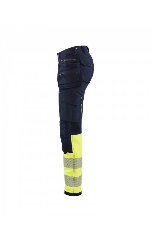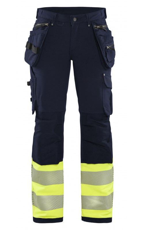 Ontworpen voor het vrouwelijke figuur, deze veelzijdige en comfortabele High Vis werkbroek biedt bewegingsvrijheid en is extreem zacht. Kan eenvoudig zware taken aan zonder in te leveren op comfort en pasvorm. De soepele 4-weg stretchstof is sterk en geeft mee in alle richtingen. De broek heeft geavanceerde details en praktische zakken met CORDURA®-versterking, een dijbeenzak met rits, een duimstokzak, voorzakken, achterzakken met klep en functionele gereedschapshouders, zoals bijvoorbeeld lussen om hamers in te steken. De kniezakken zijn versterkt met CORDURA® stretchstof aan de buitenkant en stretchstof aan de binnenkant voor meer bewegingsvrijheid. Zachte, elastische mesh-stof in de knieholte voor goede ventilatie. CORDURA®-versterking op de zoom van de broekspijp biedt effectieve bescherming tegen slijtage. Gecertificeerd volgens de EN ISO 20471-norm, klasse 1, goed zichtbare beschermende kleding.