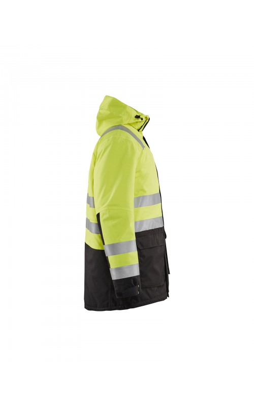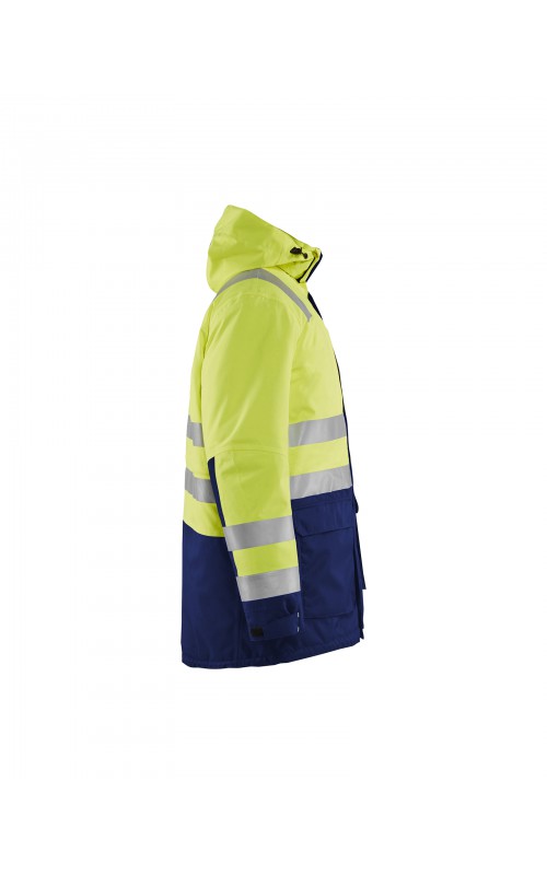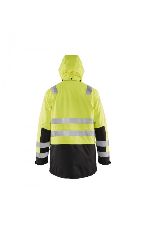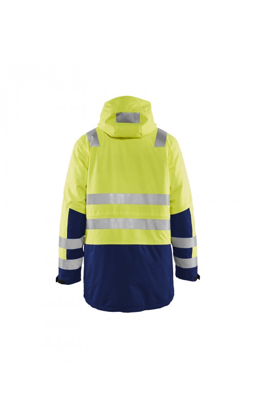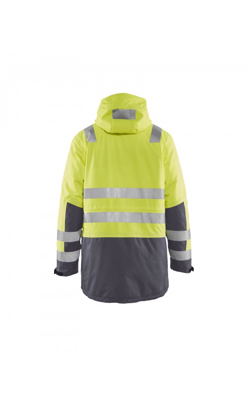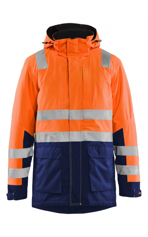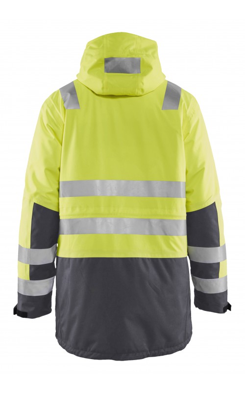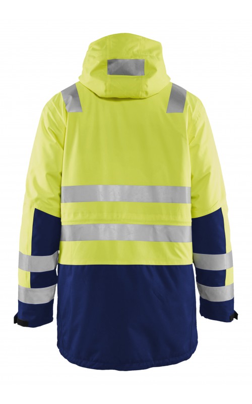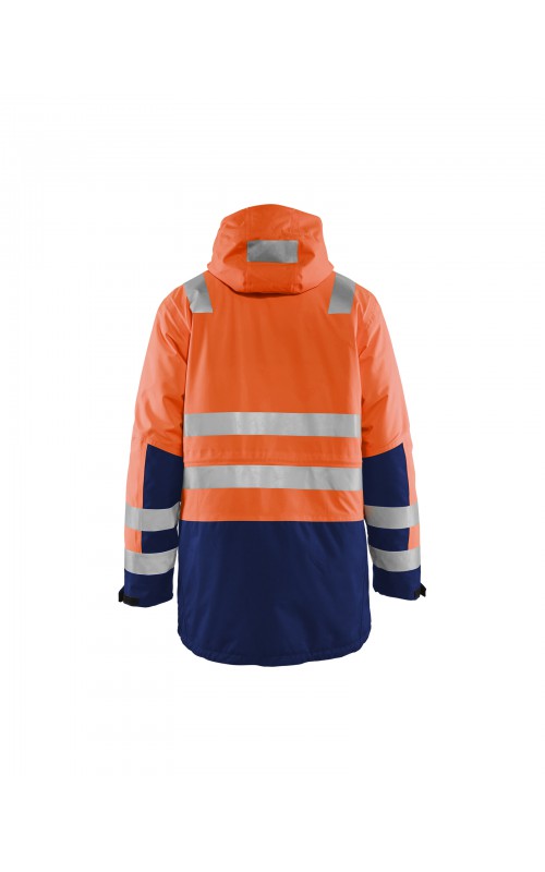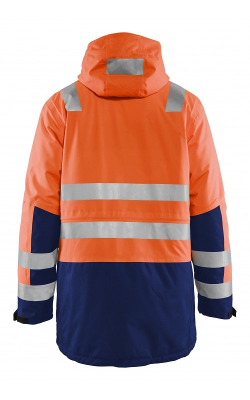 Een warm kledingstuk voor de winter voor zware werkplekken waar het belangrijk is om goed zichtbaar te zijn. De parka is gemaakt van sterk wind- en waterbestendig materiaal met getapete naden en een warme gewatteerde voering die comfortabel is en beschermt tegen kou en wind. De parka heeft een slijtvaste buitenstof in een donkerder tint waar het kledingstuk het meeste vuil verzamelt. Het jack heeft een tweewegritssluiting aan de voorkant en voorgevormde mouwen voor meer comfort. De taille kan worden aangepast met een trekkoord aan de achterkant voor een betere pasvorm. De reflectie zijn transfers voor meer flexibiliteit en de beschermende capuchon heeft drukknopen om te bevestigen of eraf te halen. Gecertificeerd volgens EN 342 in combinatie met 1885; EN 343; EN ISO 20471 Klasse 3, beschermende kleding voor hoge zichtbaarheid.