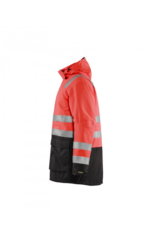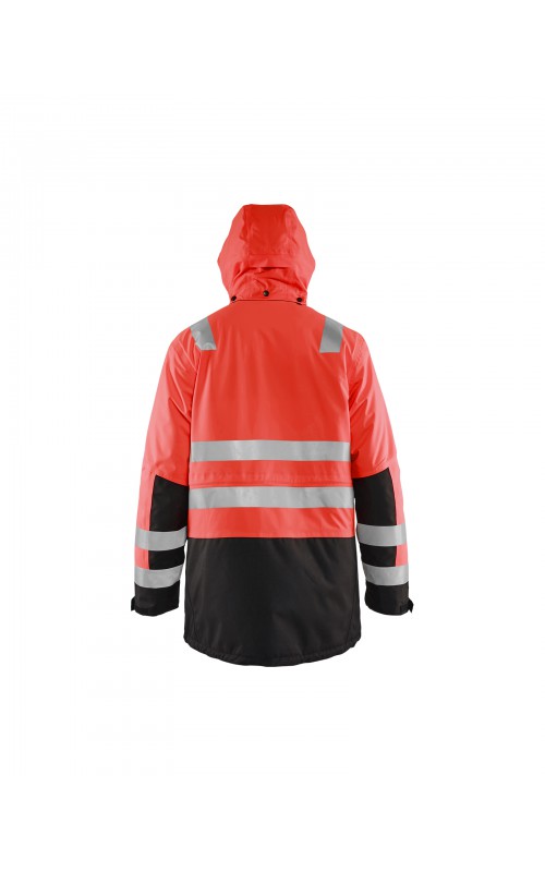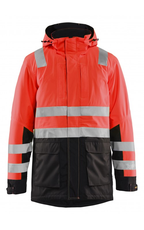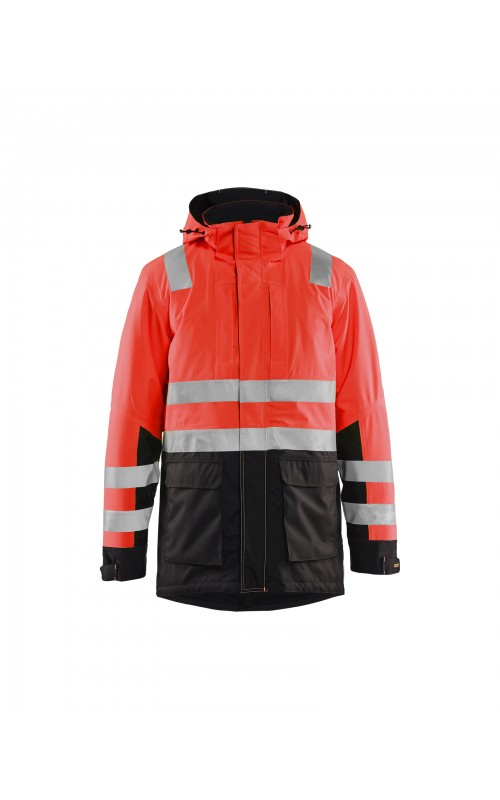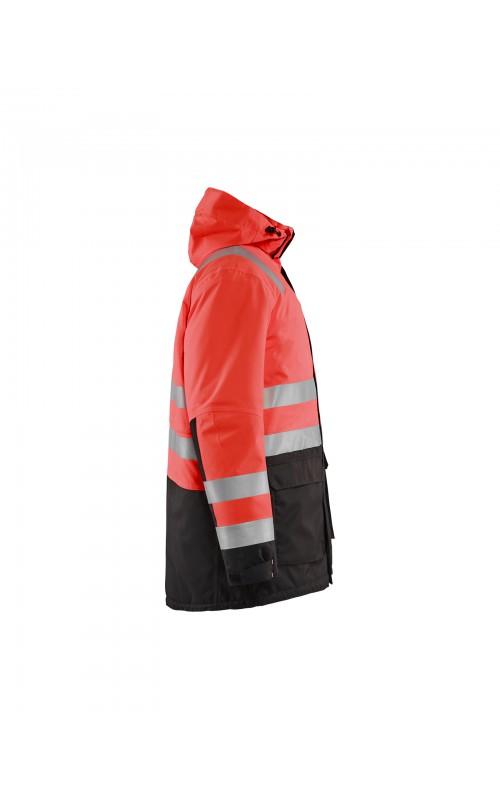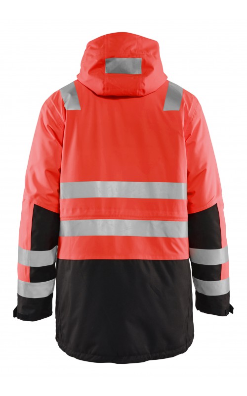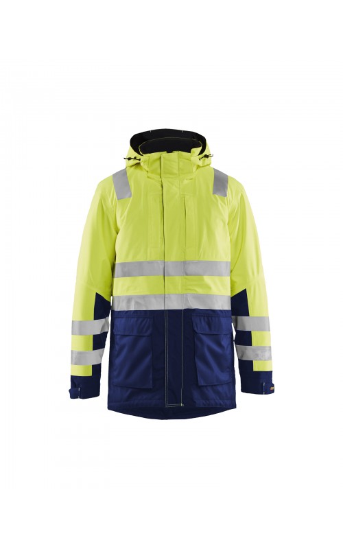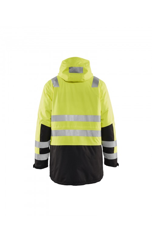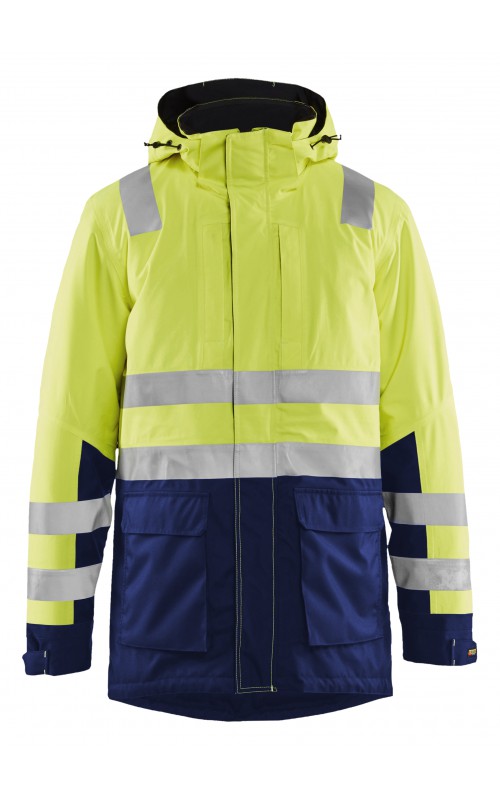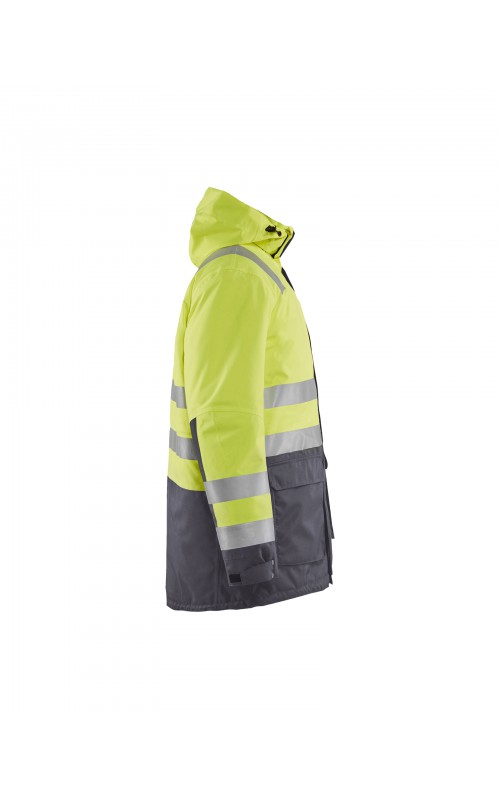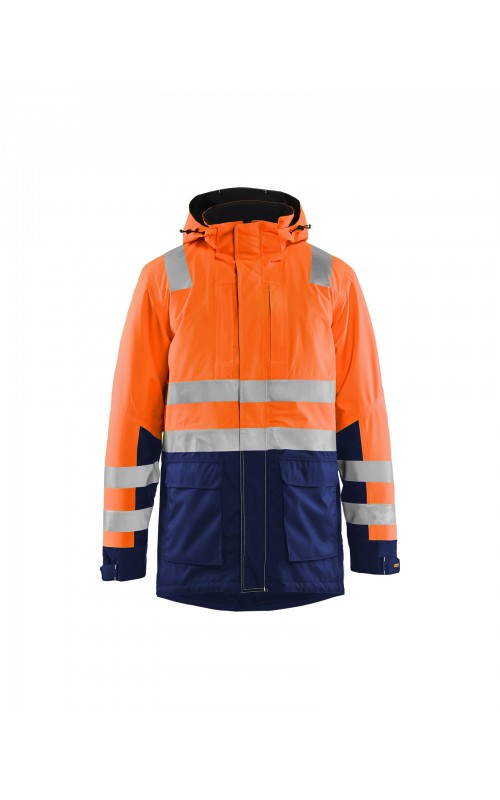Een warm kledingstuk voor de winter voor zware werkplekken waar het belangrijk is om goed zichtbaar te zijn. De parka is gemaakt van sterk wind- en waterbestendig materiaal met getapete naden en een warme gewatteerde voering die comfortabel is en beschermt tegen kou en wind. De parka heeft een slijtvaste buitenstof in een donkerder tint waar het kledingstuk het meeste vuil verzamelt. Het jack heeft een tweewegritssluiting aan de voorkant en voorgevormde mouwen voor meer comfort. De taille kan worden aangepast met een trekkoord aan de achterkant voor een betere pasvorm. De reflectie zijn transfers voor meer flexibiliteit en de beschermende capuchon heeft drukknopen om te bevestigen of eraf te halen. Gecertificeerd volgens EN 342 in combinatie met 1885; EN 343; EN ISO 20471 Klasse 3, beschermende kleding voor hoge zichtbaarheid.