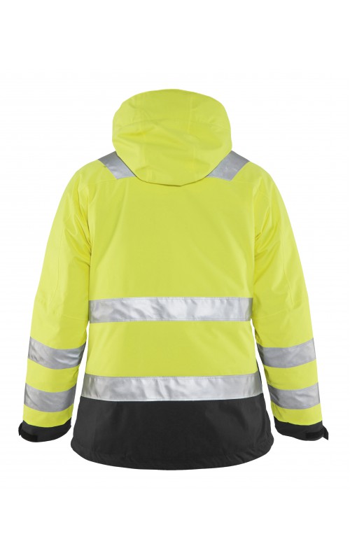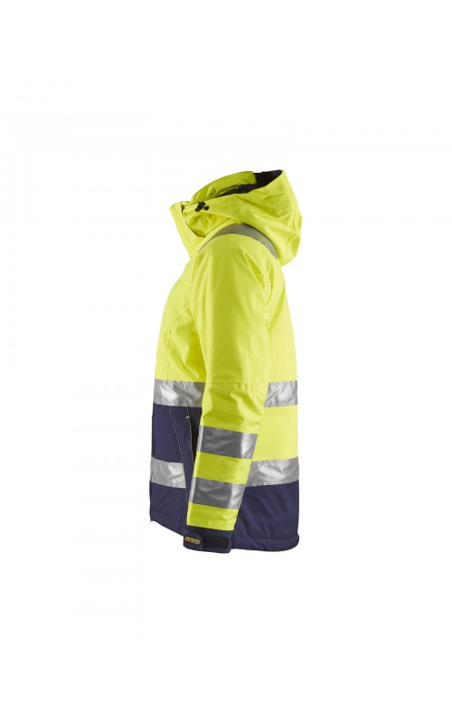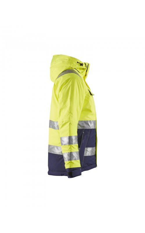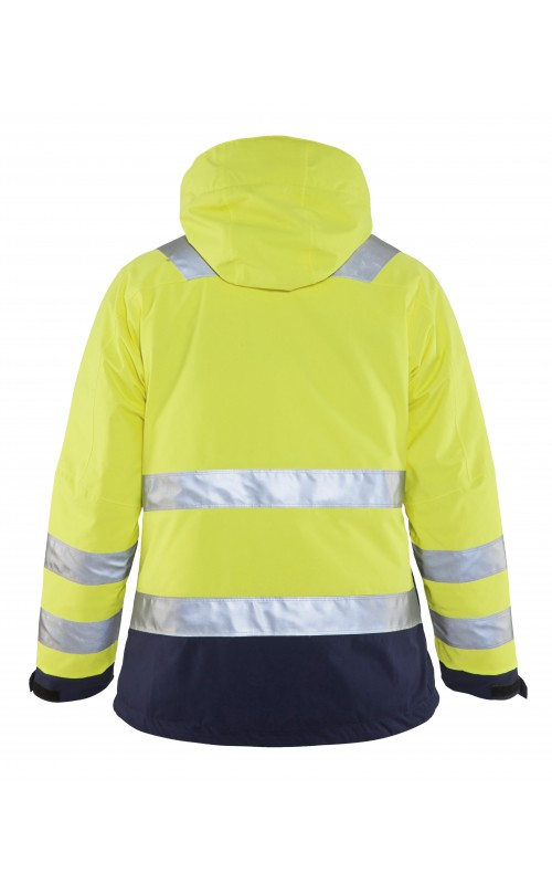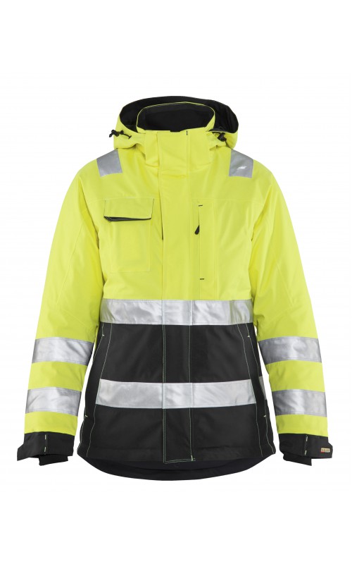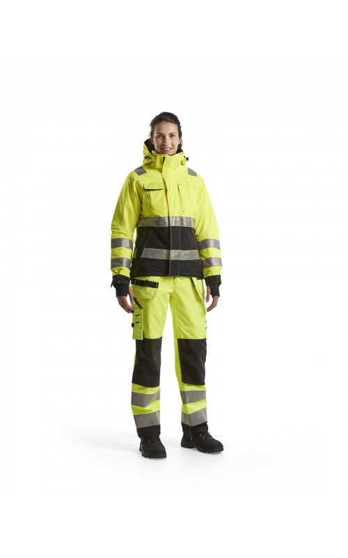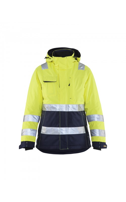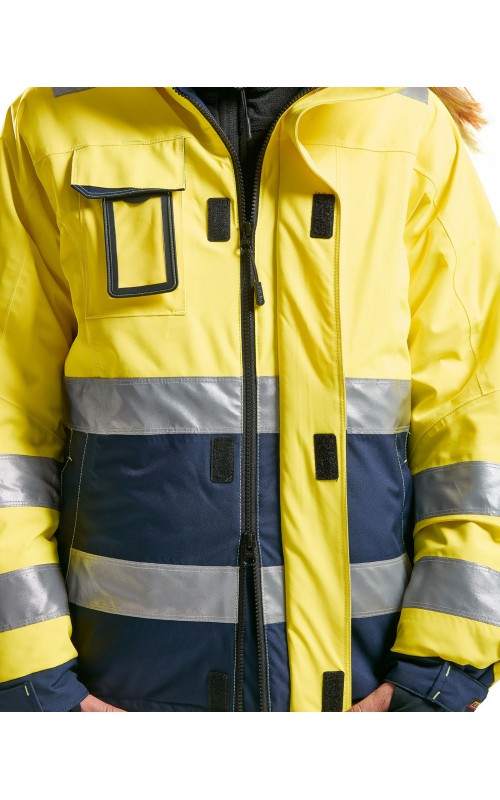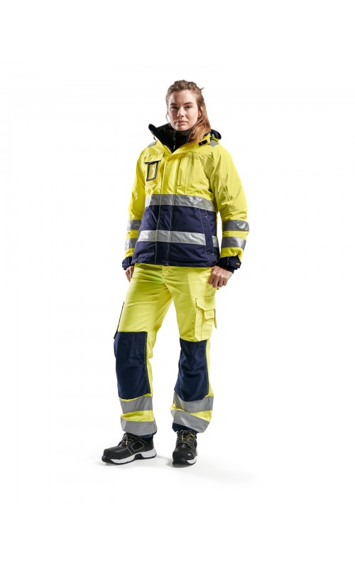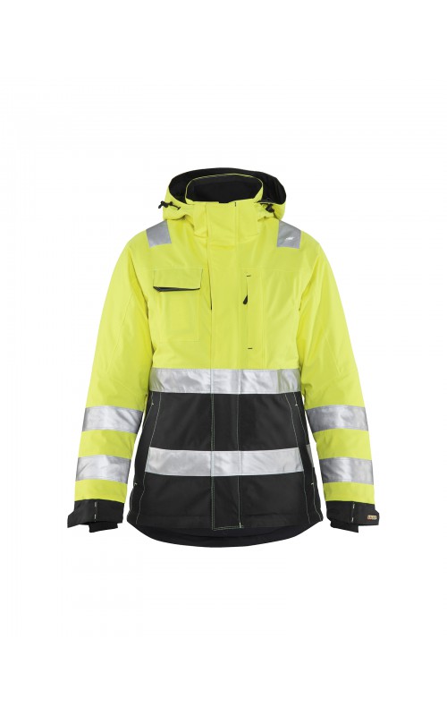 Warme High Vis winterjas speciaal voor vrouwen ontworpen. De jas heeft een gewatteerde voering en een slijtvast, wind- en waterdicht buitenmateriaal met getapete naden, evenals donkere kleurvlakken, waar het kledingstuk het meest blootgesteld is aan vuil. Voor meer bewegingsvrijheid, is de jas voorzien van een twee-weg rits, voorgevormde mouwen en verlengd rugpand. Voorzien van 50 mm breed reflectie voor verhoogde zichtbaarheid. Gecertificeerd volgens EN 342, EN 343, EN ISO 20471, klasse 2.