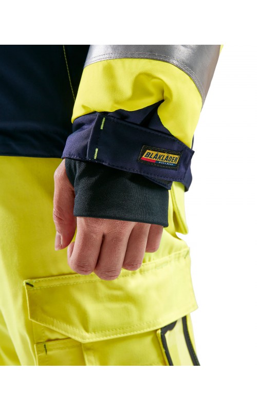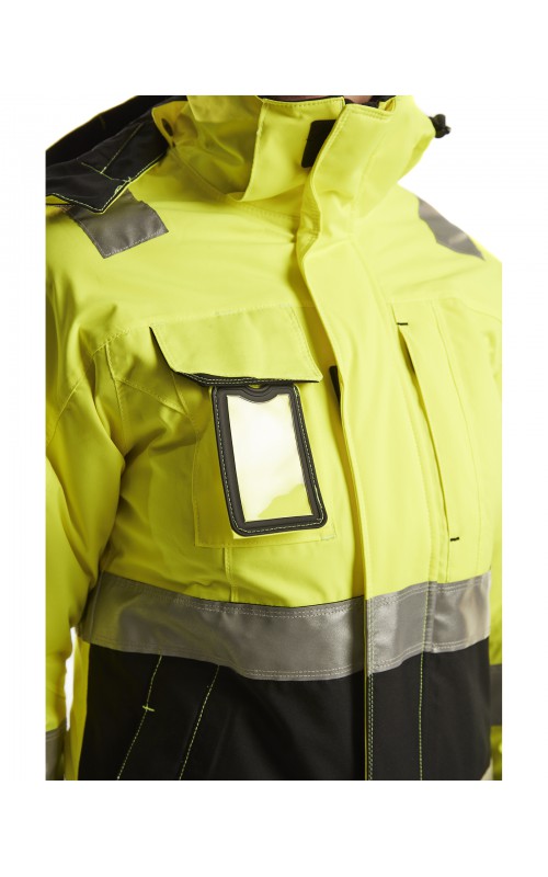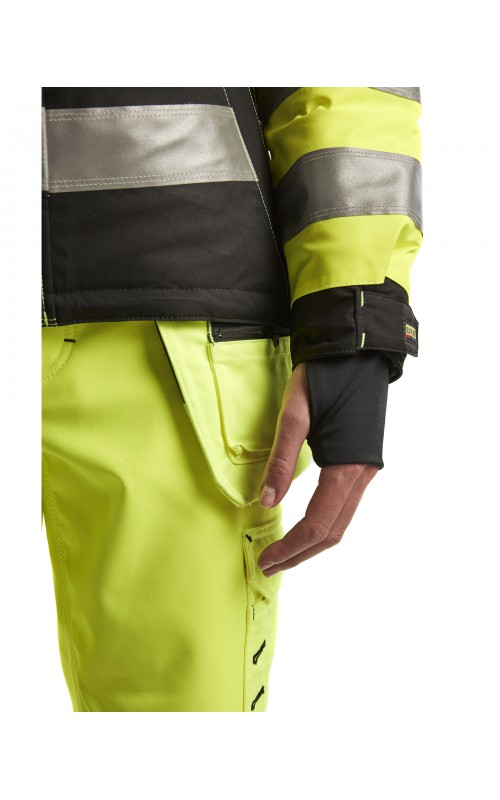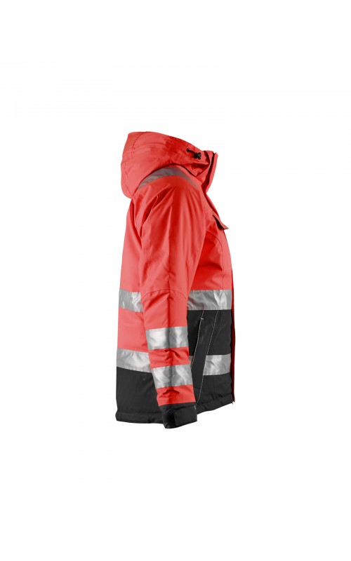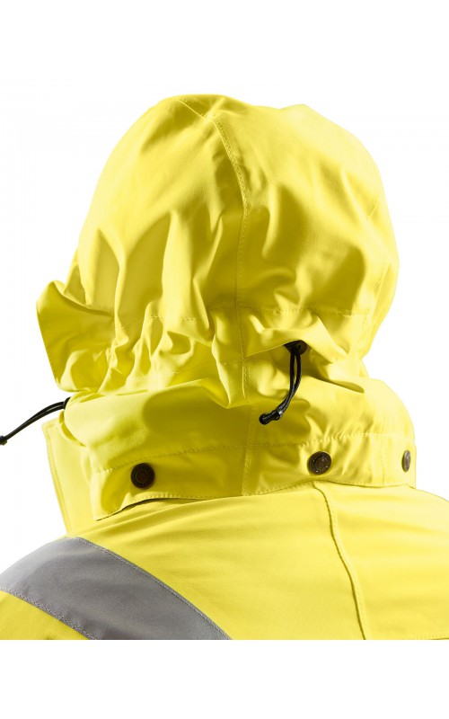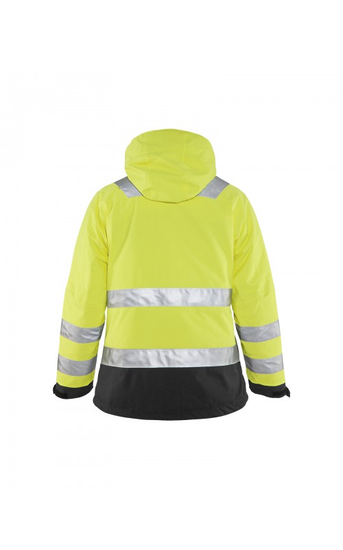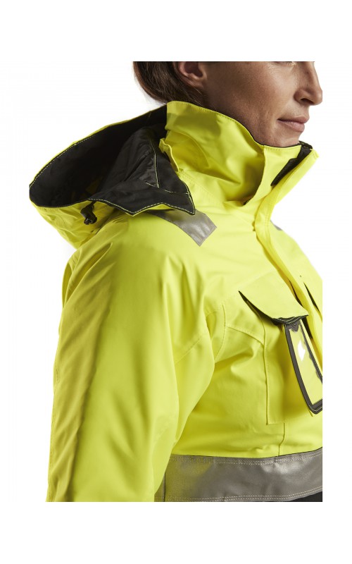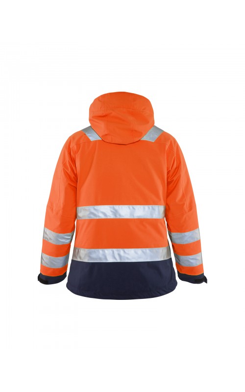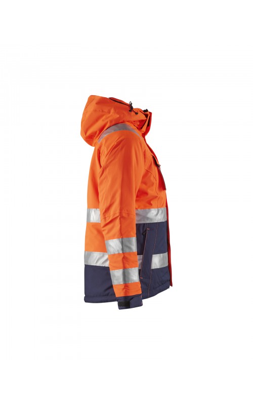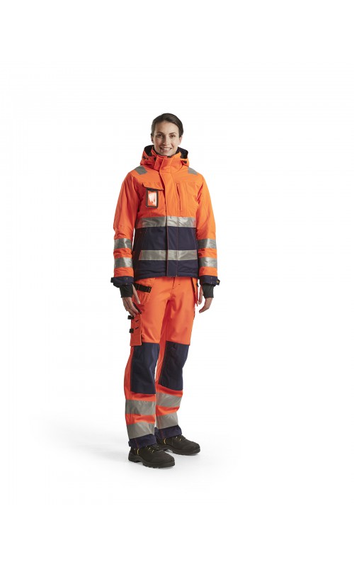 Warme High Vis winterjas speciaal voor vrouwen ontworpen. De jas heeft een gewatteerde voering en een slijtvast, wind- en waterdicht buitenmateriaal met getapete naden, evenals donkere kleurvlakken, waar het kledingstuk het meest blootgesteld is aan vuil. Voor meer bewegingsvrijheid, is de jas voorzien van een twee-weg rits, voorgevormde mouwen en verlengd rugpand. Voorzien van 50 mm breed reflectie voor verhoogde zichtbaarheid. Gecertificeerd volgens EN 342, EN 343, EN ISO 20471, klasse 2.