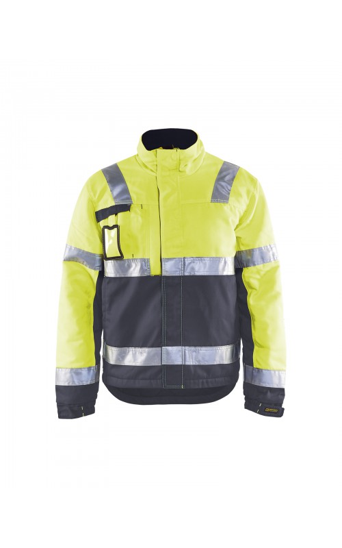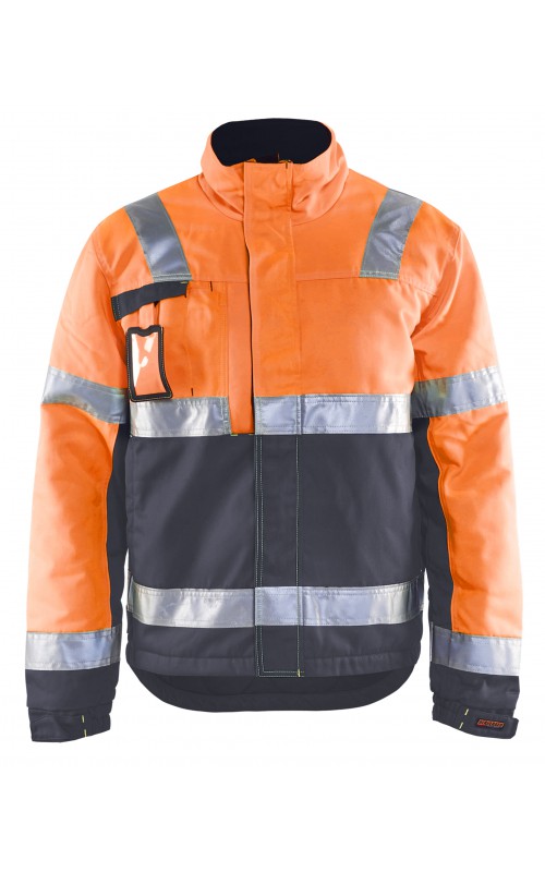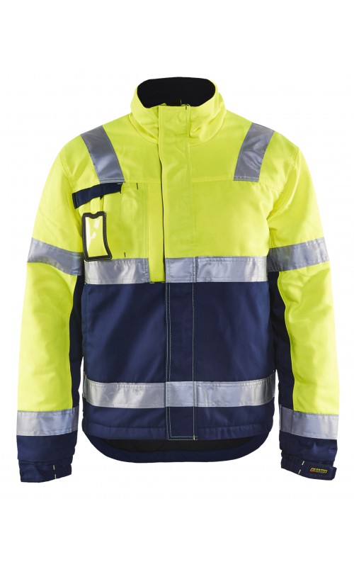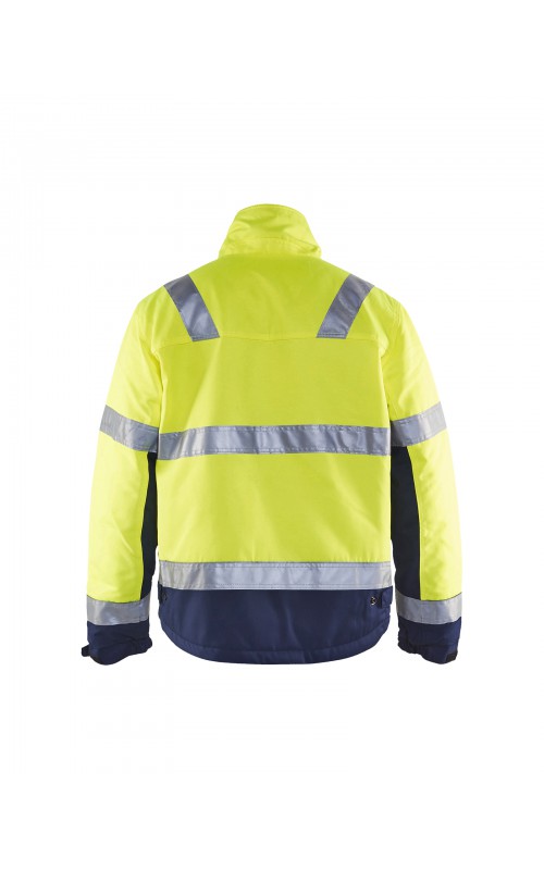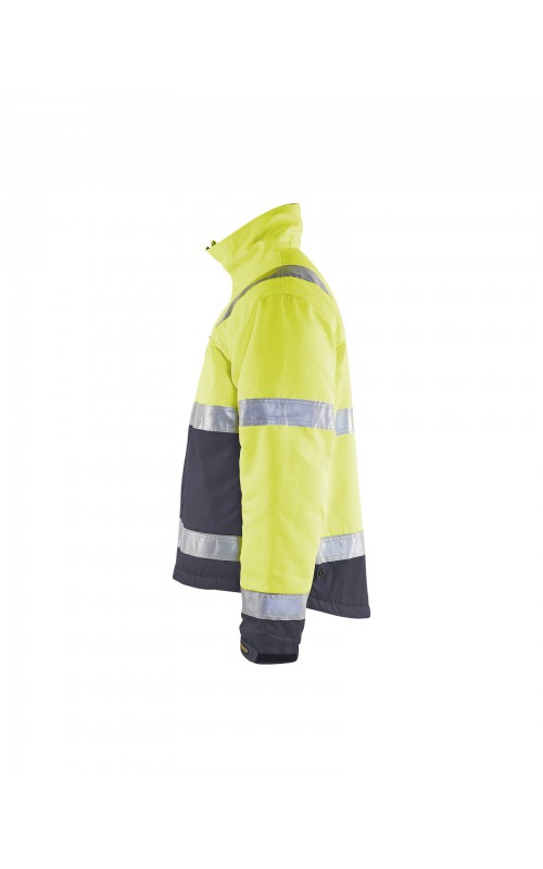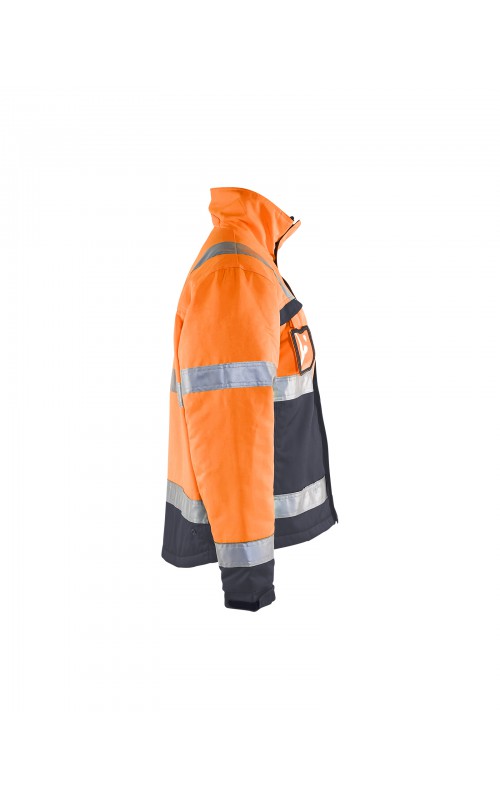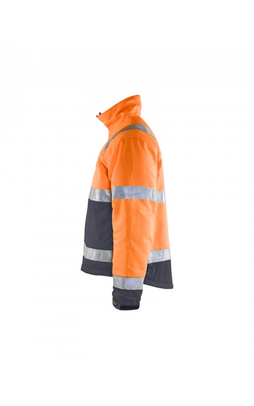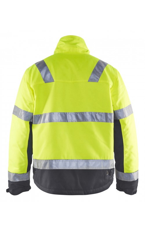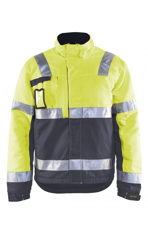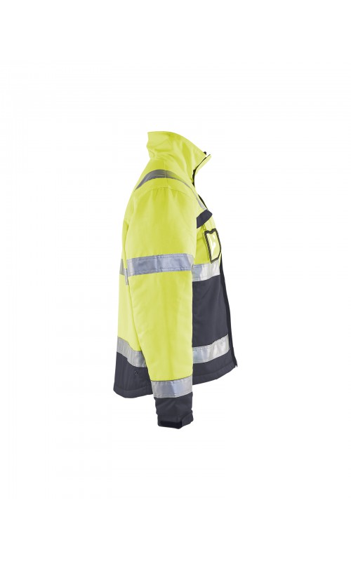 High Vis winterjas met quiltvoering van duurzaam water- en vuilafstotend materiaal met donkere kleur op delen die snel vuil worden. De jas heeft ruime en functionele zakken en een afneembare ID-kaarthouder. De onderkant van de jas is verstelbaar en het verlengde rugpand beschermt uw rug tegen de kou. Gecertificeerd volgens EN ISO 20471 S-L klasse 2, XL-4XL klasse 3 en EN 342, bescherming tegen koude weersomstandigheden.