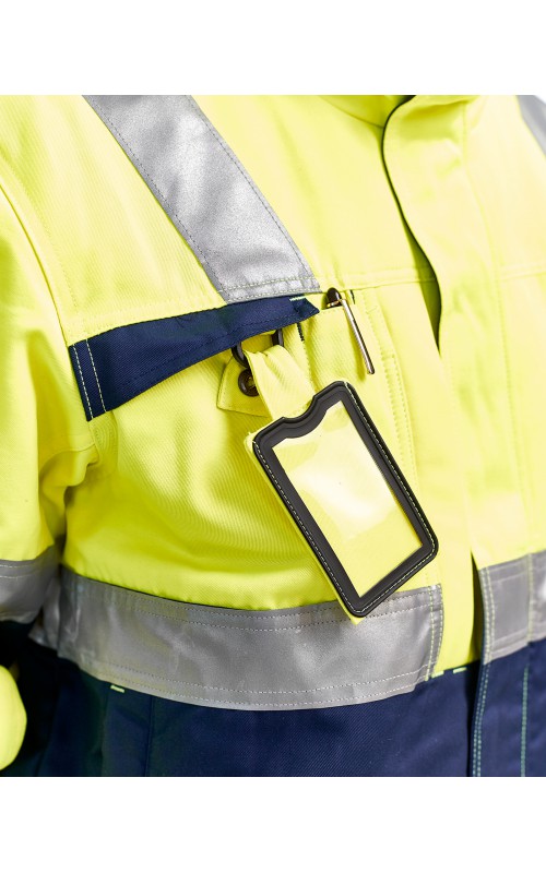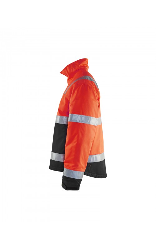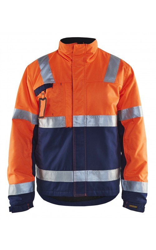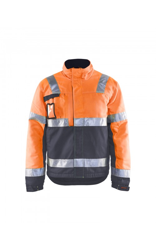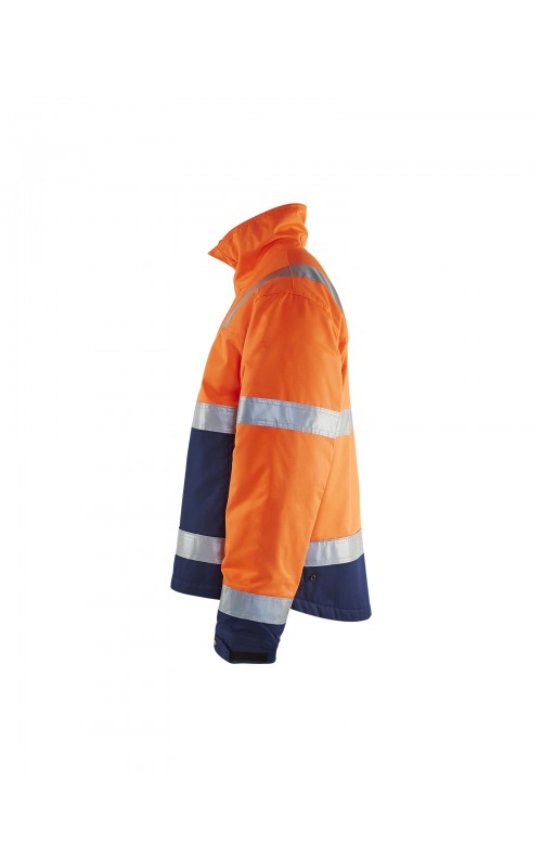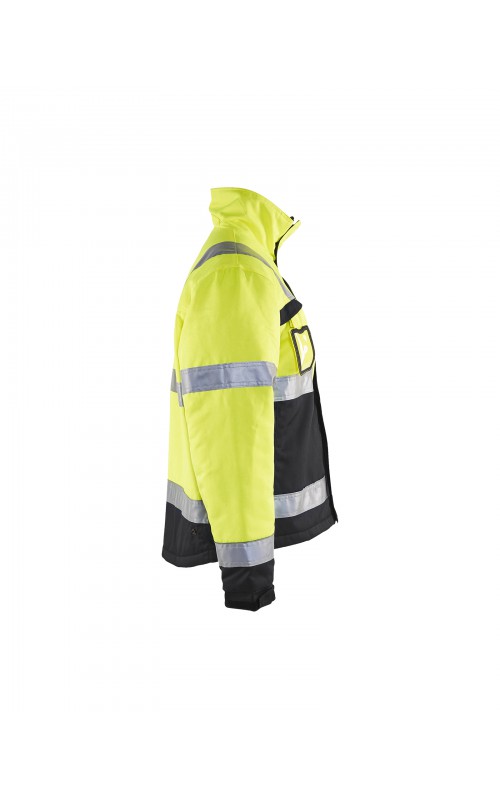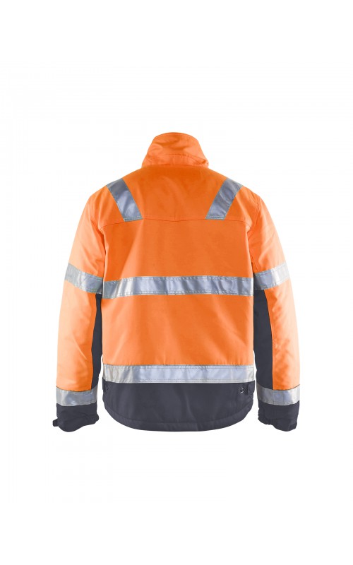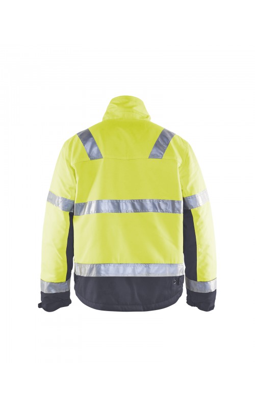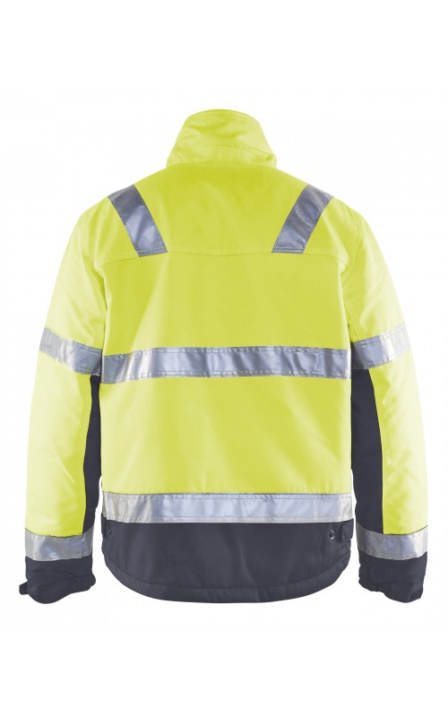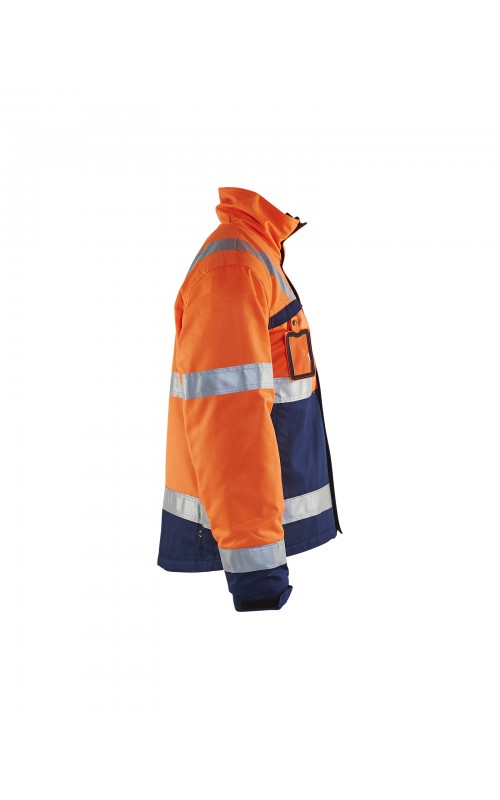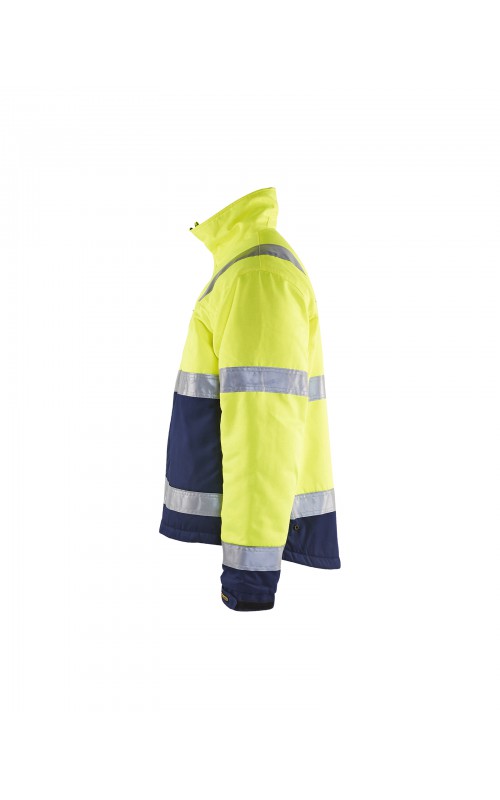 High Vis winterjas met quiltvoering van duurzaam water- en vuilafstotend materiaal met donkere kleur op delen die snel vuil worden. De jas heeft ruime en functionele zakken en een afneembare ID-kaarthouder. De onderkant van de jas is verstelbaar en het verlengde rugpand beschermt uw rug tegen de kou. Gecertificeerd volgens EN ISO 20471 S-L klasse 2, XL-4XL klasse 3 en EN 342, bescherming tegen koude weersomstandigheden.