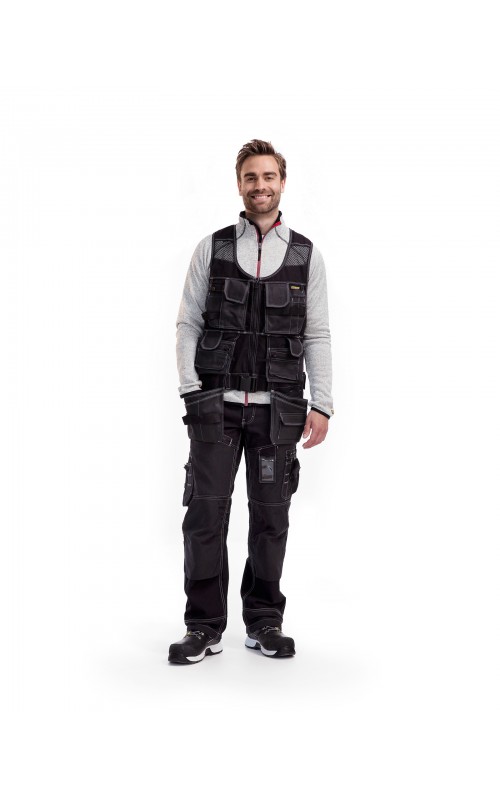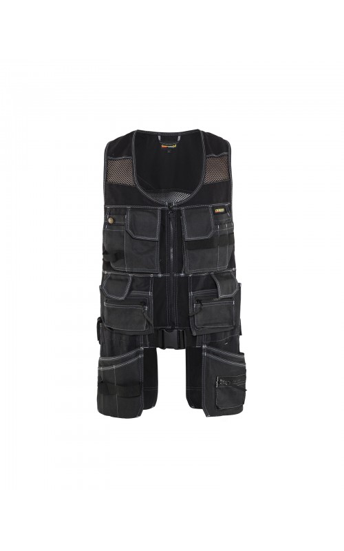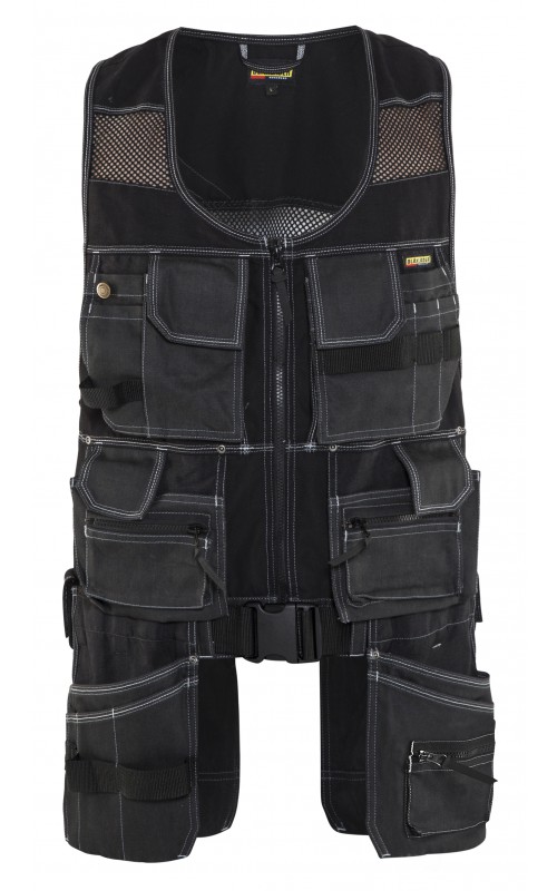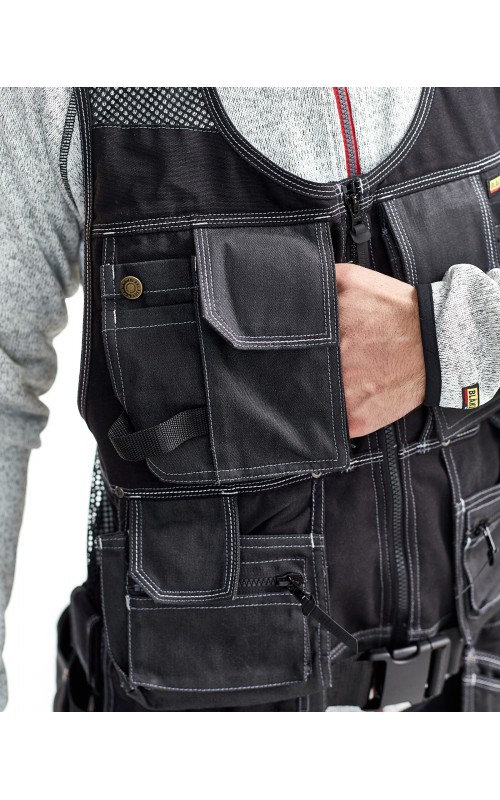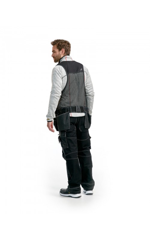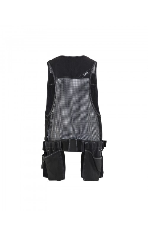 Modern werkvest met veel praktische zakken voor gereedschap en accessoires. Afneembare spijkerzakken en tailleband om schouder- en nekklachten te verminderen. Het vest heeft zelfs dubbele ritsen aan de voorzijde om de wijdte aan te passen, voor een betere pasvorm en een verhoogd comfort. Meshdelen met stretchmateriaal maken het vest licht en zorgen voor een goede ventilatie.