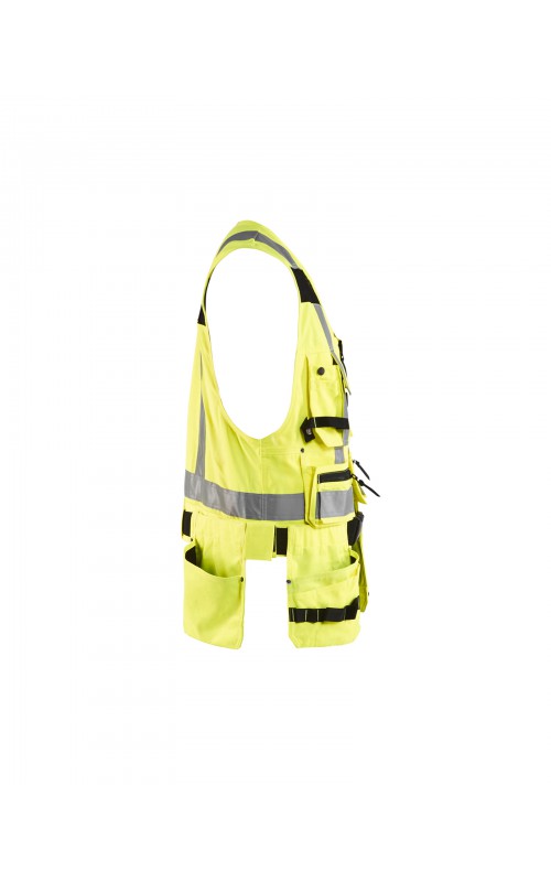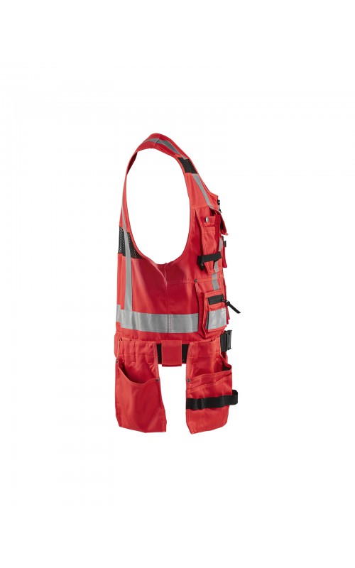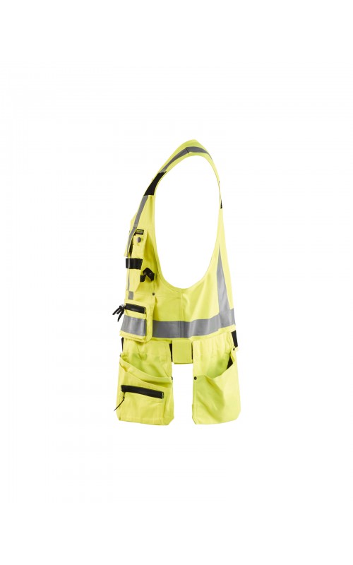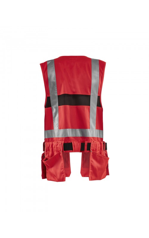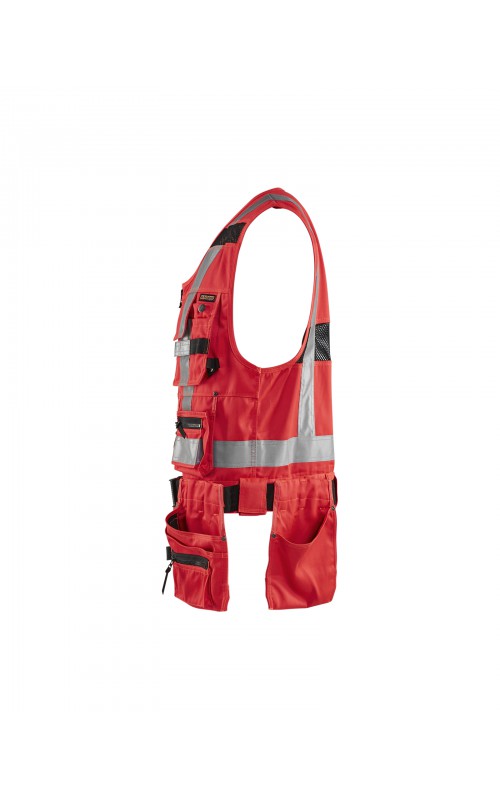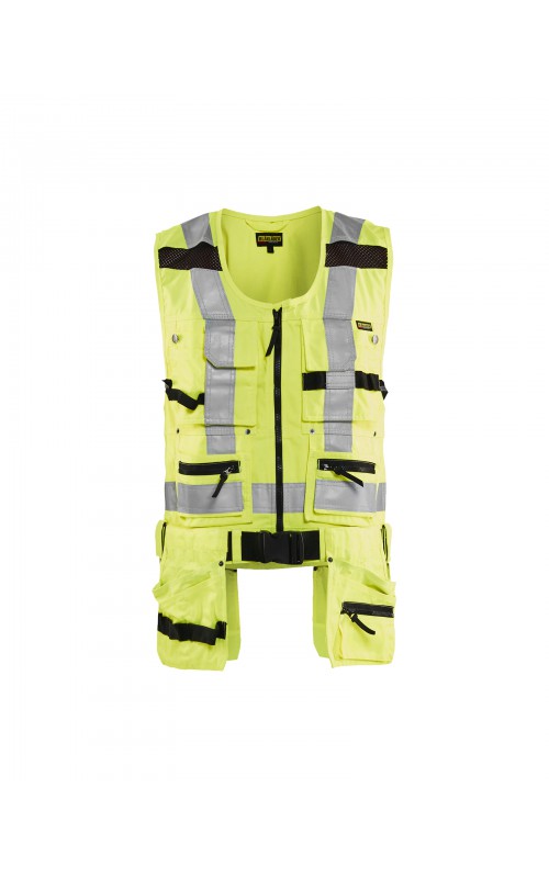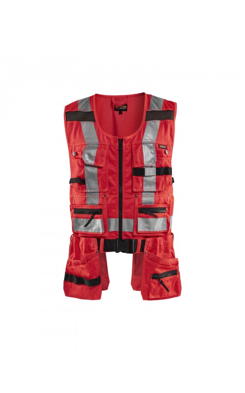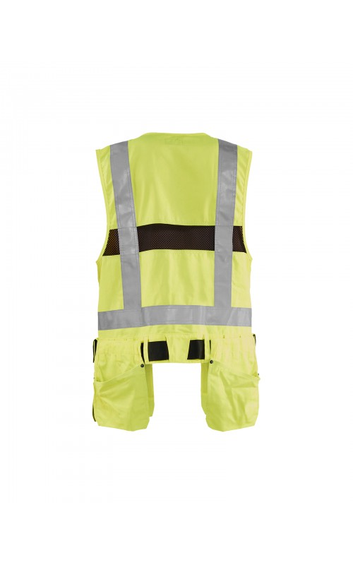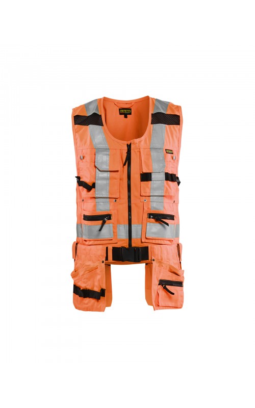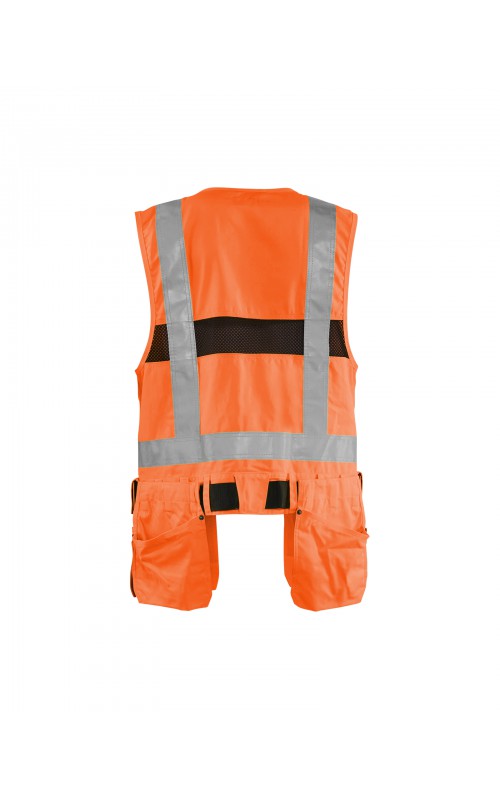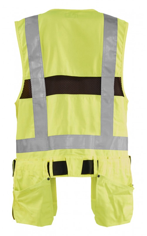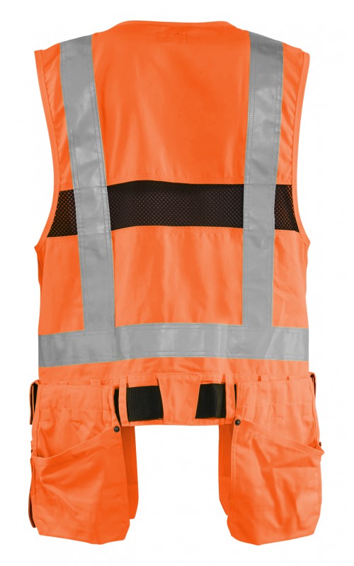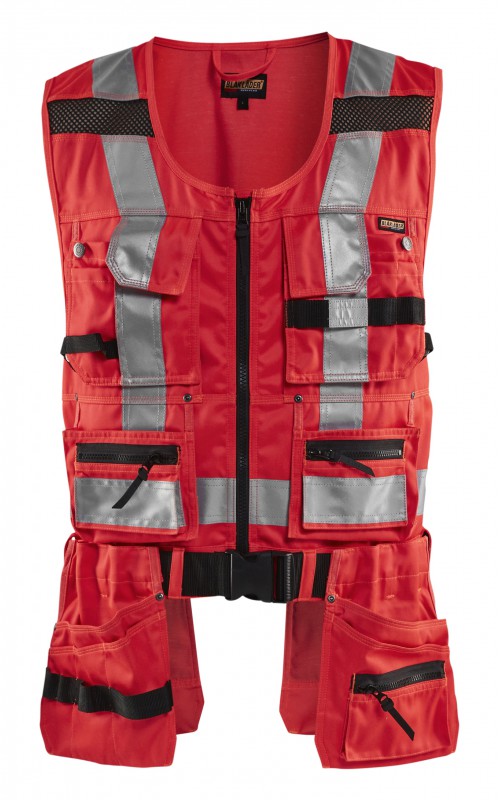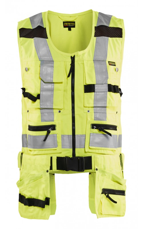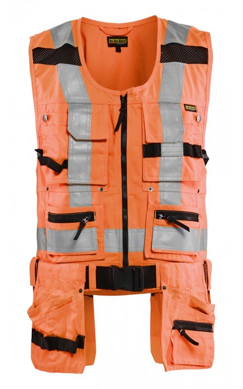 Modern werkvest met veel praktische zakken voor gereedschap en accessoires. Afneembare spijkerzakken en tailleband om schouder- en nekklachten te verminderen. Het vest heeft zelfs dubbele ritsen aan de voorzijde om de wijdte aan te passen, voor een betere pasvorm en een verhoogd comfort. Meshdelen met stretchmateriaal maken het vest licht en zorgen voor een goede ventilatie. Gecertificeerd volgens EN ISO 20471, S Klasse 1, M-4XL Klasse 2.