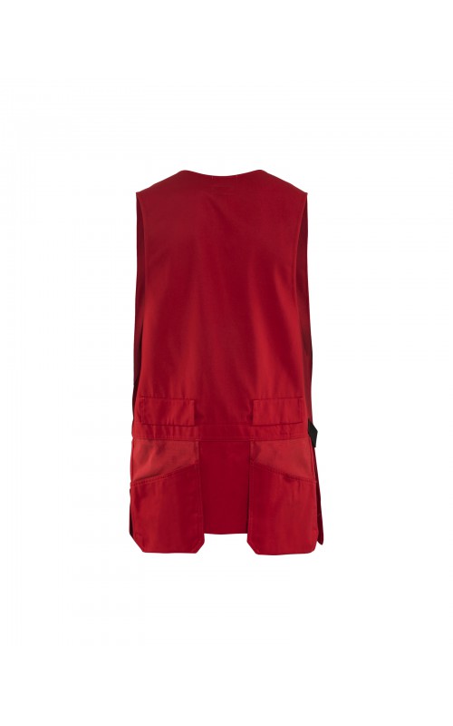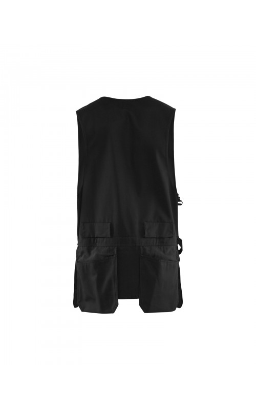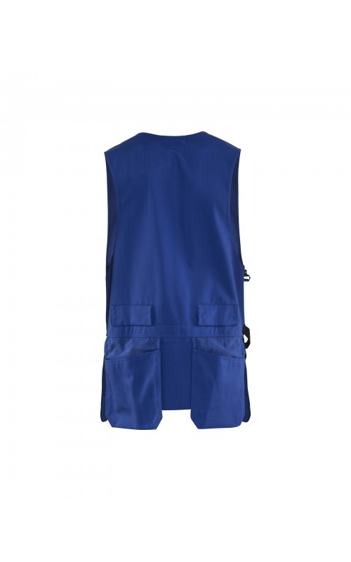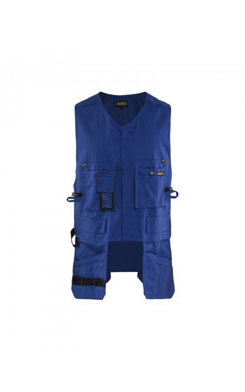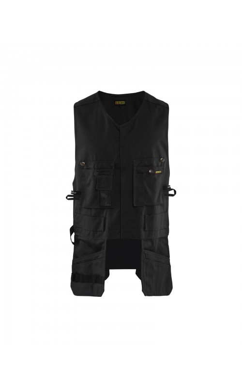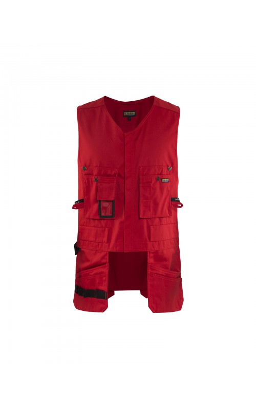 Workwear waistcoat with two loose-hanging chest pockets with safety straps, one with phone pocket, one with patent buttons and knife holder. Reinforced three part nail pockets front and back. Concealed metal zip. Extended back. ID card pocket.