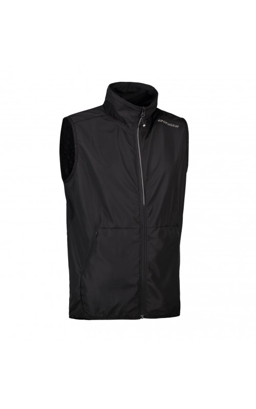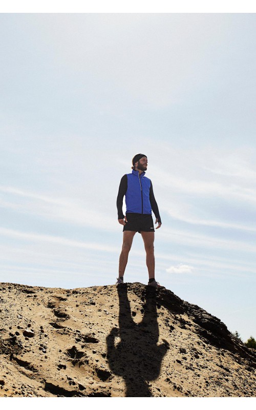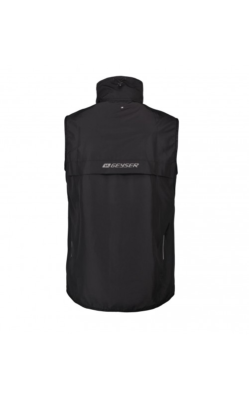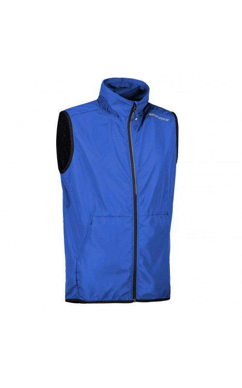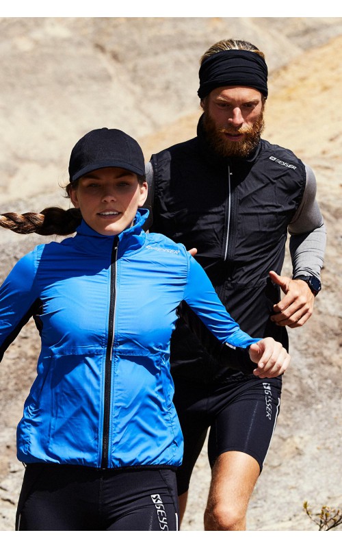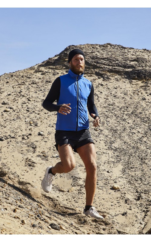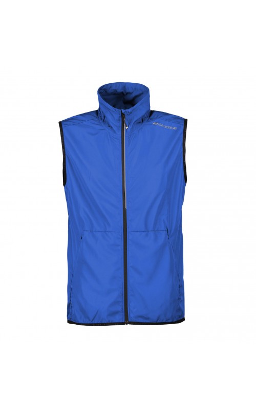 A well-fitting ultra lightweight, wind and water resistant runner's vest. Smart, high adjustable collar. Elastic band at the vest hem and armholes. Ventilation material in the sides. Ventilation opening at the back. Two practical hidden pockets on the front. Te vest has reflectors on the front and back.